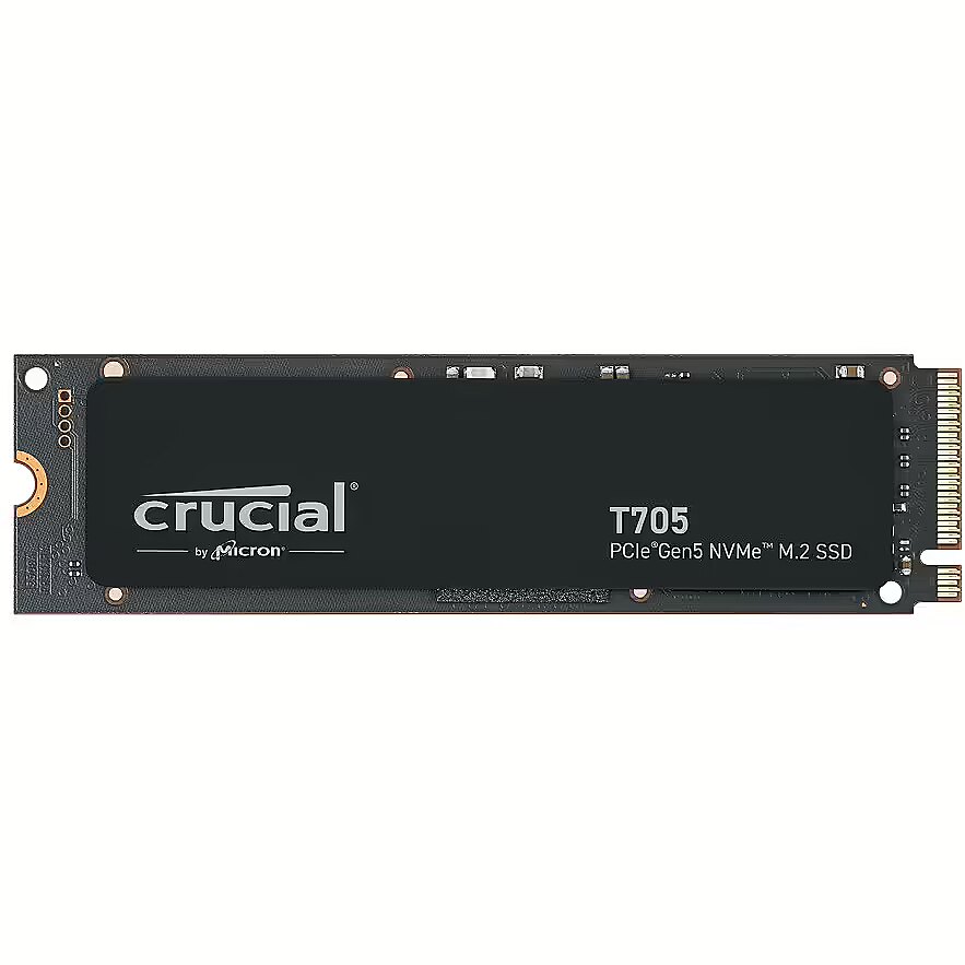 Description - Crucial T705 PCIe Gen5 NVMe SSD Hold on tightthe Crucial T705 Gen5 NVMe SSD takes Gen5 performance to the next level. Power your game, create at the speed of your ideas, and run AI applications with ease with this fully optimized Gen5 masterpiece that works with your motherboards heatsink. Blur the line between virtual and reality with maximum Gen5 performance With blazing-fast sequential reads and writes of up to 14,500/12,700 MB/s, the Crucial T705 outperforms, outshines, and outshines yesterdays fastest SSDs. The T705 maximizes Gen5 technology, delivering nearly twice the performance of Gen4 SSDs without significantly increasing power consumption. Get More Done in Less Time Get up to 40% faster performance in real-world tasks compared to Gen4 SSDs when starting Windows, running applications like Adobe Photoshop and Illustrator, working with popular applications like Microsoft Excel and PowerPoint, and copying large or multiple files. Heatsink-ready for easy installation and effective heat dissipation Coming ready to use with your motherboard heatsink, the T705 easily installs into your M.2 slot. The innovative copper-plated label is designed to effectively transfer heat from the drive to the motherboard heatsink, ensuring sufficient heat dissipation and maximum performance. An integrated heatsink option is also available. Revolutionary Speed and Compatibility Featuring blazing-fast load times and consistently fast performance for heavy workloads, including AI applications, the Crucial T705 Gen5 NVMe SSD is designed for Intel Core 13th-14th Gen and AMD Ryzen 7000 series processors and is backward compatible with PCIe 3.0 and 4.0 systems for the ultimate in flexibility.