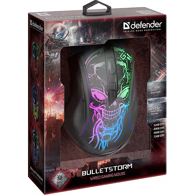 Description - Bulletstorm wired gaming mouse GM-928 72000 dpi 7P Flickering backlighting Defender Game Center software Macro editor Keyboard button emulation 4 mouse sensitivity modes 2 side buttons Contoured thumb grip Durable, soft-touch rubber coating Rubberised scroll wheel