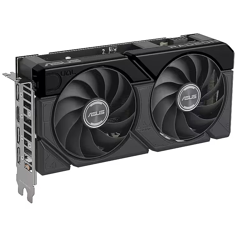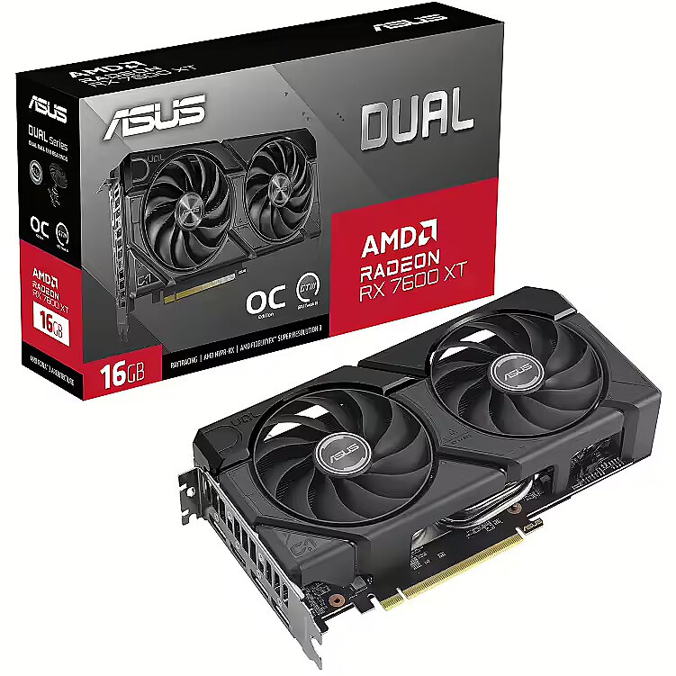 LongDesc - 2x Fans. 2x Fun.ASUS Dual Radeon™ RX 7600 XT fuses dynamic thermal performance with broad compatibility. Advanced cooling solutions from flagship graphics cards — including two Axial-tech fans for maximizing airflow to the heatsink — are packed into the 22.7 cm long, 2.5-slot card, delivering more power in less space. These enhancements make ASUS Dual the perfect choice for gamers who want heavyweight graphics performance in a compact build.Axial-tech Fan DesignBetter, faster, strongerTwo tried-and-true Axial-tech fans feature a smaller hub that facilitates longer blades and a barrier ring to increase downward air pressure.Auto-Extreme TechnologyPrecision automated manufacturingAuto-Extreme Technology is an automated manufacturing process that sets new standards in the industry by allowing all soldering to be completed in a single pass. This reduces thermal strain on components and avoids the use of harsh cleaning chemicals, resulting in less environmental impact, lower manufacturing power consumption, and a more reliable product overall.GPU TWEAK IIIMonitor, tweak, and tuneThe ASUS GPU Tweak III utility takes graphics card tuning to the next level. It allows you to tweak critical parameters including GPU core clocks, memory frequency, and voltage settings, with the option to monitor everything in real-time through a customizable on-screen display. Advanced fan control is also included along with many more features to help you get the most out of your graphics card.Pair with a PSUUse our wattage calculator to estimate how much power you’ll need to fuel your rig, and then pick a compatible ROG Thor, ROG Loki or ROG Strix AURA power supply for ultimate performance.
