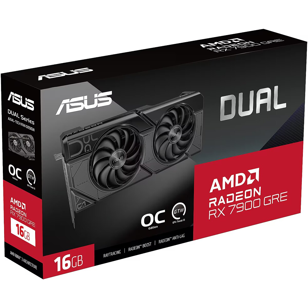 LongDesc - 2x Fans. 2x Fun.Delivering the latest AMD RDNA™ 3 architecture experience in its purest form, the ASUS Dual Radeon™ RX 7900 GRE OC Edition melds performance and simplicity like no other. Leveraging advanced cooling technologies derived from flagship graphics cards, the Dual opts for substance over style, the perfect choice for a well-balanced build. Buckle up and engage cutting-edge gaming prowess.COOLINGAxial-tech Fan DesignBetter, faster, strongerTwo tried-and-true Axial-tech fans feature a smaller hub that facilitates longer blades and a barrier ring to increase downward air pressure.0dB TechnologyQuiet intelligenceAn advanced onboard controller brings fans to a standstill when the GPU core temperature is below 55 Celsius, letting you enjoy light gaming in relative silence. As temps rise past the threshold, the fans automatically start up again.Dual Ball Fan Bearings2x longer lifespanDifferent bearing types have unique pros and cons. Ball bearings excel at durability and can last up to twice as long as sleeve bearing designs.Dual BIOSChoose wiselyDo you prioritize low core temps or low noise levels? Performance mode will let the fans spin up to keep the card running cool all the time. Quiet mode keeps the same power target and top-end settings, but offers a less aggressive fan curve for quieter operation at medium temps. For even more customization and control, check out our GPU Tweak III software.ENGINEERINGAuto-Extreme TechnologyPrecision automated manufacturingAuto-Extreme Technology is an automated manufacturing process that sets new standards in the industry by allowing all soldering to be completed in a single pass. This reduces thermal strain on components and avoids the use of harsh cleaning chemicals, resulting in less environmental impact, lower manufacturing power consumption, and a more reliable product overall.Protective BackplateThat's so metal!The PCB is reinforced by an aluminum backplate that adds structural rigidity, helping to prevent flex and protect components and trace pathways from damage.Stainless Steel BracketSteel yourselfThe mounting bracket of the Dual has been beefed up with 304 Stainless Steel that’s harder and more resistant to corrosion.SOFTWAREGPU TWEAK IIIMonitor, tweak, and tuneThe ASUS GPU Tweak III utility takes graphics card tuning to the next level. It allows you to tweak critical parameters including GPU core clocks, memory frequency, and voltage settings, with the option to monitor everything in real-time through a customizable on-screen display. Advanced fan control is also included along with many more features to help you get the most out of your graphics card.QuantumCloudProfit from GPU powerQuantumCloud is a safe and easy-to-use application that lets you effortlessly earn extra money by sharing your graphics card’s computing power. Earnings are accessible through your PayPal or WeChat account, and QuantumCloud also supports multiple exchange methods, including Steam. In addition, QuantumCloud doesn’t collect any personal data, so your privacy stays protected. Get started right away with just one click!AMD SoftwareChange the way you gameThe latest AMD Software unleashes the full potential of your GPU with day-0 drivers optimized for new game releases and a highly customizable gaming experience.