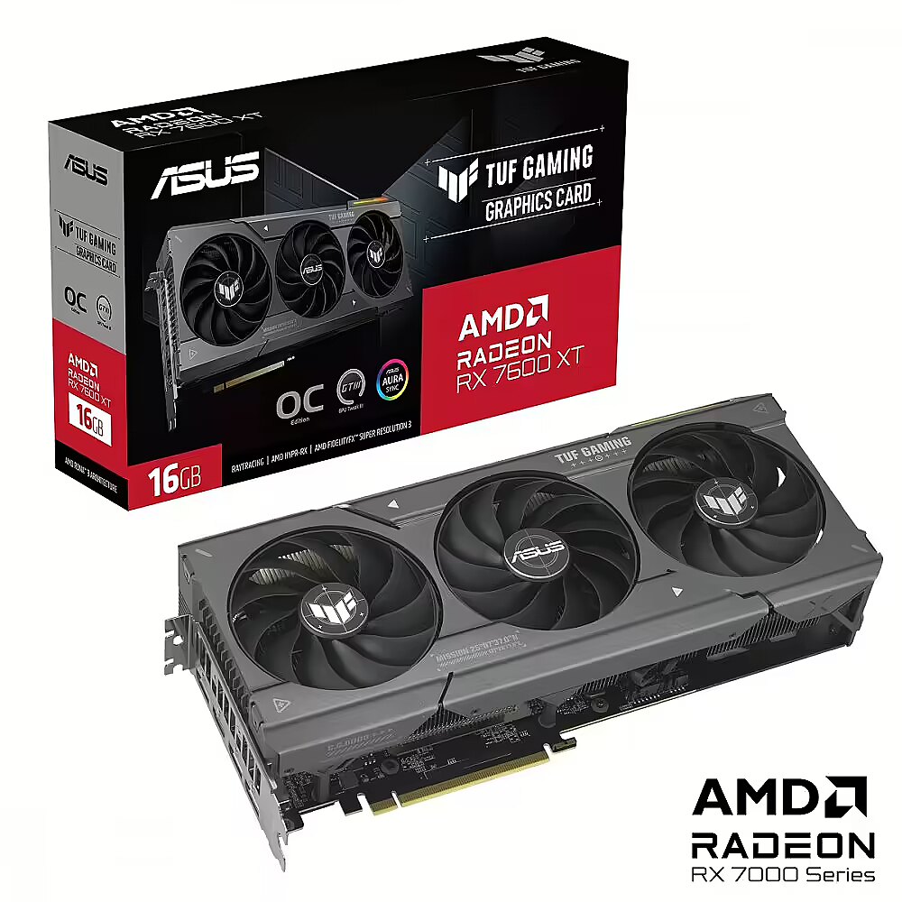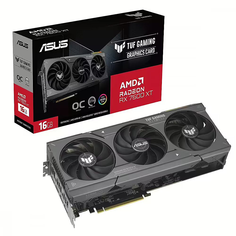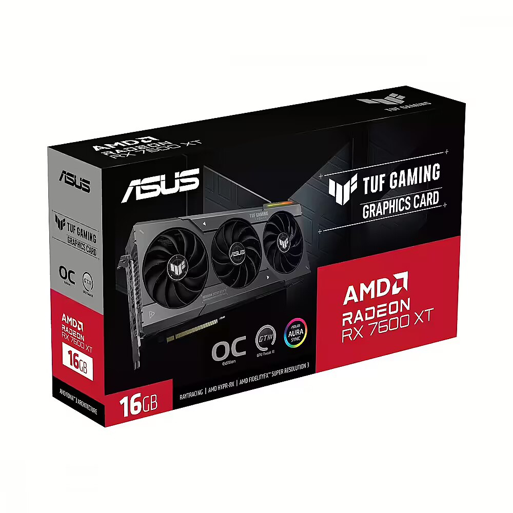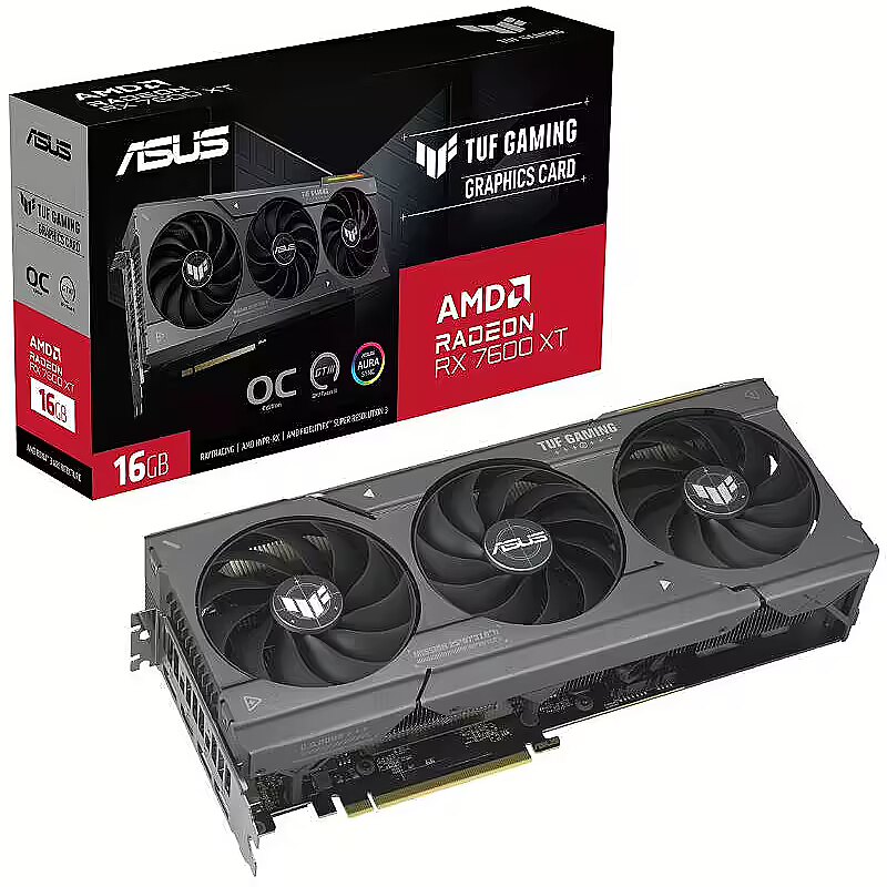 LongSummaryDescription - ASUS TUF Gaming TUF-RX7600XT-O16G-GAMING. Graphics processor family: AMD, Graphics processor: Radeon RX 7600 XT. Discrete graphics card memory: 16 GB, Graphics card memory type: GDDR6, Memory bus: 128 bit. Maximum resolution: 7680 x 4320 pixels. OpenGL version: 4.6. Interface type: PCI Express 4.0. Cooling type: Active, Number of fans: 3 fan(s), Illumination colour: Multi