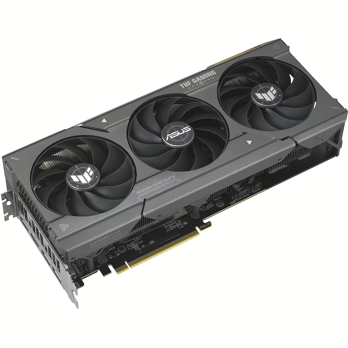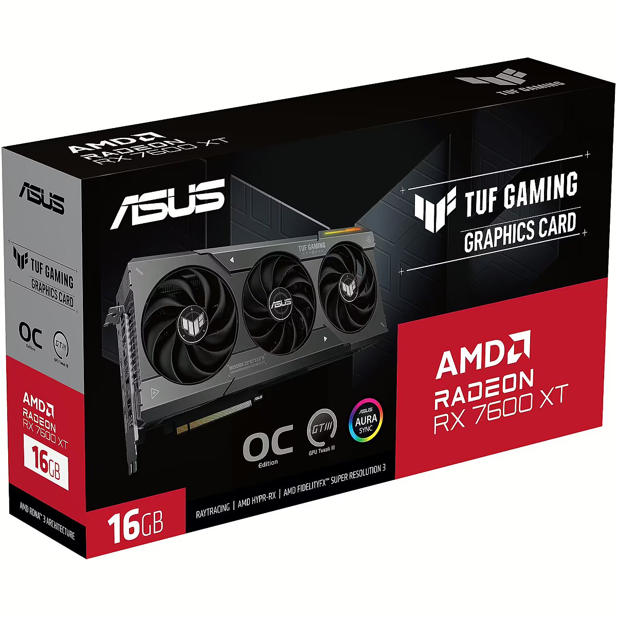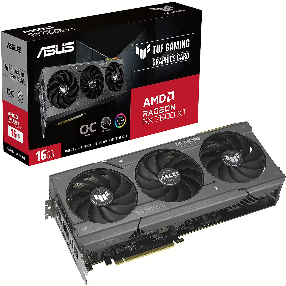 LongSummaryDescription - ASUS TUF Gaming TUF-RX7600XT-O16G-GAMING. Graphics processor family: AMD, Graphics processor: Radeon RX 7600 XT. Discrete graphics card memory: 16 GB, Graphics card memory type: GDDR6, Memory bus: 128 bit. Maximum resolution: 7680 x 4320 pixels. OpenGL version: 4.6. Interface type: PCI Express 4.0. Cooling type: Active, Number of fans: 3 fan(s), Illumination colour: Multi
