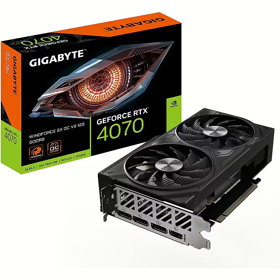 LongSummaryDescription - GIGABYTE GeForce RTX 4070 WINDFORCE 2X OC V2 12G Graphics Card - 12GB GDDR6, 192bit, PCI-E 4.0, 2490MHz Core Clock, 3 x DisplayPort 1.4a, 1 x HDMI 2.1a, NVIDIA DLSS 3, GV-N4070WF2OCV2-12GD. Graphics processor family: NVIDIA, Graphics processor: GeForce RTX 4070, Processor frequency: 2490 MHz. Discrete graphics card memory: 12 GB, Graphics card memory type: GDDR6, Memory bus: 192 bit, Memory clock speed: 20000 MHz. Maximum resolution: 7680 x 4320 pixels. DirectX version: 12.0, OpenGL version: 4.6. Interface type: PCI Express x16 4.0. Cooling type: Active, Number of fans: 2 fan(s)