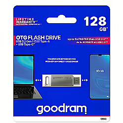 LongSummaryDescription - Goodram ODA3. Capacity: 128 GB, Device interface: USB Type-A / USB Type-C, USB version: 3.2 Gen 1 (3.1 Gen 1), Read speed: 60 MB/s, Write speed: 20 MB/s. Form factor: Swivel. Weight: 9 g. Product colour: Silver