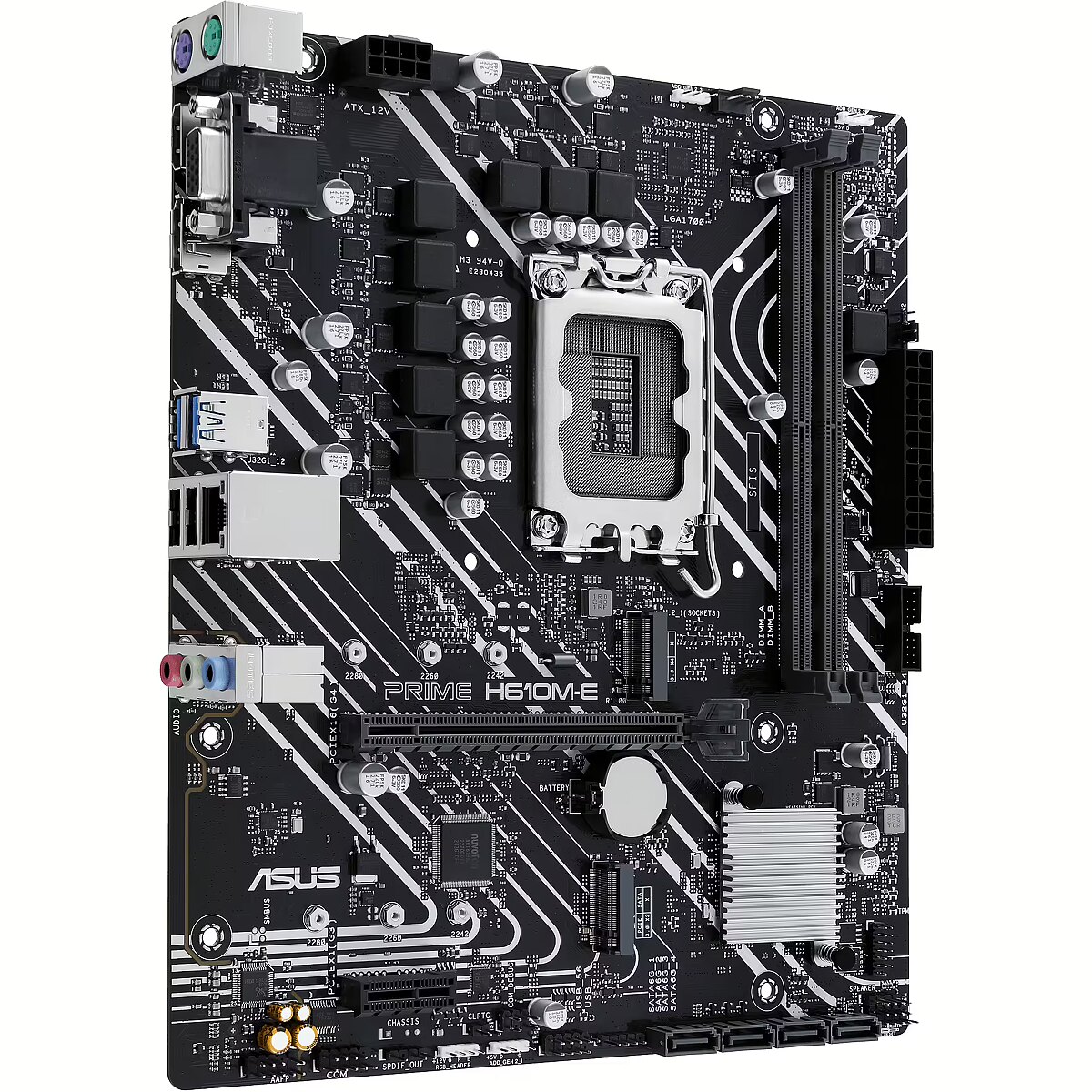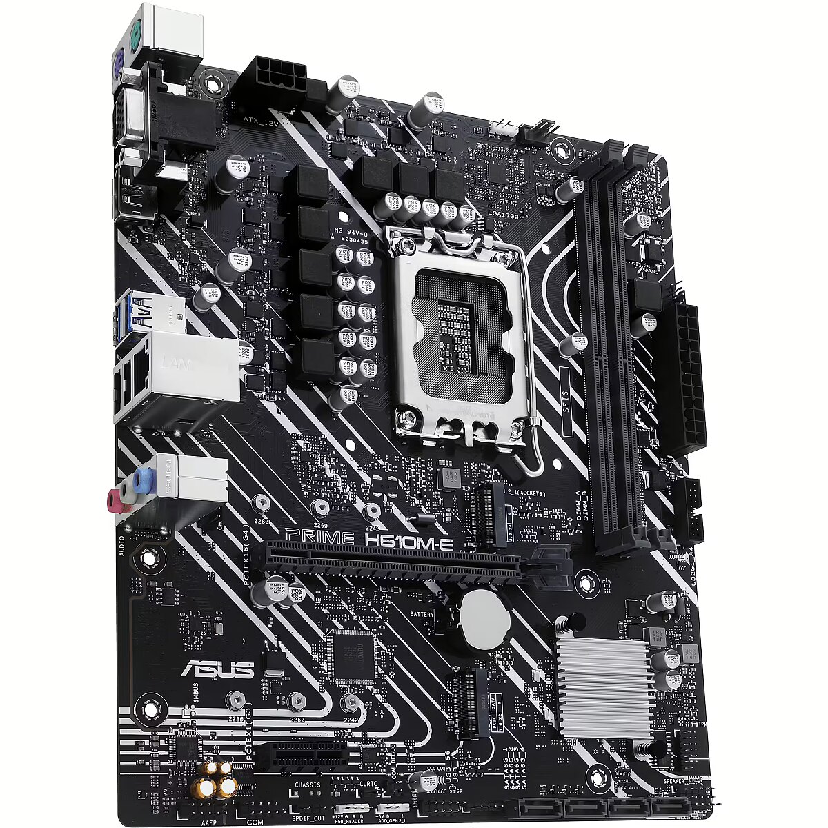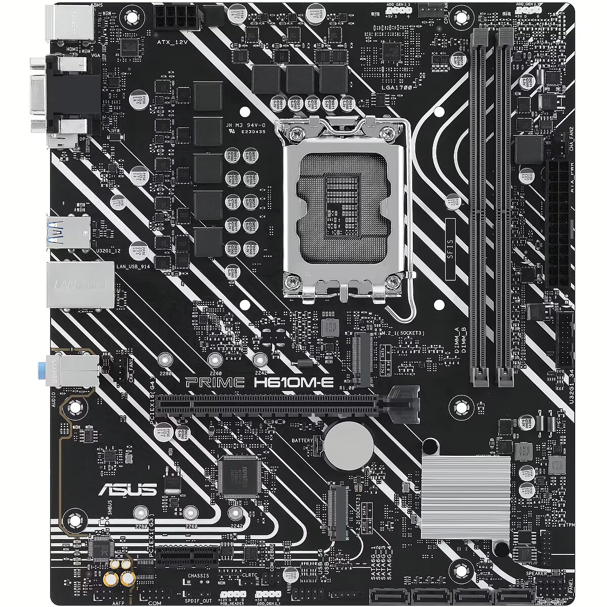 LongSummaryDescription - ASUS PRIME H610M-E-CSM. Processor manufacturer: Intel, Processor socket: LGA 1700, Compatible processor series: Intel® Celeron®, Intel® Core™ i3, Intel® Core™ i5, Intel® Core™ i7, Intel® Core™ i9,.... Supported memory types: DDR5-SDRAM, Maximum internal memory: 96 GB, Memory slots type: DIMM. Supported storage drive interfaces: M.2, SATA III, Supported storage drive types: HDD & SSD. Ethernet interface type: Gigabit Ethernet. Component for: PC, Motherboard form factor: micro ATX, Motherboard chipset family: Intel