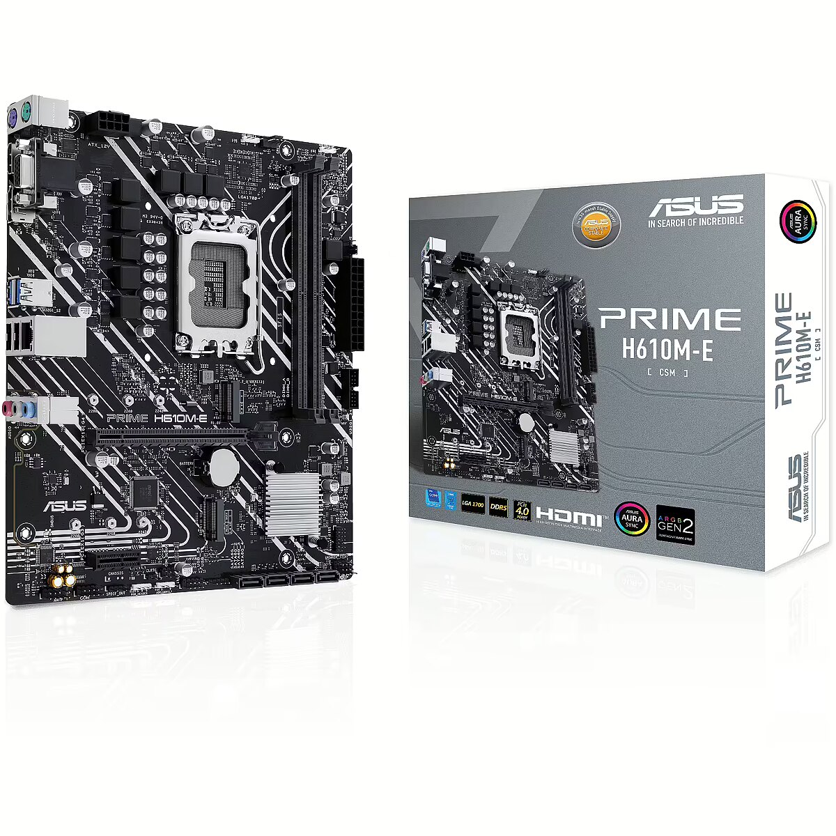LongDesc - ASUS Prime series motherboards are expertly engineered to unleash the full potential of 13th & 12th Generation Intel® processors. Boasting a robust power design, comprehensive cooling solutions and intelligent tuning options, Prime H610 provides users and PC DIY builders a range of performance tuning options via intuitive software and firmware features.ASUS Corporate Stable ModelASUS Corporate Stable Model (CSM) is a commercial program designed to provide stable and reliable motherboards. Offering up to 36-month product lifecycle support and 6-month end-of-life notice to allow sufficient lead times for your organization to get ready for product transitions. Each purchase of an ASUS CSM motherboard comes with ASUS Control Center Express - server-grade IT management software.* Lifecycle support, program offering and supply status may vary by region. Please consult your local sales representative for more information.ASUS ControlCenter ExpressASUS Control Center Express is an integrated IT monitoring and management software designed to deploy faster, simplify IT operations and improve productivity with comprehensive control and user-friendly functions. ASUS Control Center Express is compatible with over 100 ASUS motherboards to provide a high-quality, TCO-optimized solution for your business needs.Optimize IT endpoint managementDesigned to assist IT staff in monitoring and controlling devices within their corporate networks, and facilitate inventory checking in multiple locations remotelyAutomate IT maintenanceAllows IT staff to schedule automatic updates of the latest BIOS, software and utilities to specific or all devices at off-peak times, enhancing system stability and IT operational flexibilitySecurely manage all of endpointsSecurely manage endpoint configuration, portable storage access and PC software applications by enabling them to create grouping rules on individual devicesFLEXIBILITYComprehensive controls form the foundation of the ASUS Prime series. The Prime H610 motherboard packs flexible tools to tune every aspect of your system, enabling performance tweaks to perfectly match the way you work to maximize productivity.Intelligent ControlAll-Around Energy EfficiencyThe Energy Processing Unit (EPU) automatically optimizes power consumption and maximizes energy savings with Away mode — a smart setting that creates an extreme energy-saving scenario by shutting down unused I/O controllers.Flexible cooling controlsPrime 600 Series motherboards offer comprehensive control over system fans, via the included Fan Xpert 2+ software. Auto-Tuning mode intelligently configures all parameters with a single click.Precise Digital Power ControlThe Digi+ voltage-regulator module (VRM) delivers real-time control over voltage droop, automatically switching frequency and power-efficiency settings. It also allows you to fine-tune your CPU for ultimate stability and performance.* Specifications vary by modelsUEFI BIOSThe renowned ASUS UEFI BIOS provides everything you need to configure, tweak and tune your system. It offers intelligently simplified options for PC DIY beginners, as well as comprehensive features for seasoned veterans.Advanced Tuning for Serious TweakersAn intuitive Advanced mode offered via the UEFI lets you take complete control. A built-in search feature makes it easy to find options, and various advanced functions let you intelligently make nuanced adjustments so you can dial in performance just the way you want.Search FunctionQuickly and easily find the option or setting you need.ASUS User ProfilePort configuration settings between different BIOS versions or share them with friends.Quick and Simple SetupEZ mode displays vital settings and stats and also offers guided wizards, drag-and-drop functionality, and one-click application of important settings — all to help you get your rig up and running in no time.Intuitive Graphical Fan ControlFine-tune individual fan settings simply by dragging a curve with the mouse.EZ XMPImprove DRAM performance with one click.Aura On/Off Mode (Stealth)Easily enable or disable Aura RGB lighting or every onboard LED, for a subdued aesthetic touch.COOLINGCooler by DesignPrime H610 series feature comprehensive cooling controls that are configurable via Fan Xpert 2+ software or via the UEFI BIOS.Multiple Temperature SourcesEach header can dynamically reference three thermal sensors. Fan Xpert 2+ allows you to map the temperature of supported ASUS graphics cards to optimize cooling for GPU- and CPU-intensive tasks.Smart ProtectionA dedicated integrated circuit protects each fan header from overheating and overcurrent.4-Pin PWM/DC FanEach onboard header supports auto-detection of PWM or DC fans.PERFORMANCEPrime H610 series are built to handle the additional cores and increased bandwidth of 13th & 12th Generation Intel® processors. ASUS H610 motherboards provide all the fundamentals to boost daily productivity, so your system will be ready for action with stable power, intuitive cooling and flexible transfer options.StorageDual M.2 slots (up to 32 Gbps)PRIME H610M-E-CSM offers two M.2 slots that support data-transfer speeds of up to 32 Gbps via PCIe 3.0, enabling quicker boot-up and app load times with OS or application drives.* Actual transmission speeds will be lower than the theoretical maximum speed.ConnectivityPCIe® 4.0Prime H610 motherboards are designed specifically for 13th & 12th Generation Intel® Core™ CPUs and offer PCIe® 4.0 connectivity for the latest GPUs. The wide bandwidth and superfast transmission speeds allow you to create feature-rich builds that can handle high loads effortlessly.USB 3.2 Gen 1 Type-ANumerous USB ports support high-end rigs loaded with peripherals, including rear-panel USB Type-A connectors with fast USB 3.2 Gen 1 connectivity for compatible cases.AudioCombined onboard features deliver elevated audioIntelligent design and premium hardware create audio quality unlike anything you’ve ever experience