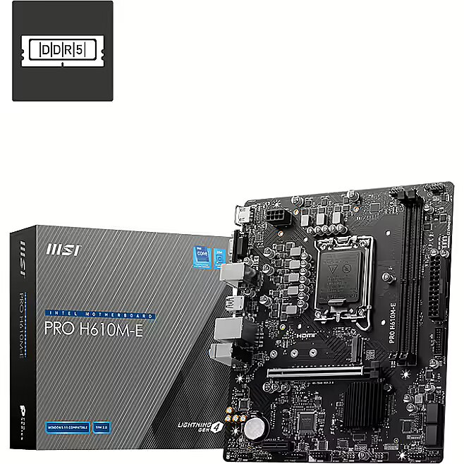 Description - PRO H610M-E Support Intel® Core™ 14th/ 13th/ 12th Gen Processors, Intel® Pentium® Gold and Celeron® Processors for LGA 1700 socket Supports DDR5 Memory, up to 5600(MAX) MHz Core Boost : With premium layout and digital power design to support more cores and provide better performance Memory Boost: Advanced technology to deliver pure data signals for the best performance, stability and compatibility Lightning Fast Experience: PCIe 4.0 Audio Boost: Reward your ears with studio grade sound quality Steel Armor: Protecting VGA cards against bending and EMI for better performance, stability and strength.