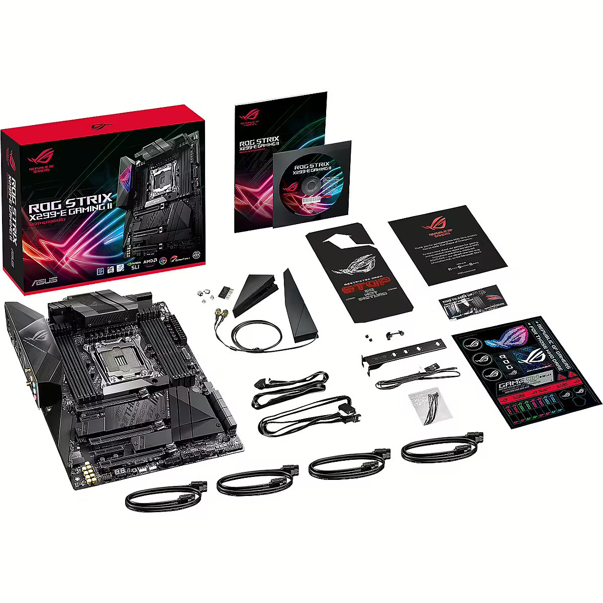 LongDesc - SOLID HARDWARE SPECSWith comprehensive cooling options and upgraded power delivery to fuel CPUs with more cores, plus faster storage and memory, ROG Strix X299-E Gaming II provides all the essentials you need to harness the full potential of components in your build for top-tier gaming performance.GAMING ENHANCEMENTROG Strix X299-E Gaming II is engineered with the latest connectivity for the best gaming experiences. Transfer files faster and banish lag as you secure more victories.DDR4 OC 4266MHz+The X299 platform delivers ample bandwidth on multiple fronts. Its quad-channel memory controller supports up to 256 GB of DDR4 memory across eight slots. With optimized trace layout, the ROG Strix X299-E Gaming II can hit memory speeds up to DDR4 4266 MHz or beyond.Three PCIe 3.0 M.2ROG Strix X299-E Gaming II features three M.2 slots. One slot supports both SATA and PCIe 3.0 x4 modes, and the other slots support PCIe 3.0 x4 for NVMe. Together, they give you the fastest and most-flexible M.2 interface available.VROCTake advantage of the Intel® Virtual RAID on CPU (VROC) feature* by connecting two M.2 drives in RAID configurations. With VROC, your RAID arrays are easily configured to be bootable, and traditional DMI bottlenecks are eliminated, so your storage won't be held back by other traffic.NEXT-GEN CONNECTIVITYROG Strix X299-E Gaming II amps up networking with 2.5G Ethernet and next-gen Intel® Wi-Fi 6 (802.11ax) that surpasses gigabit speeds to take your LAN to the next level. With ROG GameFirst software that offers multi-gate teaming, you'll enjoy the very best online gaming experience.Wi-Fi 6 (802.11 ax)The latest 802.11ax standard delivers high efficiency wireless connectivity for better gaming enjoyment. As well as providing better network pings in multi-user environments, 802.11ax also greatly improves throughput and coverage over earlier standards.2.5G Ethernet2.5G on-board Ethernet kicks your Ethernet connection up a notch with an up to 2.5X bandwidth improvement. Using your existing Ethernet cable, you can take advantage this networking upgrade to experience smoother, lag-free gaming, immediately stream high-resolution videos and enjoy faster file transfers.Intel Gigabit EthernetROG Strix X299-E Gaming II features Intel Ethernet (I219-V), ensuring data exchanges with your network and the outside world are fast and smooth. Intel Ethernet reduces CPU overhead and increases TCP and UDP throughput, keeping more processing power.SUPREMEFXShielded Audio, Superior SoundImmerse yourself in sound with SupremeFX audio technology. Utilizing the S1220A codec, SupremeFX is the integrated-audio solution that's engineered to provide a flat frequency response for a neutral, detailed sound signature. And to ensure that pristine signature is perfectly preserved, the front-panel output is driven with dual op amps, delivering sonics with the scale and authority to create virtual worlds via your gaming headset.Audio coverEffective shielding against electromagnetic interference preserves the integrity of audio signals for the best sound quality.Audio-line shieldingBlocks electromagnetic interference from the motherboard or add-ons to provide cleaner audio.Dual OP amplifiersWith two op-amps onboard you're able to pump exceptional audio to your favorite cans, with 32-600Ω-headphone impedance for great flexibility.Premium Nichicon™ audio capacitorsFine-quality Japanese-made components that produce a warmer, natural sound with exceptional clarity and fidelity.DESIGN & CUSTOMIZATIONA host of design touches, including a unique cyber-text pattern, plus customization options, comprehensive validation lists, and the most diverse ecosystem of components in the industry make building and personalizing a gaming rig with ROG Strix X299-E Gaming II wonderfully easy.STRIKING NEW DESIGNROG Strix X299-E Gaming II strikes an arresting pose, with or without RGB. The I/O shroud sports a laser-engraved ROG logo that lends understated style. But this is topped with an acrylic plate imprinted with ROG's signature cybertext patterns, so switching on the lights illuminates a whole new aesthetic dimension – unique style with a cyberpunk edge.OUTSHINE THE COMPETITIONROG Strix motherboards deliver sterling performance, accented by aesthetics to Outshine the Competition. ASUS Aura offers full RGB lighting control with a variety of functional presets for the built-in RGB LEDs as well as strips connected to the onboard RGB header — and it can all be synced with an ever-growing portfolio of Aura-capable ASUS hardware.CERTIFIED COMPATIBILITYHaving the freedom to pick and choose the parts that go into your machine is at the heart of PC DIY. That's why ROG Strix undergoes an extensive certification program focused on providing the very best compatibility with the widest range of components and devices. Our extensive list of guaranteed-compatible components is an invaluable aid to building a ROG Strix gaming rig. It specifies thousands of compatible parts, and it includes a dedicated Qualified Vendor List (QVL) for memory — so you can build fuss-free.ASUS NODE CONNECTORASUS Node is a proprietary bi-directional interface that allow ASUS motherboards to communicate with other system components, opening up a wealth of new.THE ROG STRIX ECOSYSTEM AWAITSGear up with ROG Strix components, from graphics and sound cards, to mice and keyboards, and up your game with complementary aesthetics, control and compatibility — and enjoy more choice than any competing brand.TUNE YOUR RIG YOU WANTThe ROG Strix X299-E Gaming II motherboard features firmware controls and software utilities designed for all skill levels, making setup, tuning and system maintenance simple. With options from overclocking and cooling to managing network performance and audio characteristics, you can configure your ROG Strix gaming build to perform the way you want.THE POWER OF INTEL Intel® X299 chipset.The Intel X299 chipset supports LGA 2066-socket Intel®