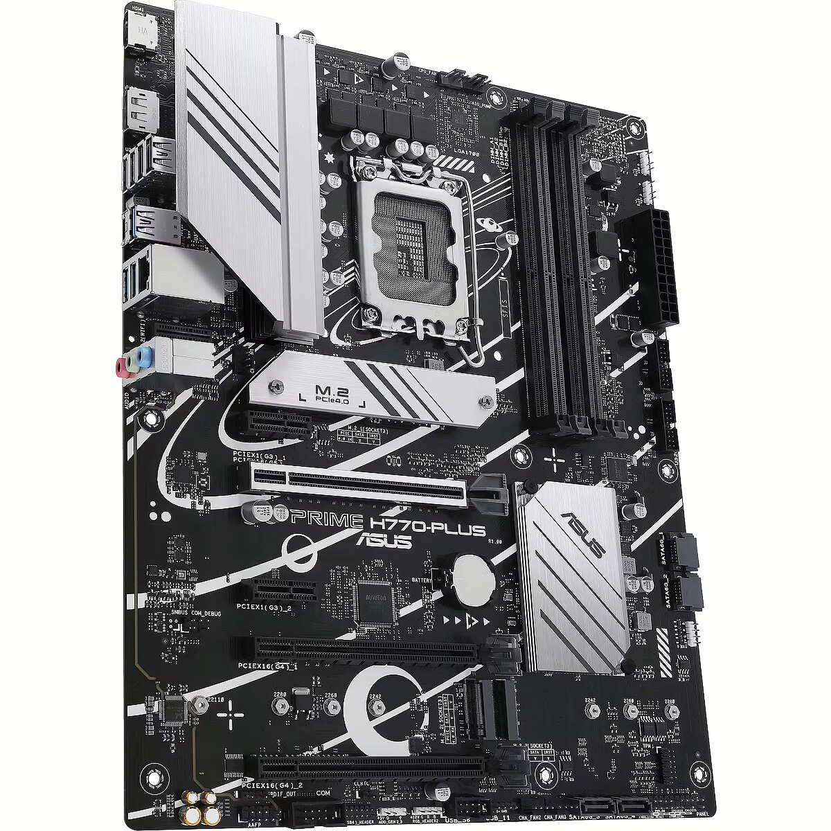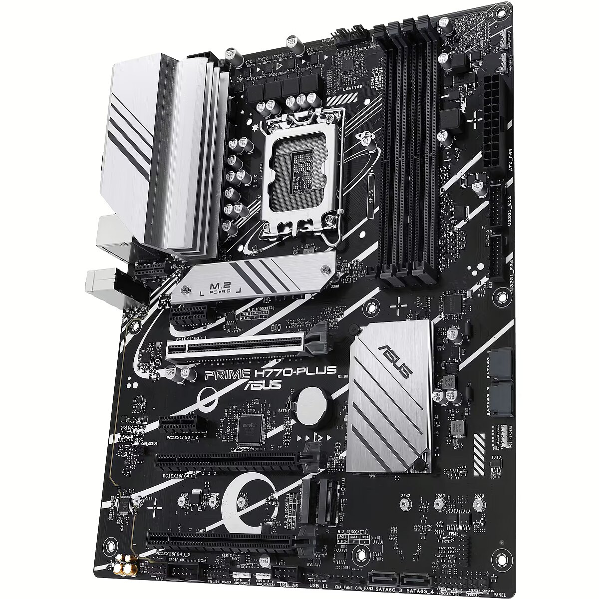 LongDesc - ASUS Prime series motherboards are expertly engineered to unleash the full potential of 13th Gen Intel® Core™ Processors. Boasting a robust power design, comprehensive cooling solutions and intelligent tuning options, PRIME H770-PLUS provides users and PC DIY builders with a range of performance optimizations via intuitive software and firmware features.FLEXIBILITYComprehensive controls form the foundation of the ASUS PRIME series. The PRIME H770-PLUS motherboard packs flexible tools to tune every aspect of your system, enabling performance tweaks to perfectly match the way you work to maximize productivity.Intelligent ControlASUS Intelligent Control makes your PC smart. Along with taking care of complex tuning and dynamically optimizing essential aspects of your system, it offers intelligently simplified options for newcomers to PC DIY, as well as more comprehensive features for seasoned veterans.All-Around Energy EfficiencyThe Power Saving function contains several settings can easily optimize power consumption and maximize energy savings. You can enable a CPU power limit, darken Aura lighting, and set the fan profile to a power saving mode. You can also toggle the Power Saver plan that is built into Microsoft Windows.Flexible Air- and Liquid-Cooling ControlsASUS Fan Xpert 2+ software provides comprehensive control over fans and all-in-one (AIO) coolers. Whether cooling with air or water, an Auto-Tuning mode intelligently configures all parameters with a single click. There’s also an Extreme Quiet mode that reduces chassis fan speeds to below the default minimum to keep your system whisper-quiet when performing light tasks. Fans and AIO coolers can also be controlled via the UEFI BIOS.Precise Digital Power ControlThe Digi+ voltage-regulator module (VRM) delivers real-time control over voltage droop, automatically switching frequency and power-efficiency settings. It also allows you to fine-tune your CPU for ultimate stability and performance.UEFI BIOSThe renowned ASUS UEFI BIOS provides everything you need to configure, tweak and tune your system. It offers intelligently simplified options for PC DIY beginners, as well as comprehensive features for seasoned veterans.Advanced Tuning for Serious TweakersAn intuitive Advanced mode offered via the UEFI lets you take complete control. A built-in search feature makes it easy to find options, and various advanced functions let you intelligently make nuanced adjustments so you can dial in performance just the way you want.Quick and Simple SetupEZ mode displays vital settings and stats and also offers guided wizards, drag-and-drop functionality, and one-click application of important settings — all to help you get your rig up and running in no time.Intuitive Graphical Fan ControlFine-tune individual fan settings simply by dragging a curve with the mouse.Aura On/Off Mode (Stealth)Easily enable or disable Aura RGB lighting or every onboard LED, for a subdued aesthetic touch.COOLINGPRIME H770-PLUS motherboard is engineered with multiple onboard heatsinks and an array of hybrid fan headers to ensure your rig stays cool and stable under intense workloads.HeatsinksM.2 HeatsinkM.2 heatsink wards off throttling that can occur with M.2 storage during sustained transfers. The heatsink is held in place by captive screws, and these removable captive screws help reduce risk of drops or loss during heatsink removal.VRM Heatsink and Thermal PadThe massive VRM heatsink and thermal pad improve heat transfer from the MOSFETs for better cooling performance.Cooler by DesignPRIME H770-PLUS features comprehensive cooling controls that are configurable via Fan Xpert 2+ software or via the UEFI BIOS.Multiple Temperature SourcesEach header can dynamically reference three thermal sensors. Fan Xpert 2+ allows you to map the temperature of supported ASUS graphics cards to optimize cooling for GPU- and CPU-intensive tasks.AIO Pump HeaderA dedicated PWM/DC header for self-contained water-cooling setups.Smart ProtectionA dedicated integrated circuit protects each fan header from overheating and overcurrent.4-Pin PWM/DC FanEach onboard header supports auto-detection of PWM or DC fans.PERFORMANCEThe PRIME H770-PLUS motherboard is built to handle the high core counts and bandwidth demands of 13th Gen Intel® Core™ Processors. ASUS H770 motherboard provides all the fundamentals to boost daily productivity, so your system will be ready for action with stable power, intuitive cooling and flexible data transfer options.Robust Power DesignStable power is essential to extract every last bit of performance out of Intel® processors. The PRIME H770-PLUS is geared to cater to the demands of these high-core-count CPUs.ProCool ConnectorProprietary connector augments the motherboard's link to the PSU with 8 pin connector that pass 12 volts of power directly to the processors. Each jack features solid pins that can handle more current than hollow-pin connectors.Six-Layer PCB DesignMultiple PCB layers optimize heat management for critical components to keep them at their optimal operating temperatures.MemoryAEMP II for Ultimate DDR5 PerformanceASUS Enhanced Memory Profile II (AEMP II) is an exclusive firmware feature for PMIC-restricted memory modules. AEMP II is based on a CPU and memory module’s ability to train the memory chips on your kit, and it presents an optimized clock speed that can effortlessly unleash performance.Built through a flexible training method, AEMP II makes it easy to not only tune the memory above baseline settings but also maintain the stability of system operation, whether getting the most out of an entry-level module or priming a high-speed kit for ultimate performance.*Results may vary according to the capabilities of your CPU and memory modules.**The comparison chart is based on a test with an Intel® i9-13900K processor and 2x16 GB SK Hynix DDR5-4800 non-ECC UDIMMs, model HMCG78MEBUA081N.***Please ensure all memory modules are from a single