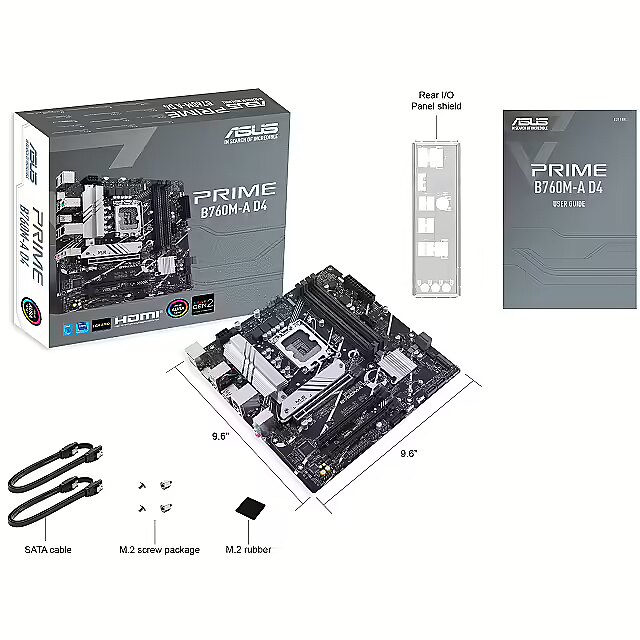 Specifications:Model: Prime B760M-A D4-CSMChipset: Intel B760Socket: LGA 1700Form factor: Micro-ATX (24.4 × 24.4 cm)CPU support: Intel Core 12th / 13th / 14th Gen, Pentium Gold, CeleronMemory: 4 × DDR4 DIMM slots, up to 128 GB, 5333 MHz (OC), Dual-channel, XMP supportExpansion slots: 1 × PCIe 5.0 x16, 1 × PCIe 3.0 x16 (x4), 1 × PCIe 3.0 x1Storage: 2 × M.2 (PCIe 4.0 x4), 4 × SATA 6 Gb/sGraphics outputs: HDMI 2.1, DisplayPort 1.4, D-Sub (VGA)Networking: Intel I219-V 1 Gb EthernetAudio: Realtek 7.1 Channel HD Audio (24-bit / 192 kHz)Rear USB ports: 1 × USB 3.2 Gen 2×2 (Type-C), 2 × USB 3.2 Gen 2, 2 × USB 3.2 Gen 1, 2 × USB 2.0Internal USB: 1 × USB 3.2 Gen 1 (header), 1 × USB 3.2 Gen 1 (Type-C), 2 × USB 2.0 headersCooling: VRM and M.2 heatsinks, hybrid fan headers, water cooling supportProtection: ASUS 5X Protection III, DIGI+ VRM, LANGuard, SafeSlot Core+, OptiMem IILighting: AURA Sync RGBBIOS: UEFI AMIOS support: Windows 11 / 10 (64-bit)Model year: 2024Package contents: Motherboard, SATA cables, screws, manual, software CD