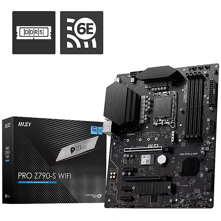 LongSummaryDescription - MSI PRO Z790-S WIFI. Processor manufacturer: Intel, Processor socket: LGA 1700, Compatible processor series: Intel® Celeron®, Intel® Pentium® Gold. Supported memory types: DDR5-SDRAM, Maximum internal memory: 192 GB, ECC сompatibility: Non-ECC. Supported storage drive interfaces: M.2, PCI Express, Supported storage drive types: HDD & SSD, RAID levels: 0, 1, 5, 10. Ethernet interface type: 2.5 Gigabit Ethernet, Top Wi-Fi standard: Wi-Fi 6 (802.11ax), Wi-Fi standards: 802.11a, 802.11b, 802.11g, Wi-Fi 4 (802.11n), Wi-Fi 6 (802.11ax). Component for: PC, Motherboard form factor: ATX, Motherboard chipset family: Intel