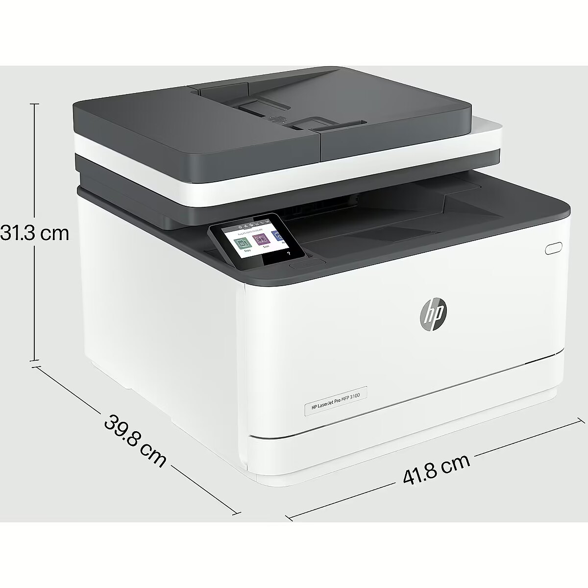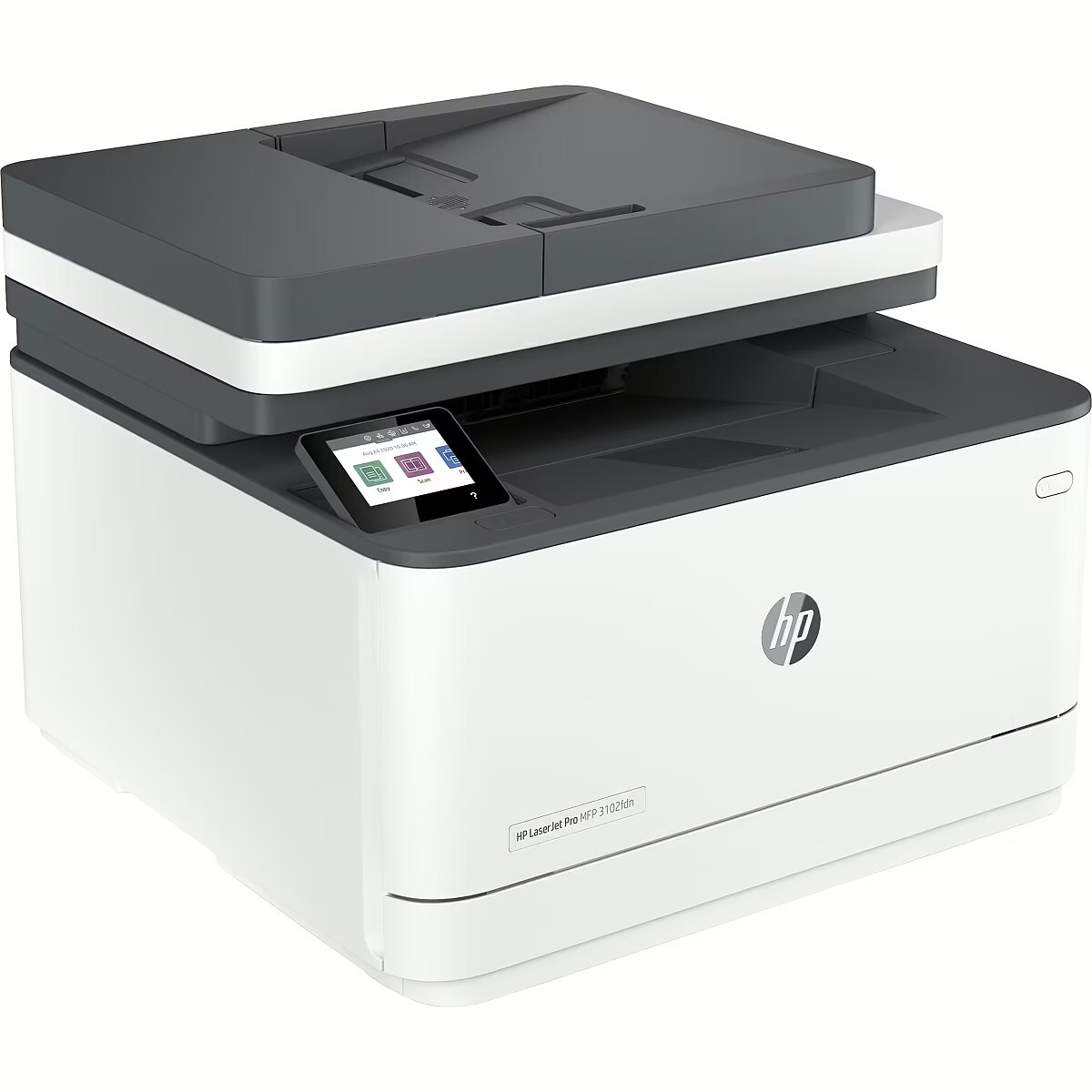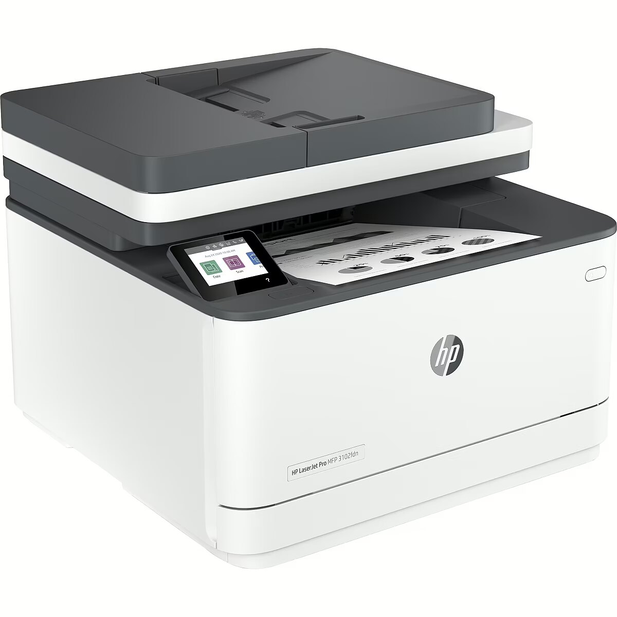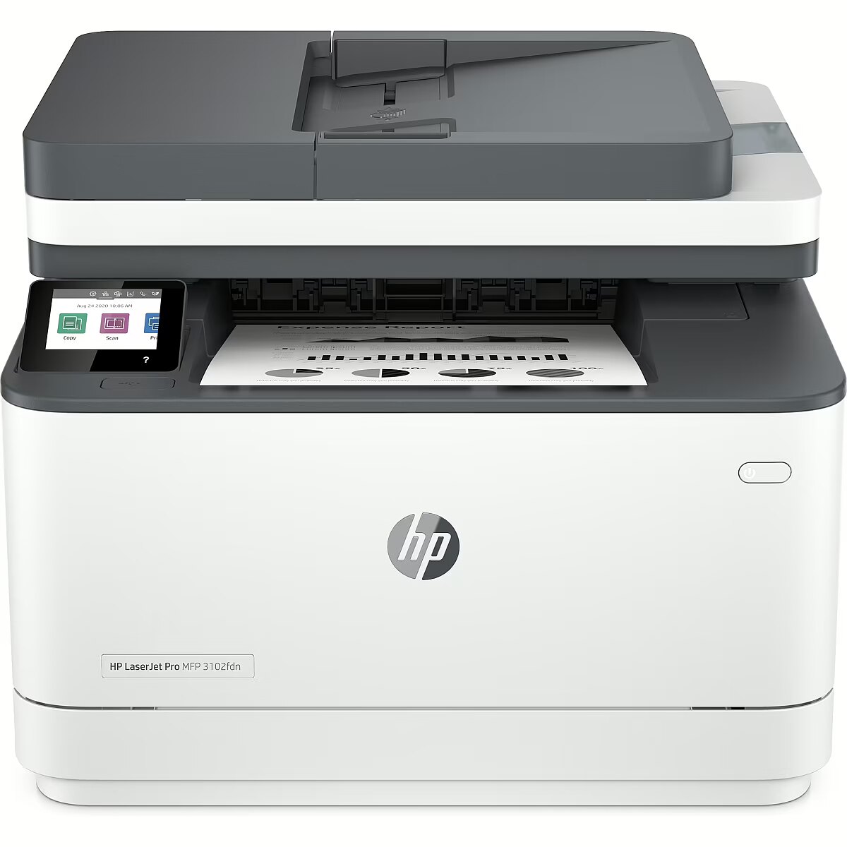 Technical_details - The LaserJet Pro MFP 3102fdn stands for fast black and white printing and high efficiency with 4-in-1 functionality. This laser multifunction printer outputs up to 33 pages per minute and also has scan, copy and fax functions. Originals can be fed via a feeder on the top. Thanks to the automatic duplex printing function, this multifunctional system makes it easy to print on both sides. The LAN interface enables the device to be easily integrated into existing workflows. A touchscreen was installed on the front for easy operation of the device. Simple shortcuts allow you to quickly call up repetitive work processes. Item no.: 100014862 Type multifunction printer Color grey/anthracite EAN 0195122461751 Manufacturer no. 3G629F#B19 LaserJet Pro series Connections 1x RJ-45, 1x USB-B 2.0 Formats A4, A5, A6, B5, C5, C6, DL (DIN-Long), Legal, Letter, 10x15 cm, 9x13 cm Media Glossy paper, plain paper Emulations PCL 5, PCL 6, PDF, PS, PCLmS, URF, PWG, PCLm Operation 3 LED buttons (Back, Home, Info) Display 6.8 cm (2.7") touchscreen Consumables Toner: HP 139A (W1390A) black (up to 1500 pages/ISO), HP 139X (W1390X) black (up to 4000 pages/ISO). Storage for ink/toner toner cartridge Compatible Linux, MacOS, Windows 7, Windows 10, Windows 11, Windows 2008 Server, Windows 2012 Server, Windows 2016 Server Memory occupies 512 MB Trays Paper Tray 1: 250 sheets Standby 4.5 watts Operating volume 53 dB Printer print area 210 x 297 mm Fax memory up to 500 pages Copier maximum copies 999 Scanner scanning area 216 x 297 mm Power supply Mains voltage AC 220 - 240 V (50Hz/60Hz) Feature Duplex Unit (Printing), Apple AirPrint, Mopria Certified, Copy Features: Lighter/Darker, Optimizations, Gutter, Multi-Page Copy, Collation, Quality Settings. Scan file formats: JPG, TIFF, XPS, PDF, PDF/A. Recommended scanning volume: 150 to 1500 pages/month. Minimum media format (ADF): 148x210 mm. Maximum media format (ADF): 216x356 mm. The device has an 800 MHz processor and supports mobile printing via the HP Smart app. Supported media sizes (printing): 76x216 mm to 127x356 mm. Security features: Integrated web server with password protection, enable/disable network ports, password change for SNMPv1 community. Further information supported operating systems: macOS v10.15 Catalina, macOS v11 Big Sur, macOS v12 Monterey Accessories included HP Black LaserJet starter toner cartridge (yield approximately 1,000 pages), setup guide, reference guide, regulatory flyer, power cable Dimensions device width: 41.8 cm x height: 31.32 cm x depth/length: 39.82 cm Weight 10.5kg