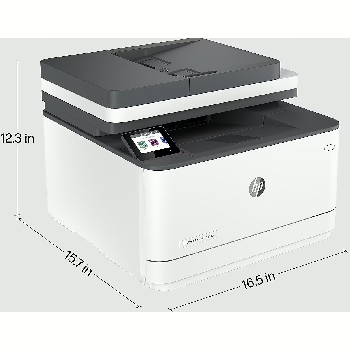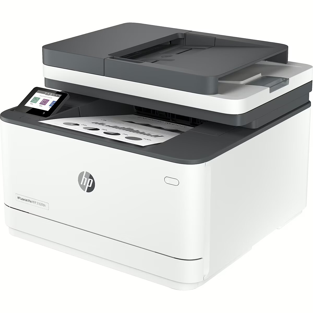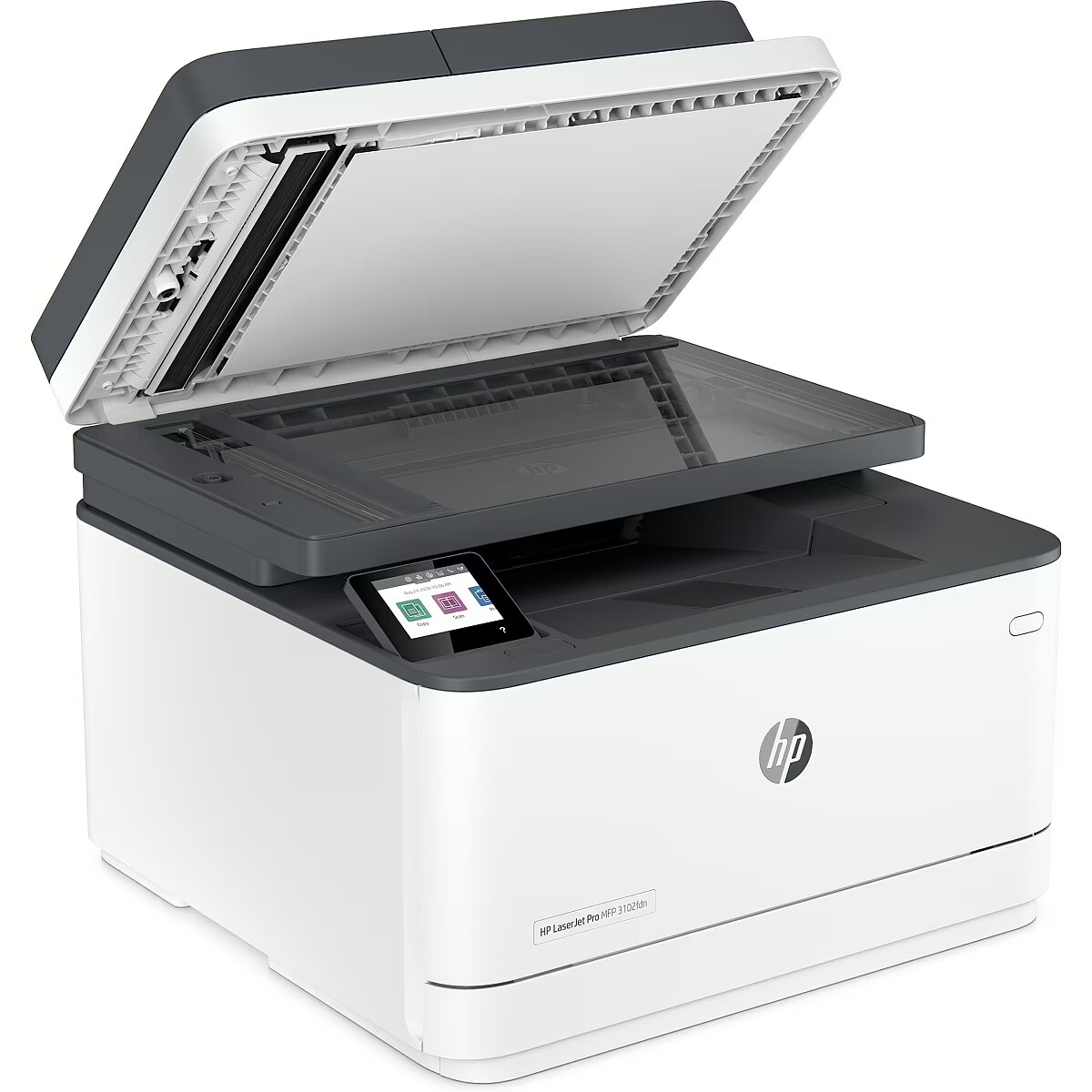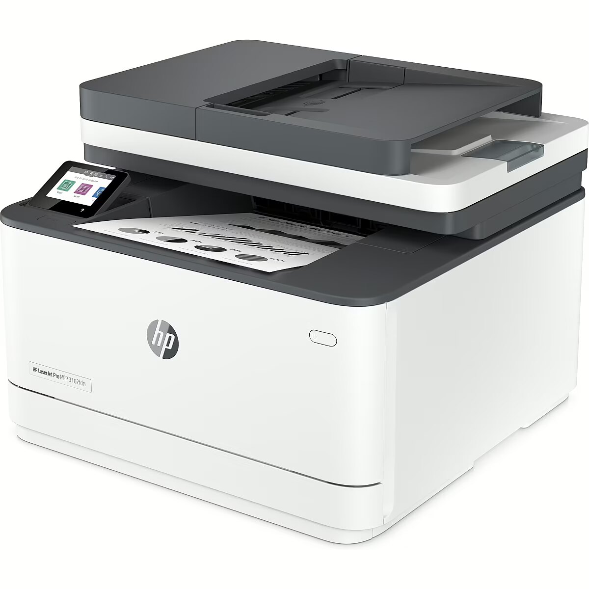 Technical_details - The LaserJet Pro MFP 3102fdn stands for fast black and white printing and high efficiency with 4-in-1 functionality. This laser multifunction printer outputs up to 33 pages per minute and also has scan, copy and fax functions. Originals can be fed via a feeder on the top. Thanks to the automatic duplex printing function, this multifunctional system makes it easy to print on both sides. The LAN interface enables the device to be easily integrated into existing workflows. A touchscreen was installed on the front for easy operation of the device. Simple shortcuts allow you to quickly call up repetitive work processes. Item no.: 100014862 Type multifunction printer Color grey/anthracite EAN 0195122461751 Manufacturer no. 3G629F#B19 LaserJet Pro series Connections 1x RJ-45, 1x USB-B 2.0 Formats A4, A5, A6, B5, C5, C6, DL (DIN-Long), Legal, Letter, 10x15 cm, 9x13 cm Media Glossy paper, plain paper Emulations PCL 5, PCL 6, PDF, PS, PCLmS, URF, PWG, PCLm Operation 3 LED buttons (Back, Home, Info) Display 6.8 cm (2.7") touchscreen Consumables Toner: HP 139A (W1390A) black (up to 1500 pages/ISO), HP 139X (W1390X) black (up to 4000 pages/ISO). Storage for ink/toner toner cartridge Compatible Linux, MacOS, Windows 7, Windows 10, Windows 11, Windows 2008 Server, Windows 2012 Server, Windows 2016 Server Memory occupies 512 MB Trays Paper Tray 1: 250 sheets Standby 4.5 watts Operating volume 53 dB Printer print area 210 x 297 mm Fax memory up to 500 pages Copier maximum copies 999 Scanner scanning area 216 x 297 mm Power supply Mains voltage AC 220 - 240 V (50Hz/60Hz) Feature Duplex Unit (Printing), Apple AirPrint, Mopria Certified, Copy Features: Lighter/Darker, Optimizations, Gutter, Multi-Page Copy, Collation, Quality Settings. Scan file formats: JPG, TIFF, XPS, PDF, PDF/A. Recommended scanning volume: 150 to 1500 pages/month. Minimum media format (ADF): 148x210 mm. Maximum media format (ADF): 216x356 mm. The device has an 800 MHz processor and supports mobile printing via the HP Smart app. Supported media sizes (printing): 76x216 mm to 127x356 mm. Security features: Integrated web server with password protection, enable/disable network ports, password change for SNMPv1 community. Further information supported operating systems: macOS v10.15 Catalina, macOS v11 Big Sur, macOS v12 Monterey Accessories included HP Black LaserJet starter toner cartridge (yield approximately 1,000 pages), setup guide, reference guide, regulatory flyer, power cable Dimensions device width: 41.8 cm x height: 31.32 cm x depth/length: 39.82 cm Weight 10.5kg