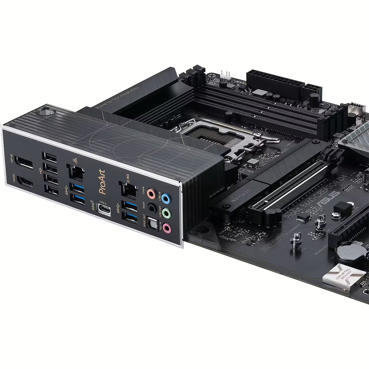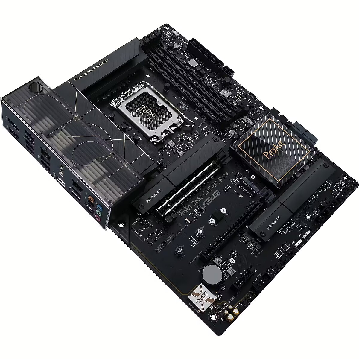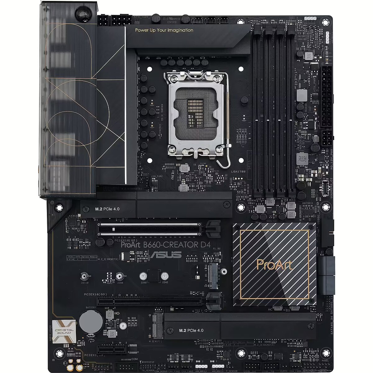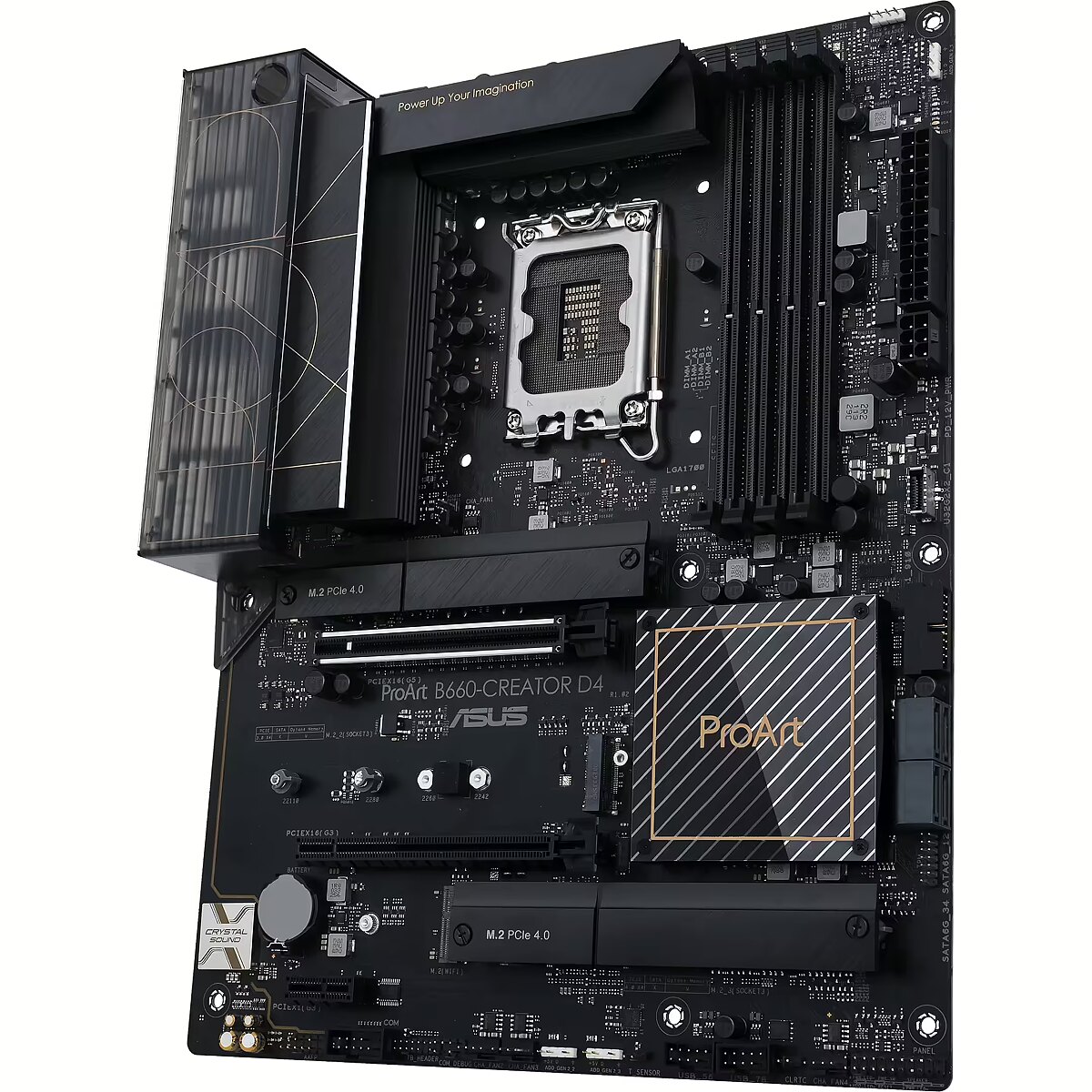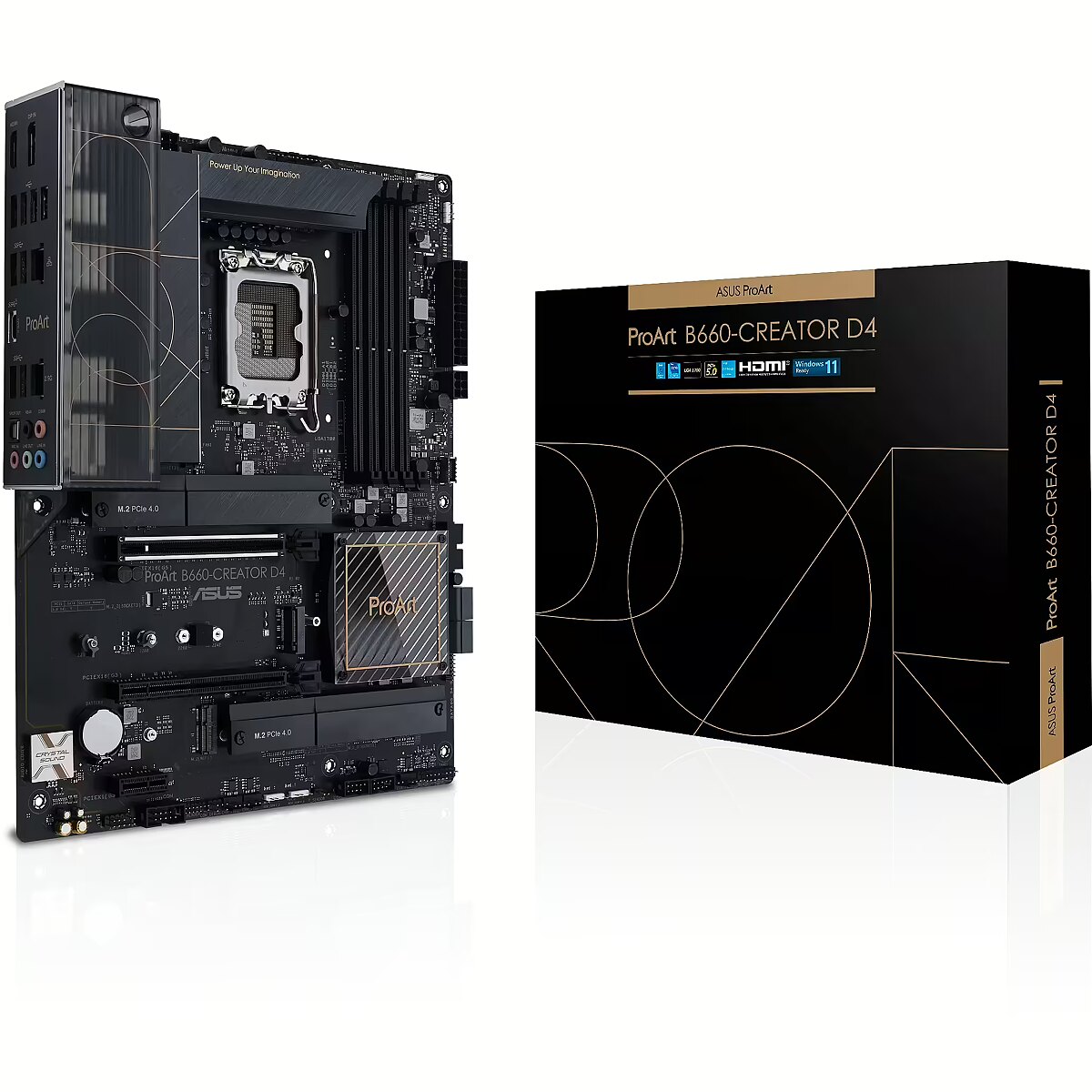 LongDesc - Your Powerhouse for CreativityProArt B660-Creator D4 is an enhanced motherboard designed for intensive content-creation workloads like 3D rendering and 4K/8K video editing. It unleashes the performance of 12th Gen Intel® Core™ processors through robust power delivery and cooling design, and its comprehensive connectivity includes onboard 2.5 Gb and 1 Gb Ethernet, a USB 3.2 Gen 2x2 Type-C® front-panel connector with Quick Charge 4+, and DisplayPort™ via USB-C.Comprehensive ConnectivityAn array of powerful I/O ports — including 2.5 Gb and 1 Gb Ethernet ports and three M.2 slots — enables quick data transfers and extensive storage options.USB-C DisplayPort (DP Alt Mode)This USB Type-C® port delivers transfer speeds of up to 10 Gbps, and it supports an alternate mode that provides DisplayPort™ 1.4 output for up to 8K resolution at 60 Hz. This new feature gives creators premium-grade flexibility to choose between high-speed data or an additional hi-res display*.*This functionality requires the bundled DP-to-DP cable to be connected from an installed graphics card to the DP IN port located on the rear I/O panel of the motherboard.USB 3.2 Gen 2x2 Type-C® Front-Panel Connector with Quick Charge 4+A USB 3.2 Gen 2x2 connector boosts Type-C data transfers with speeds of up to 20 Gbps. The connector also features Quick Charge 4+ technology that can quickly charge devices up to 60 W with a PCIe power supply cable plugged into the nearby 6-pin connector.Thunderbolt™ 4 SupportProArt B660-Creator D4 features Thunderbolt™ 4 support via an on-board header. The ASUS ThunderboltEX 4 add-on card is certified by Intel and can enable bi-directional speeds of up to 40 Gbps on a single cable. Additionally, the card has a daisy-chain function for multiscreen connection and supports one display with up to 8K resolution . It can also provide up to 100 watts of power to fast-charge devices.Ultrafast M.2 Transfer SpeedsThree M.2 slots support PCIe 4.0 or 3.0 drives and provide NVMe® SSD RAID support for an incredible performance boost. Create a RAID configuration with up to two PCIe 4.0 storage devices to enjoy the fastest data transfer speeds.M.2 Q-LatchThe innovative Q-Latch makes it easy to install or remove an M.2 SSD without the need for specific tools. The design employs a simple locking mechanism to secure the drive, eliminating the need for screws.Dual Ethernet ports provide fast data transfers simultaneously for internet and for local network-attached storage (NAS), allowing for improved data organization and security.2.5 Gb EthernetThe 2.5 Gb Ethernet port provides faster data transfers and smooth high-res video streaming.Intel® 1Gb EthernetThe Intel I219-V Ethernet chip reduces CPU overhead and offers exceptionally high TCP and UDP throughput for faster, smoother data transfers.M.2 Slot (Key E)ProArt B660-Creator D4 features an M.2 slot (key E) which can support type 2230 WiFi/Bluetooth and Intel CNVi (integrated WiFi/BT) modules*.*The WiFi/BT module is purchased separately.Next-Gen PerformanceWith tailored CPU power delivery and support for high-performance memory, ProArt B660-Creator D4 easily handles the demands of the latest 12th Gen Intel Core processors. It features an intelligent VRM design that’s rated for 50 amps, plus carefully selected components and memory layout optimizations for multithreaded tasks such as 3D animation and video editing.Robust Power DeliveryTeamed power stages12+1 power stages rated for 50 amps combine high-side and low-side MOSFETs and drivers into a single package, delivering the power and efficiency that the latest 12th Gen Intel Core processors demand.Digi+ Power ControlThe ASUS Digi+ voltage-regulator module (VRM) is one of the finest in the industry and ensures ultra-smooth power delivery to the CPU.ProCool power connectorThe ASUS ProCool socket is built to exacting specifications to ensure flush contact with PSU power lines, enabling lower impedance and better heat dissipation.Chokes & capacitorsPremium alloy chokes and durable capacitors are engineered to resist extreme temperatures, providing a higher level of performance than the industry standard.PCIe 5.0 ReadyThe 12th Gen Intel processors bring PCIe 5.0 support to the market. PCIe 5.0 offers twice the data transfer speed of PCIe 4.0, making it robust enough to handle new data-heavy tasks. PCIe 5.0 also brings other benefits, such as improved signal integrity, backward-compatible CEM connectors for add-in cards, and backward compatibility with previous PCIe versions.DDR4 MemoryProArt B660-Creator D4 supports up to 128 GB of DDR4 memory across four slots. ASUS-exclusive OptiMem II technology improves trace layout to significantly reduce signal distance and crosstalk, enhancing memory stability and compatibility while giving memory kits higher clock speed margins.Optimized Cooling DesignMaintaining system stability under heavy loads is of paramount importance, so ProArt B660-Creator D4 features comprehensive cooling with large VRM and chipset heatsinks that strike the right balance between surface area and mass. Integrated premium components and multiple fan headers are also vital design elements that provide the best foundation for content creation systems.HeatsinksVRM heatsinksTwo VRM heatsinks are placed above the MOSFETs and chokes to further increase surface area for heat dissipation.M.2 heatsinksTwo M.2 heatsinks cover three M.2 slots to keep M.2 SSDs at the optimal operating temperature for consistent performance and reliability.Chipset heatsinkA dedicated chipset heatsink draws heat away to help ensure that temperatures stay within an optimal range.HeadersCooler by DesignProArt B660-Creator D4 features these comprehensive cooling options:Multiple temperature sourcesEach header can be set to monitor and react to multiple user-configurable thermal sensors for workload-based cooling. All settings can be easily managed using the Fan Xpert 4 in Amoury Crate or via the UEFI.4-pin PW