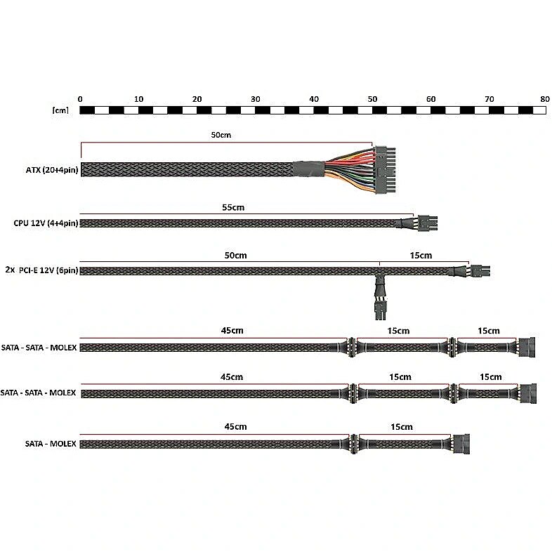 Kabeli ir pietiekami gari, lai vienkārši uzstādītu barošanas avotu lielākajā daļā ATX korpusu. Daudzpusība: