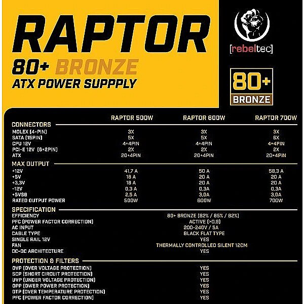 Rebeltec RAPTOR Series, 600W, 80PLUS Bronze