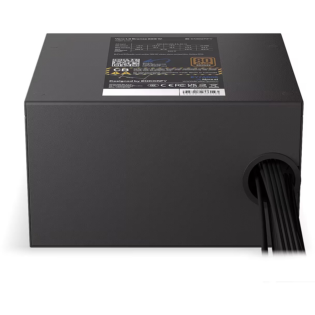 Description - The ENDORFY Vero L5 Bronze 600 W is like God Mode for your PC. It's a stable power supply with DC-DC converters to regulate voltages and deliver 600 W of continuous power. Inside, it has Taiwanese electrolytic capacitors and Teapo aluminium-polymer capacitors. With a finger in the USB, they embrace tasks even at temperatures up to 105C. Not surprisingly, the ENDORFY Vero L5 Bronze 600 W is 80 PLUS Bronze certified. The Vero is also protected against short circuits, system overloads and other accidents. Low operating temperatures are taken care of by the quiet Stratus fan with FDB bearing. Its case is 14 cm long, so you can fit it even into a smaller PC. A machine revolt? What is it? In real life, like in the movies, even a trusty PC can start a machine revolt. We've also had a few (dozen) blue screens and resets without warning. That's why we designed the Vero L5 Bronze 600 W in such a way that it holds a stable voltage at all costs. Even when dealing with demanding components. That's thanks to DC-DC converters that guarantee precise voltage regulation, stable operation and a total continuous output of 600 W. On top of this, you get a full package of protections against short circuits and overloads, among other things. Thanks to these, in the event of a fault or overvoltage from the electrical system, the power supply will simply shut down. Silence on the horizon When you're working and playing at 100%, you need a power supply that can keep up with your comp. That's exactly what you have the Vero L5 Bronze 600W for. It's a powerful piece of hardware that ensures silence even when you're compulsively rendering 3D projects or like to do video coding marathons. That's all thanks to the quiet FDB-bearing Stratus fan we've fitted to the PSU. It's not big, but it cools like an open fridge on a hot night and, unlike the fridge, it works without a monotonous background noise. Maybe one day we'll make room in it for something good to drink. Capacitors from Taiwan The Vero L5 Bronze 600 W is a power supply that can compete with the most hardcore survivalist maniacs on chilu. Even extreme temperatures do not cook it, its capacitors are rated for 105o Celsius.This is thanks to Taiwanese Teapo capacitors. They take up little space and can be overlooked at first glance, but high-end power is hidden in this small aluminium shell. 3-year warranty In the package with the Vero L5 Bronze 600 W you get a 3-year warranty. Something tells us you won't use it anyway (because, you know, you're dealing with ENDORFY quality), but we thought you'd be happy with this option. YOLO!