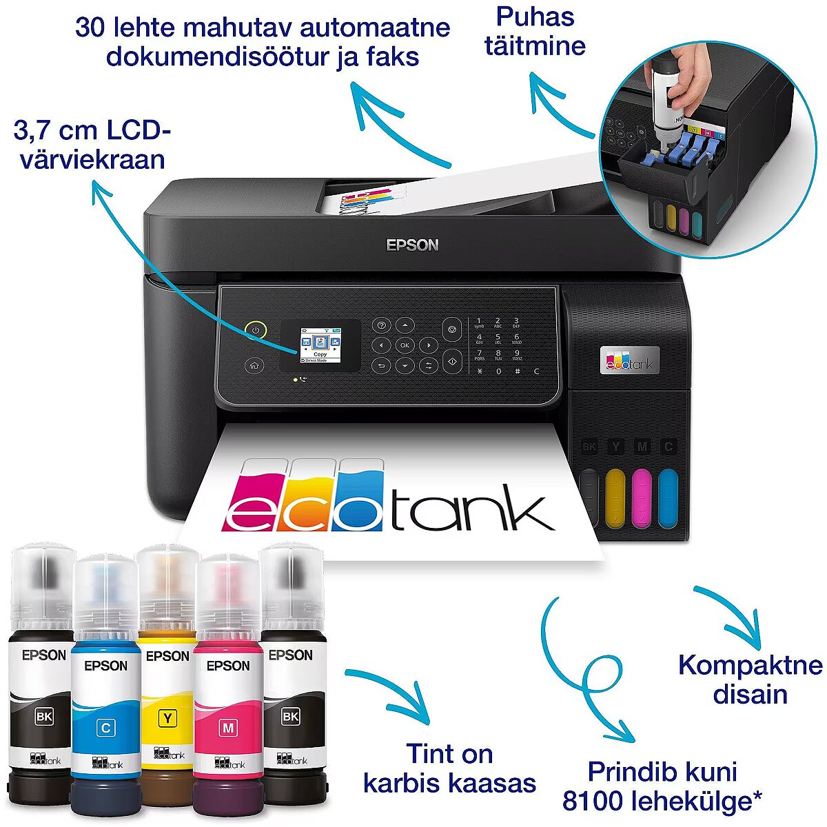 description_et - Stressivaba, mugav printimine kuni 66 kasseti väärtuses tindiga ühes pudelikomplektis – säästad taastäidetavate tindimahutitega printimiskuludelt kuni 90% A4 multifunktsionaalne printer ADS-i ja faksiga – kõrge kvaliteediga printimine, paljundamine, skannimine, faksimine Mitu ühenduvusvõimalust võimaldavad hõlpsalt kõikjalt printida – kasuta Epson Smart Panel rakendust, et printimist seadistada, jälgida, printida ja teha palju muud oma nutiseadmega Prindib kuni 8100 lehte musta tindiga ja 6500 lehte värvilise tindiga – kõik on karbis kaasas, lihtsalt lisa paberit Number 1 tindimahutiga printerimark kogu maailmas – 2023. märtsi seisuga on maailmas müüdud 80 miljonit EcoTanki printerit Lihtne probleemivaba tindimahutite süsteem võimaldab pudelitest uuesti täita. Lisaks tagab EcoTanki võtmelukuga pudelisüsteem, et protsess on määrimisvaba. Jäta kassettidega hüvasti