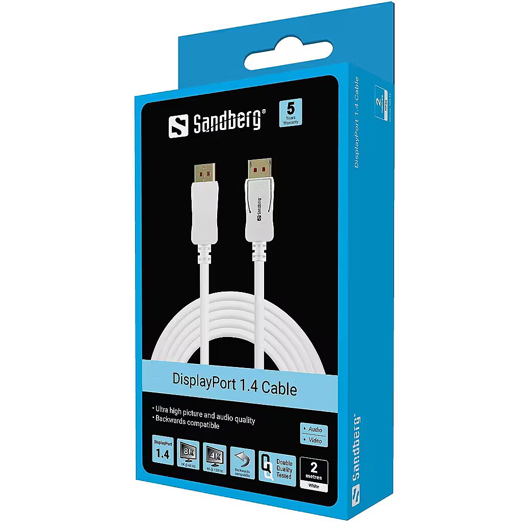 LongSummaryDescription - Sandberg DisplayPort 1.4 8K60Hz 2m. Cable length: 2 m, Connector 1: DisplayPort, Connector 2: DisplayPort. Package width: 130 mm, Package depth: 45 mm, Package height: 172 mm. Quantity per pack: 1 pc(s)