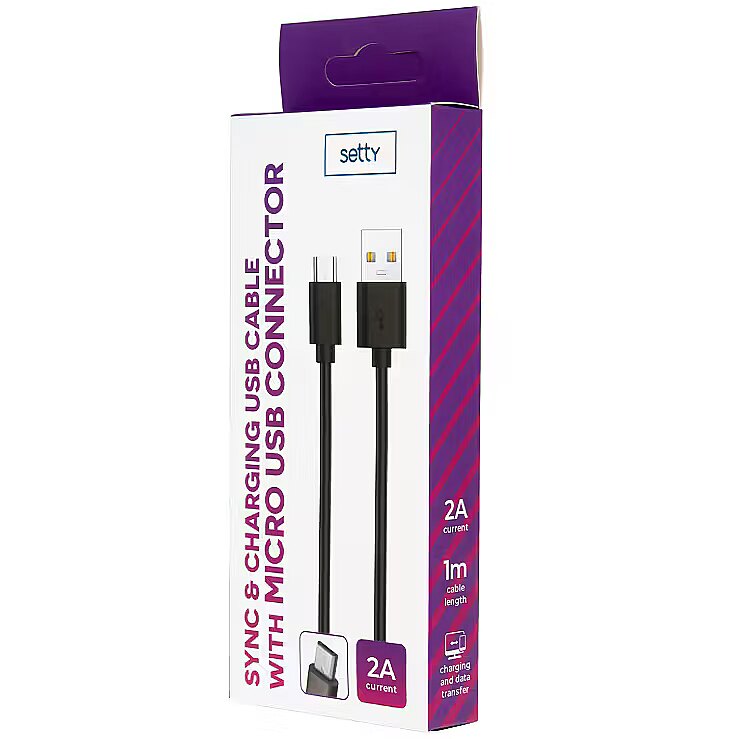 description_en - The Setty Micro USB cable is designed for fast data transfer and safe charging of smartphones and tablets. It is compatible with all devices that have a micro USB port. Use it to connect your phone or tablet to a laptop, PC, or any device with a USB port.Specifications: Cable length: 1.00 m Connector: USB – Micro USB Current: 1.0 A Data transfer: Yes Charging: Yes