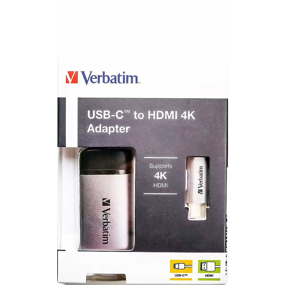 LongDesc - Seamless connectionThe Verbatim USB-C to HDMI 4K adapter lets you connect your USB-C or Thunderbolt 3 (USB-C) enabled smartphones, laptops and MacBooks to a projector, HDTV or monitor that supports HDMI. It is the ideal companion for the latest slimline laptops and MacBooks that come with limited ports. No need to replace your whole setup when you upgrade your laptop, simply connect the adapter to a USB-C port on your laptop and then plug in an HDMI cable to connect to your display. Ultra HD resolutionTh USB-C to HDMI 4K adapter supports Ultra HD 4K razor-sharp resolutions, providing feature-rich content for the ultimate immersive experience. Even at higher frame rates, the adapter still provides smooth and continuous viewing without any loss or lag.Portable convenienceThis ultra-portable design makes this adapter perfect for BYOD (Bring Your Own Device) applications at the office and when travelling. Mirror or extend your displays onto a big HD TV or an additional monitor to work, game or relax with the full 4k experience.