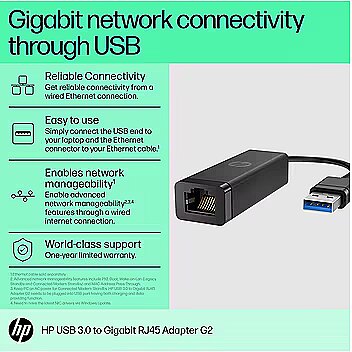LongDesc - Gigabit network connectivity through USBConvert your laptop's high-speed USB 3.0 connection to a fast 10/100/1000 Ethernet connection with the HP USB 3.0 to Gigabit RJ45 Adapter G2.
