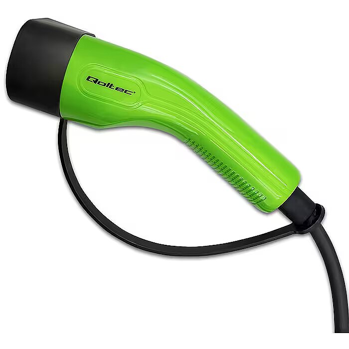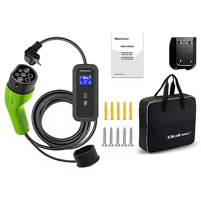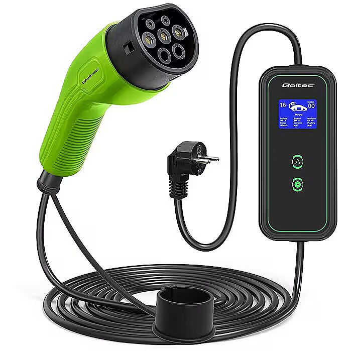 The charger has a Type 2 connector, which is now an official European Union standard, and will charge electric cars equipped with a suitable charging socket. The Type 2 connector is 7 contacts, of which 3 contacts or 5 are for charging and 2 for communication between the station and the car. Compatible with most electric cars sold in Europe. The Qoltec brand charger supports four current modes of 8A, 10A, 13A and 16A. It is worth mentioning that the Type 2 connector is designed for electric vehicles with a charging power of more than 3kW.