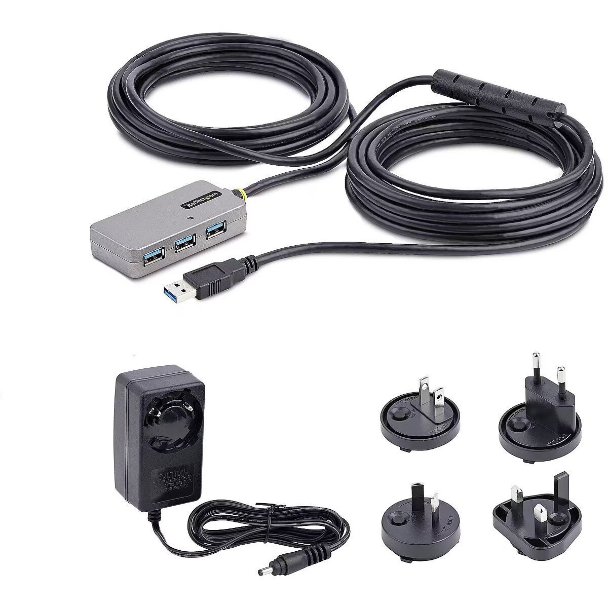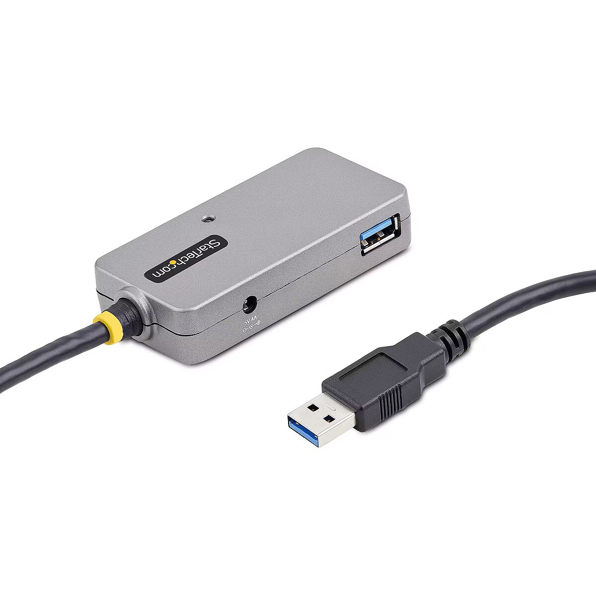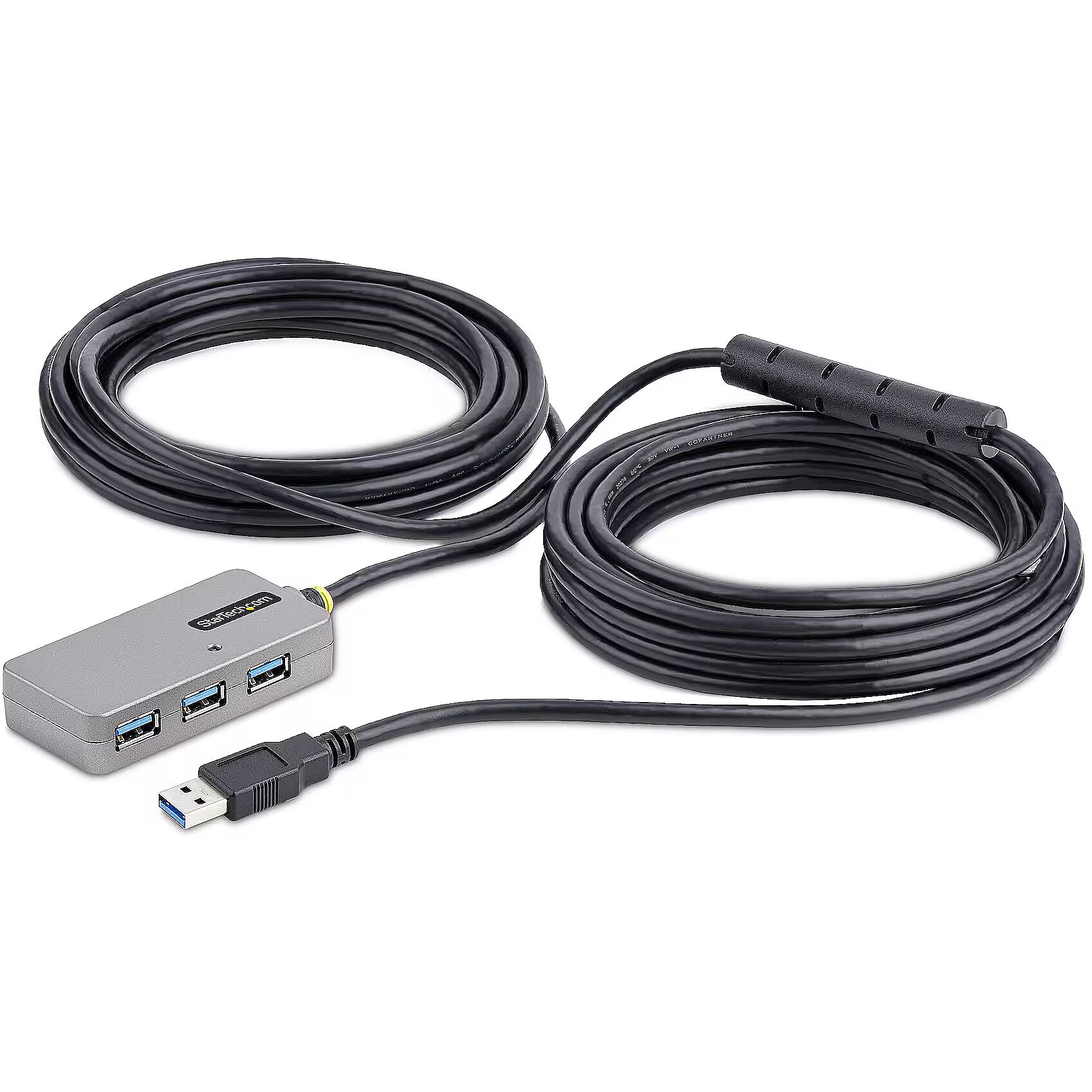 LongDesc - USB Extender Hub | USB 3.0 Extension Cable with 4-Port USB Hub | Bus Powered | 32.8ft Long CableThe 32.8ft USB 3.0 Extension Cable with 4-Port USB Hub and 5Gbps transfer rates enables multiport connectivity at distances that exceed standard USB 3.0 distance and power source limitations. Daisy chain up to two USB active extension cables for a maximum range of 65.6ft (20m).Power OptionsActive electronics allow the USB-A Hub to function without requiring external power, multiplying the installation possibilities and accelerating any deployment. In addition, the 5V4A DC power adapter supports USB peripherals that require additional power.Control multiple USB peripherals in remote locations (e.g., webcams, CCTV remote monitoring, remote printers, SSDs, HDDs, scales, mice, keyboards, and other devices) using this 4-port 32.8ft (10m) USB extension cable.Host and Device CompatibilityThe backward compatibility with USB 2.0 and 1.1 ensures functionality with legacy equipment. The hub/cable features USB 3.0/3.2 Gen 1 with data transfer speeds up to 5 Gbps and plug and play (PnP) setup on any operating system, enabling rapid deployment.The Level-2 ESD protection (4kV air and 4kV contact) and the cable shielding enhance USB device safety and minimize EMI.The USB Extender Hub is backed for two years, including free lifetime 24/5 multi-lingual technical assistance.The StarTech.com Advantage