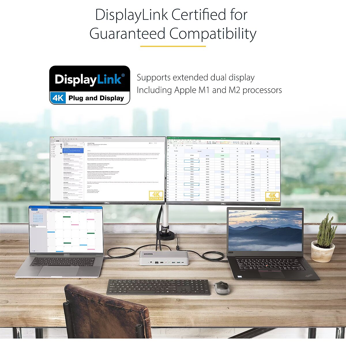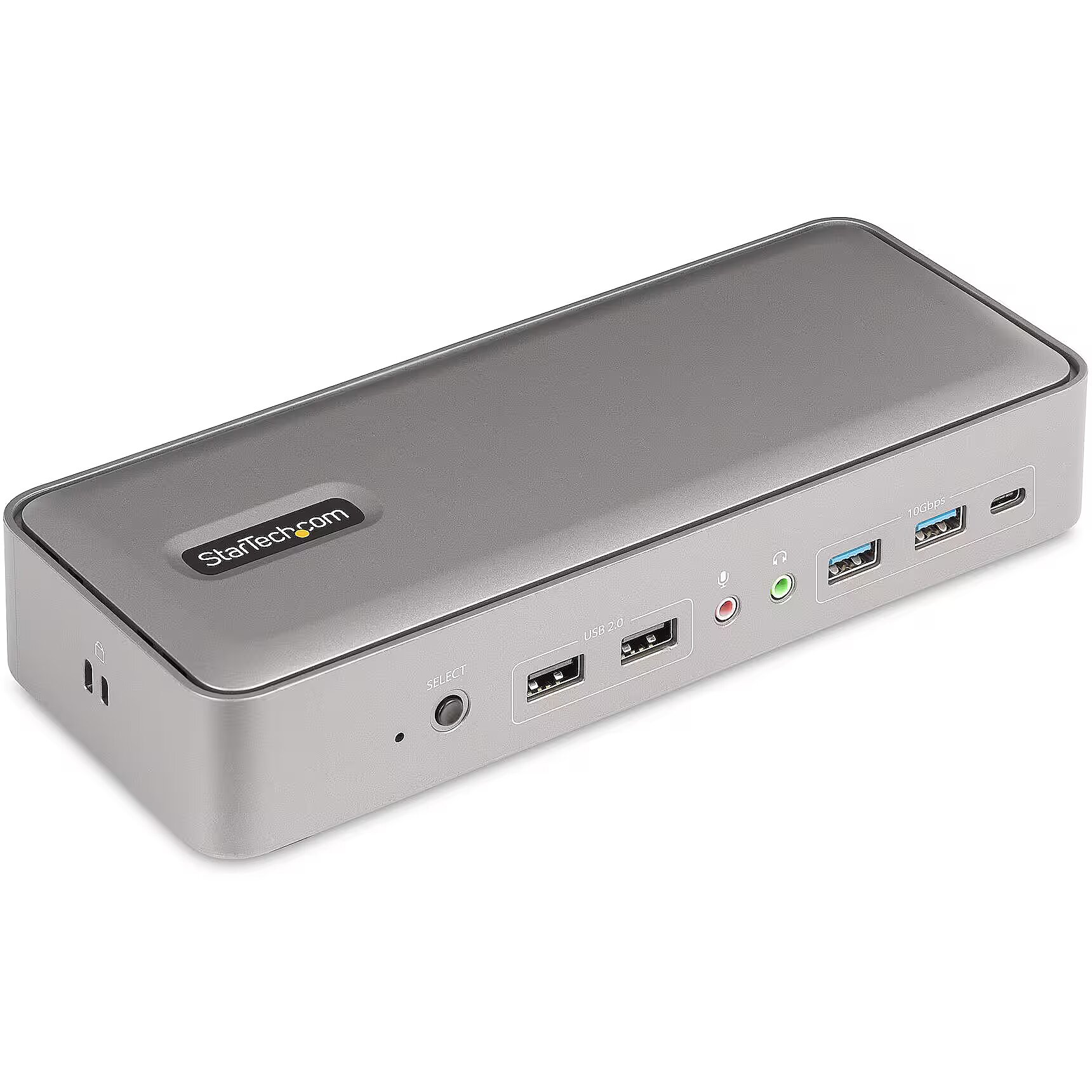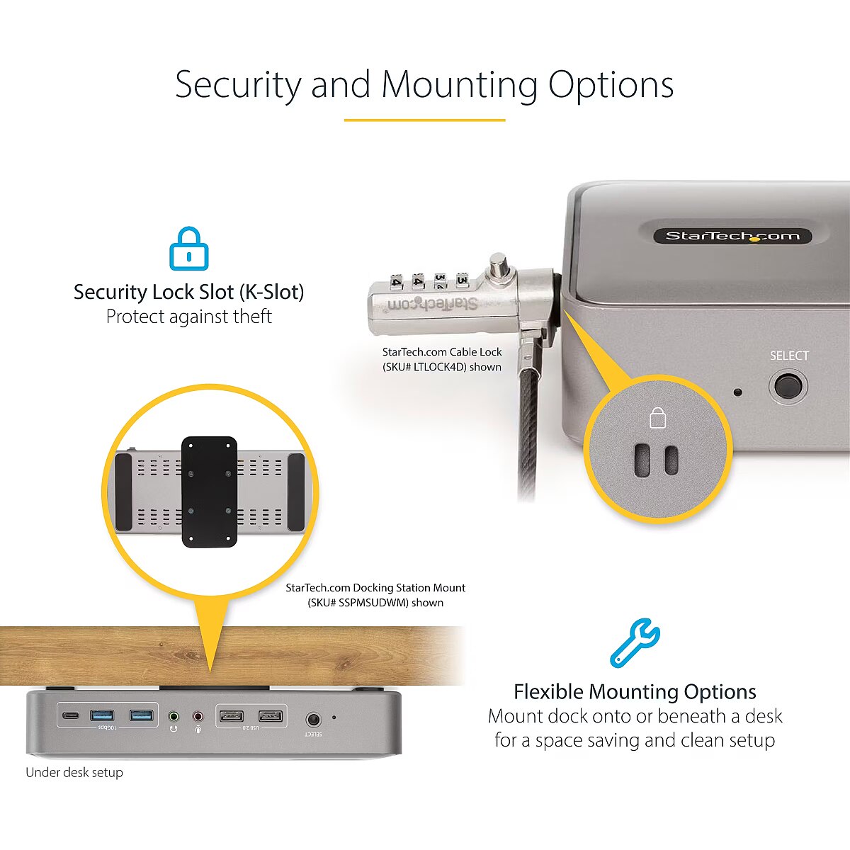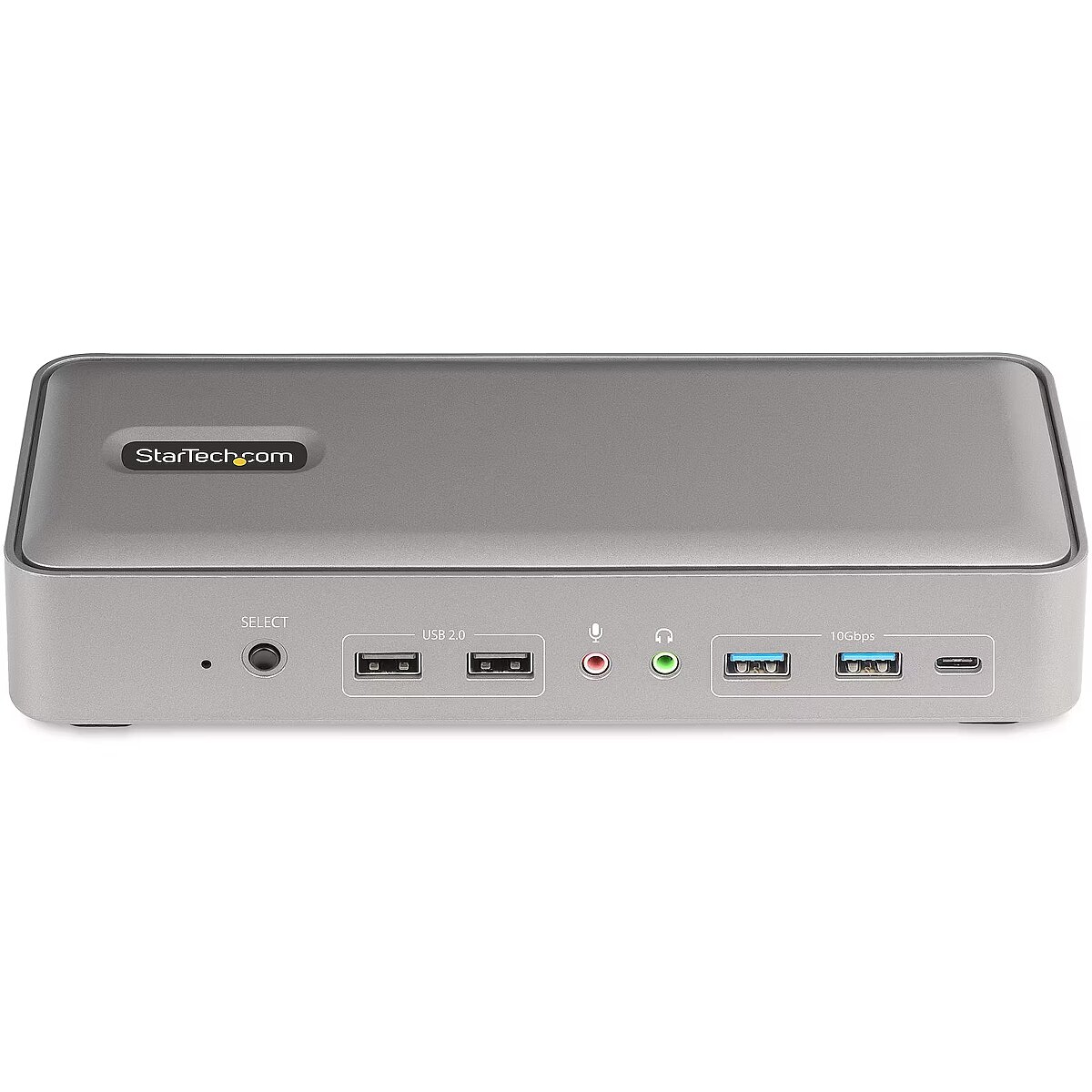 LongDesc - Share a dual 4K 60Hz workstation between two laptop computers through a USB Type-C connectionDock and Switch between two laptops to access your workstation peripherals including dual monitors, seamlessly switching between laptop computers with the push of a button. The downloadable Hot-Key software (available for Windows and macOS), enables users to switch between computers using key combinations from a keyboard.DisplayLink CertifiedThe Dock is DisplayLink Certified, for Plug and Display compatibility with Windows, ChromeOS, and macOS, enabling operation and switching between multiple computers with different operating systems. DisplayLink technology also supports extended dual displays on base Apple M-Series MacBooks, which are not natively capable of driving more than one external display. The DisplayLink Certification ensures support for resolutions up to 4K 60Hz on both external displays.Simultaneously Charge Two LaptopsThe KVM Dock supports Power Delivery (PD) 3.0 and charges both connected computers over USB-C. The Dock supplies 90W of power to the active host computer and 45W of power to the second PC, ensuring both laptops can charge simultaneously.Full-Featured Docking StationConnect two USB-C computers to this Dock to access a wide range of port connectivity, options and features. The Dock features:• 2x DisplayPort ports for dual display output with support for resolutions up to dual 4K 60Hz.• 2x USB-A (USB 2.0 480Mbps) HID ports for USB devices, such as a keyboard and mouse.• 2x USB-A and 1x USB-C (USB 3.2 Gen 2 10Gbps) ports for connecting high speed USB peripherals, such as SSD storage.• 1x Gigabit Ethernet port with WoL (Wake-on-LAN) for a wired Local Area Network (LAN) connection.• 1x 3.5mm 3-position TRRS jack for stereo audio output.• 1x 3.5mm 2-position microphone jack for mono audio input.• 2x K-Slots (regular/nano) to tether the Dock with a cable lock (sold separately) for security.The Dock features a mounting pattern so it can be mounted when paired with StarTech.com mounting accessories (sold separately). Our mounting accessories enable mounting to the VESA pattern on the back of a monitor or to any flat surface. The following mounts are compatible with this product:• SSPMSUDWM - Dock Surface Mount• SSPMSVESA - Dock VESA MountEnhance Productivity and Device Management with the StarTech.com Connectivity Tools ApplicationDeveloped to improve performance and security, StarTech.com Connectivity Tools is the only software suite on the market that works with a wide range of IT connectivity accessories. The software suite includes:•Advanced Windows Layout Utility : Setup and save custom windows layouts.•Mac Address Pass-Through Utility : Improve network security.•USB Event Monitoring Utility : Track and log connected USB devices.•Wi-Fi Auto Switch Utility : Enable users to quickly access faster network speeds via wired LAN.For more information and to download the StarTech.com Connectivity Tools application, please visit: www.StarTech.com/Connectivity-ToolsNote: The StarTechLink software is not compatible with Linux; however, the base hardware KVM functionality is supported. Linux users will not have access to the following software features:• Set Laptop Screen Location for Mouse Cursor/Keyboard Edge Scrolling.• Switch UFP (Upstream Facing Port).• Ctrl-Alt-Del Functionality.• Change Hot-Key for Switching.• KM Master for Mouse Cursor/Keyboard Edge Scrolling.The StarTech.com Advantage