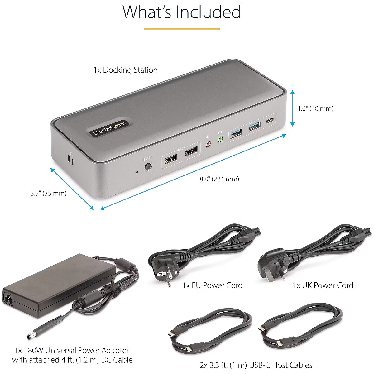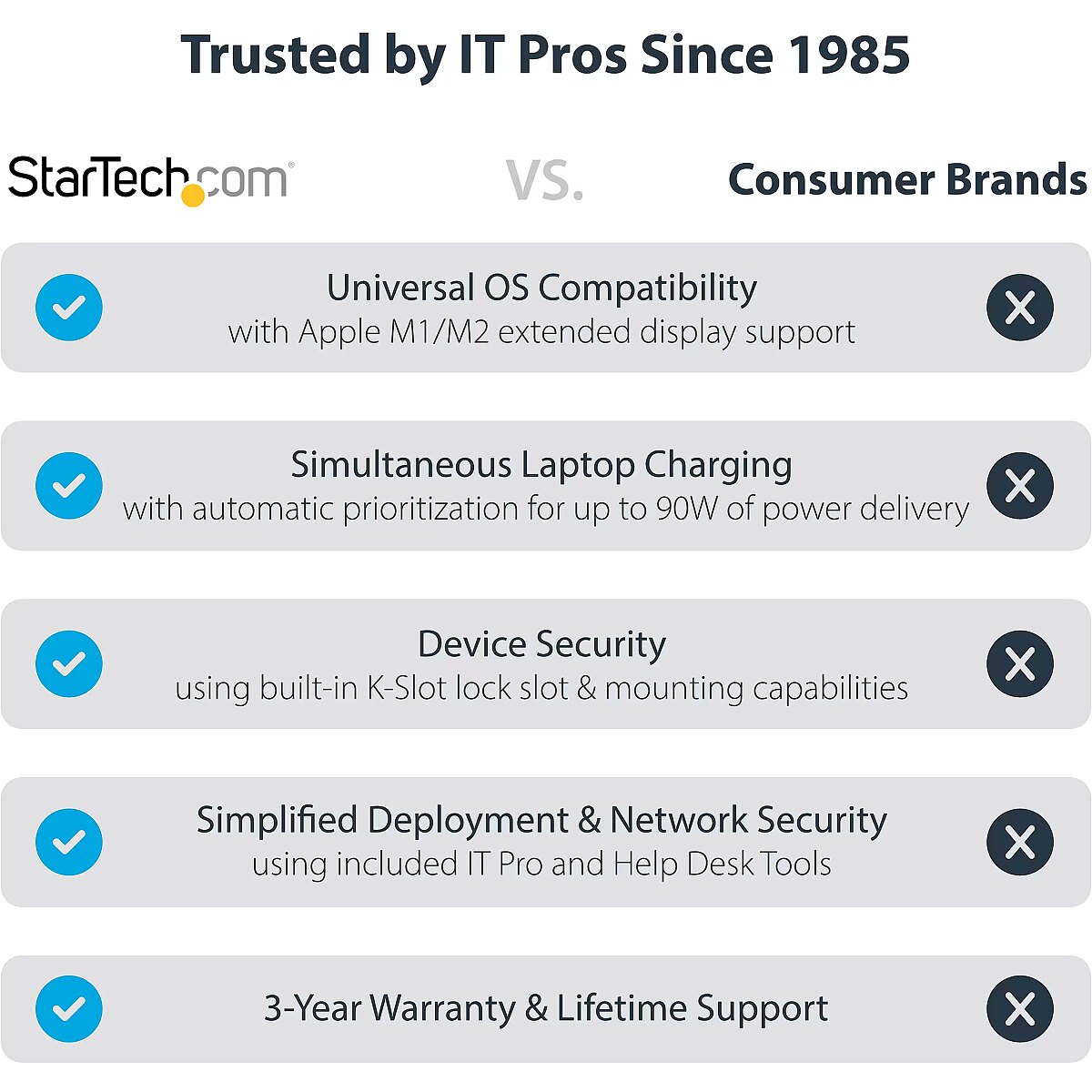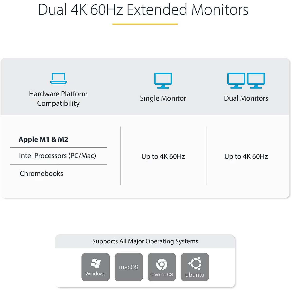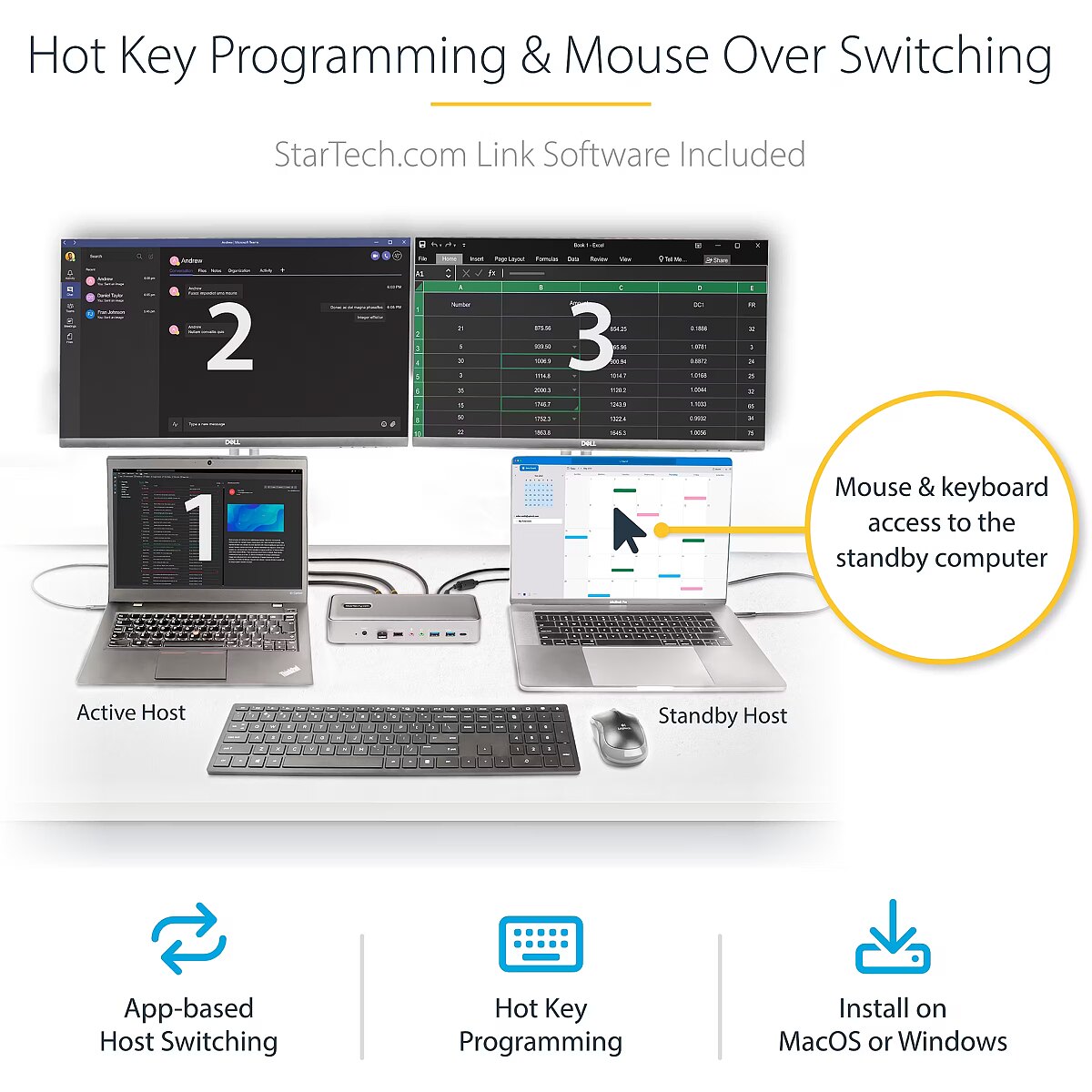 LongDesc - Share a dual 4K 60Hz workstation between two laptop computers through a USB Type-C connectionDock and Switch between two laptops to access your workstation peripherals including dual monitors, seamlessly switching between laptop computers with the push of a button. The downloadable Hot-Key software (available for Windows and macOS), enables users to switch between computers using key combinations from a keyboard.DisplayLink CertifiedThe Dock is DisplayLink Certified, for Plug and Display compatibility with Windows, ChromeOS, and macOS, enabling operation and switching between multiple computers with different operating systems. DisplayLink technology also supports extended dual displays on base Apple M-Series MacBooks, which are not natively capable of driving more than one external display. The DisplayLink Certification ensures support for resolutions up to 4K 60Hz on both external displays.Simultaneously Charge Two LaptopsThe KVM Dock supports Power Delivery (PD) 3.0 and charges both connected computers over USB-C. The Dock supplies 90W of power to the active host computer and 45W of power to the second PC, ensuring both laptops can charge simultaneously.Full-Featured Docking StationConnect two USB-C computers to this Dock to access a wide range of port connectivity, options and features. The Dock features:• 2x DisplayPort ports for dual display output with support for resolutions up to dual 4K 60Hz.• 2x USB-A (USB 2.0 480Mbps) HID ports for USB devices, such as a keyboard and mouse.• 2x USB-A and 1x USB-C (USB 3.2 Gen 2 10Gbps) ports for connecting high speed USB peripherals, such as SSD storage.• 1x Gigabit Ethernet port with WoL (Wake-on-LAN) for a wired Local Area Network (LAN) connection.• 1x 3.5mm 3-position TRRS jack for stereo audio output.• 1x 3.5mm 2-position microphone jack for mono audio input.• 2x K-Slots (regular/nano) to tether the Dock with a cable lock (sold separately) for security.The Dock features a mounting pattern so it can be mounted when paired with StarTech.com mounting accessories (sold separately). Our mounting accessories enable mounting to the VESA pattern on the back of a monitor or to any flat surface. The following mounts are compatible with this product:• SSPMSUDWM - Dock Surface Mount• SSPMSVESA - Dock VESA MountEnhance Productivity and Device Management with the StarTech.com Connectivity Tools ApplicationDeveloped to improve performance and security, StarTech.com Connectivity Tools is the only software suite on the market that works with a wide range of IT connectivity accessories. The software suite includes:•Advanced Windows Layout Utility : Setup and save custom windows layouts.•Mac Address Pass-Through Utility : Improve network security.•USB Event Monitoring Utility : Track and log connected USB devices.•Wi-Fi Auto Switch Utility : Enable users to quickly access faster network speeds via wired LAN.For more information and to download the StarTech.com Connectivity Tools application, please visit: www.StarTech.com/Connectivity-ToolsNote: The StarTechLink software is not compatible with Linux; however, the base hardware KVM functionality is supported. Linux users will not have access to the following software features:• Set Laptop Screen Location for Mouse Cursor/Keyboard Edge Scrolling.• Switch UFP (Upstream Facing Port).• Ctrl-Alt-Del Functionality.• Change Hot-Key for Switching.• KM Master for Mouse Cursor/Keyboard Edge Scrolling.The StarTech.com Advantage