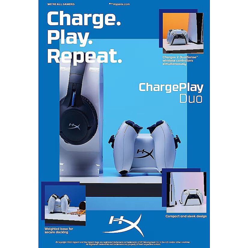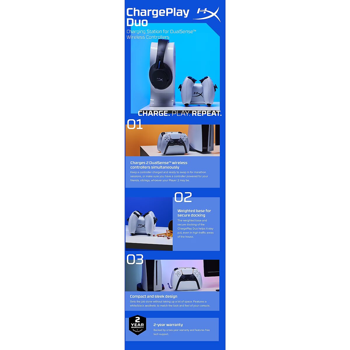 LongDesc - Charge. Play. Repeat.Simultaneously charge two DualSense™ controllers with the HyperX ChargePlay™ Duo. Ensure that you’ll always have a second controller ready for multiplayer or to swap in during marathon gaming sessions.Thischarging station has a stable, weighted base and features a tasteful white/black aesthetic to match the look of your PlayStation 5.