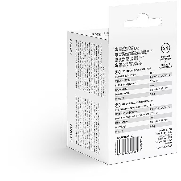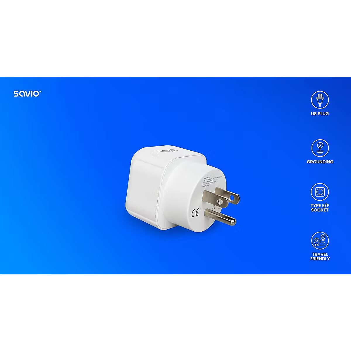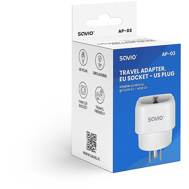 Description - Travel adapter, EU socket - US plug AP-03 The SAVIO AP-03 adapter is a highly practical electronic gadget which enables you to connect devices with an EU plug to US sockets without any problems. With a weight of 50 g and dimensions of 68 x 47 x 47 mm, the adapter is convenient to carry, and the built-in earthing guarantees a stable connection and safety when using the device.   Ultralight, robust and compact design Adaptation of European plugs to American (US) sockets Safety and protection for your devices Why choose a Savio travel adapter? The AP-03 adapter allows you to use European electronic devices in the USA and other countries with an American socket system; Its small size and robustness make it the perfect companion for any journey; The electronic gadget is small in size, lightweight and powerful, making it an excellent choice for those who travel between continents; Designed to connect with hybrid plugs (unischuko) or Europlug; Savio brand travel adapter is suitable for input voltages from 100V - 250V   Configurators   Country of origin:   Poland, Afghanistan, Albania, Algeria, Andorra, Armenia, Aruba, Austria, Azerbaijan, Bhutan, Bosnia and Herzegovina, Bulgaria, Cape Verde, Chad, Croatia, Egypt, Estonia, Ethiopia, Faroe Islands, Finland, Georgia, Greece, Greenland, Guinea, Hungary, Iceland, Indonesia, Iran, Italy, Jordan, Kazakhstan, Kyrgyzstan, Laos, Latvia, Liberia, Lithuania, Luxembourg, Macau, Northern Macedonia, Moldova, Monaco, Mozambique, Myanmar (Burma), Netherlands, Netherlands Antilles, New Caledonia, Germany, Niger, Norway, Paraguay, Portugal, Romania, Russia, Saudi Arabia, Serbia, Montenegro, Slovenia, South Korea, Spain, Suriname, Sweden, Tajikistan, Thailand, East Timor, Turkey, Turkmenistan, Ukraine, Uruguay, Uzbekistan, Belarus.   Destination country:   American Samoa, Anguilla, Antigua and Barbuda, Aruba, Bahamas, Barbados, Belize, Bermuda, Bolivia, British Virgin Islands, Cambodia, Canada, Cayman Islands, China, Colombia, Costa Rica, Cuba, Dominican Republic, Ecuador, El Salvador, Guam, Guatemala, Guyana, Haiti, Honduras, Jamaica, Japan, Democratic People's Republic of Korea, Lao People's Democratic Republic, Lebanon, Liberia, Malaysia, Maldives, Mexico, Micronesia, Federated States, Montserrat, Netherlands Antilles, Nicaragua, Niger, Palau, Panama, Peru, Philippines, Rep, Puerto Rico, Saint Kitts and Nevis, Saint Vincent and the Grenadines, Taiwan, Thailand, Trinidad and Tobago, Turks and Caicos Islands, US Virgin Islands, United States of America/USA, Venezuela, Vietnam, Yemen