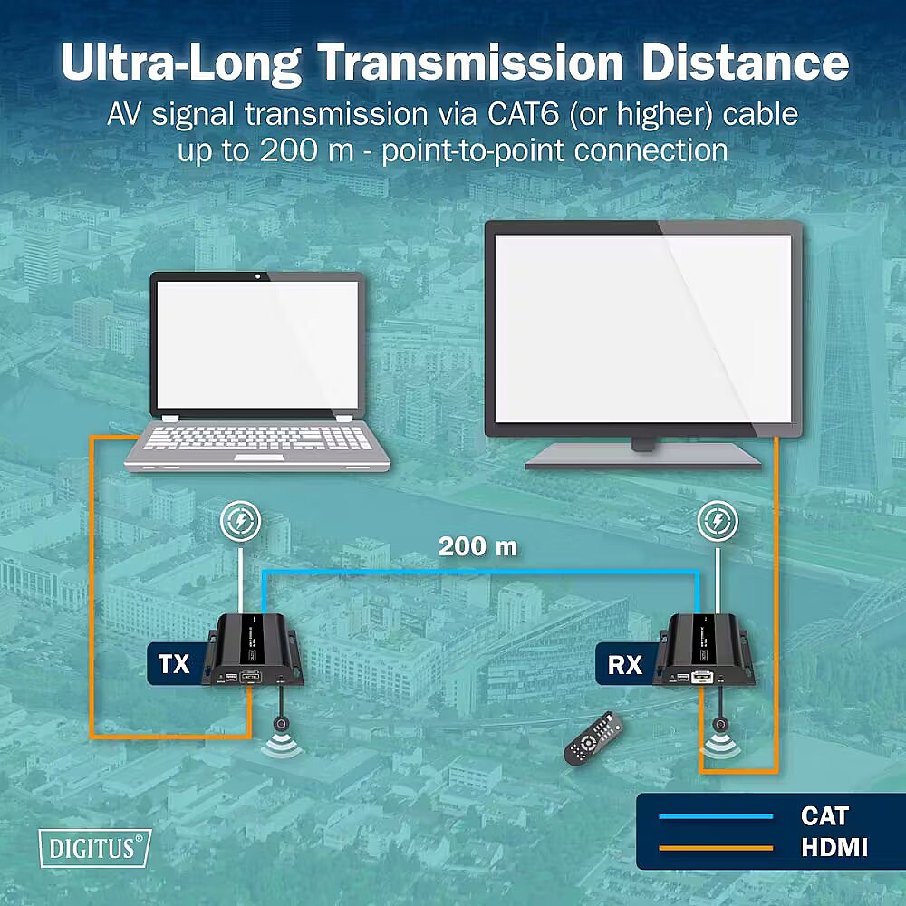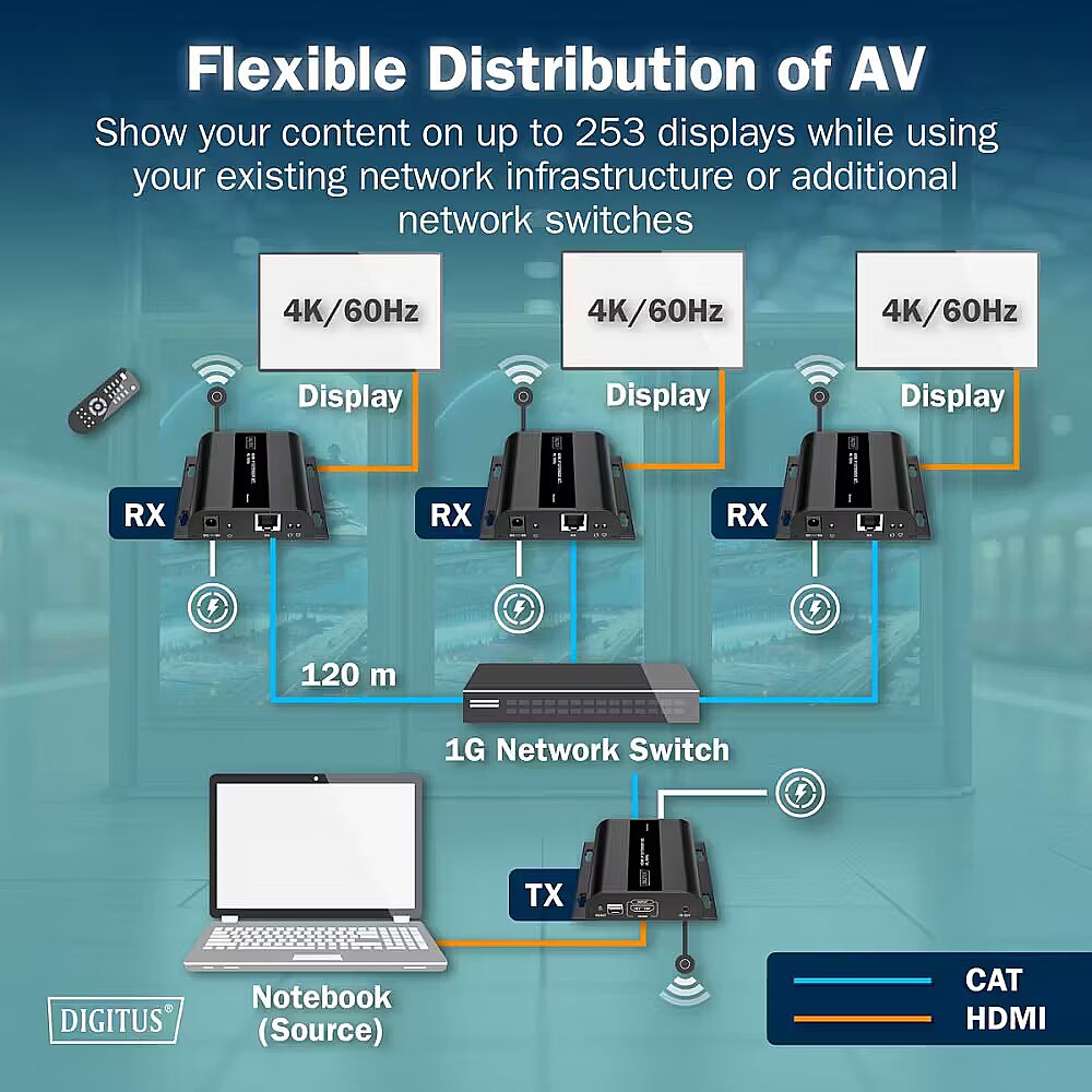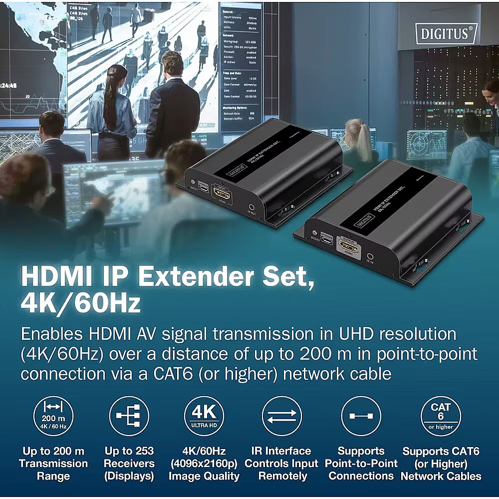 Description - HDMI 4K/60Hz Cat.6 Extender over IP 1G, up to 120m / 200m, max. 253 receivers, IR control - Kit (Transmitter/Receiver) This HDMI IP Extender Set enables UHD (4K/60Hz, 4096×2160p at 60Hz) AV signal transmission over long distances using standard Cat.6 or higher network cables. It supports point-to-point connections up to 200m and point-to-multipoint setups with up to 253 receivers, offering flexible and scalable distribution for professional AV, digital signage, or corporate installations. Key Features: Long-distance transmission: Point-to-point HDMI AV signal via Cat.6 (or higher) cable up to 200m IP scalability: Supports up to 253 receivers (displays) for point-to-multipoint distribution Flexible network use: Leverages existing 1G network infrastructure or additional 1G switches for virtually unlimited signal reach via cascading Expandable system: Additional receivers (RX) available separately (model: DS-55352) High-quality UHD image: 4K/60Hz (4096×2160p) with ultra-low latency of 150220ms for smooth, sharp video IR remote control: Integrated IR interface allows controlling the input source directly from the output display Network cable support: Compatible with Cat.6 or higher cables Wall-mountable: Space-saving installation option This kit combines professional-grade HDMI 4K transmission with maximum flexibility, making it ideal for AV installations, home theaters, or enterprise use.