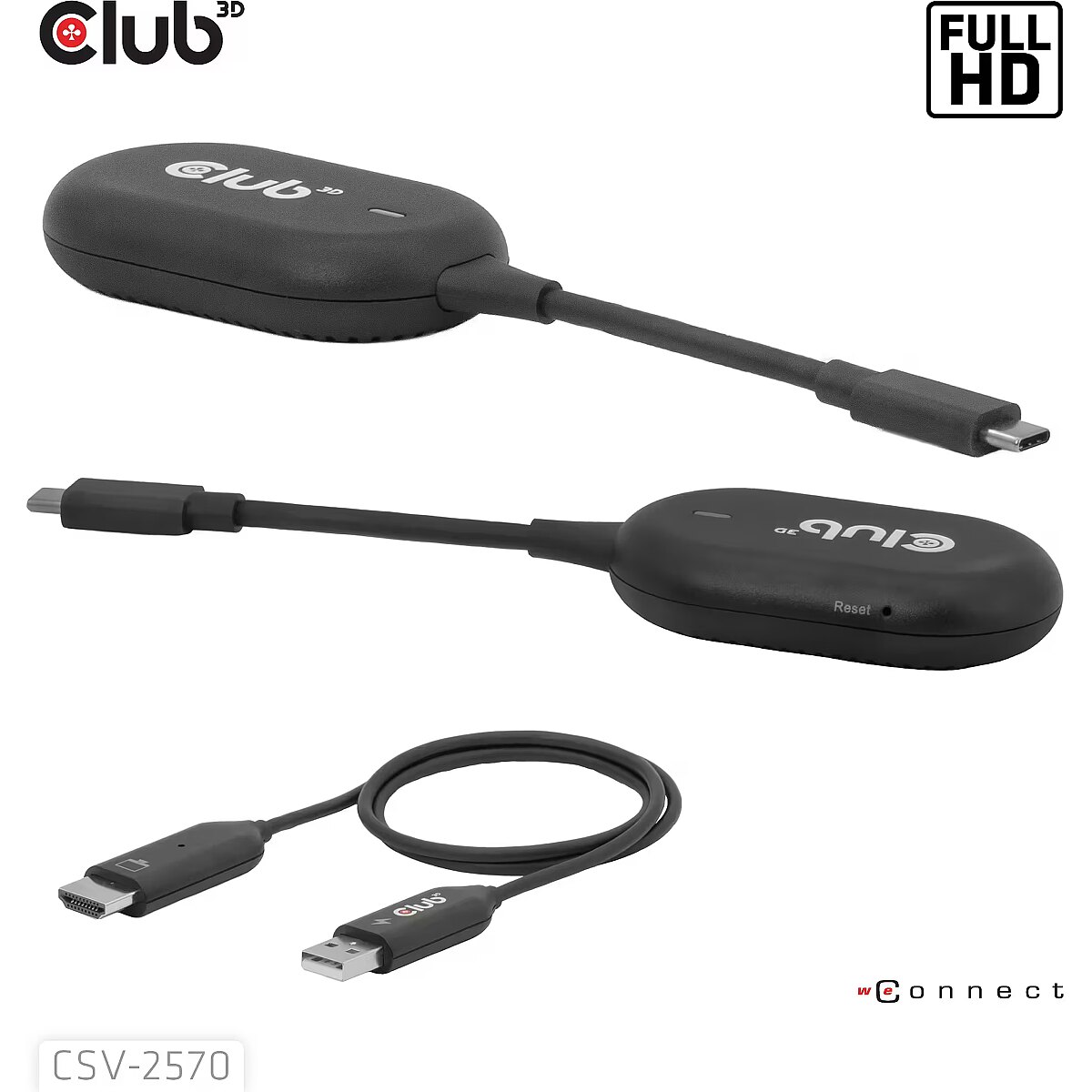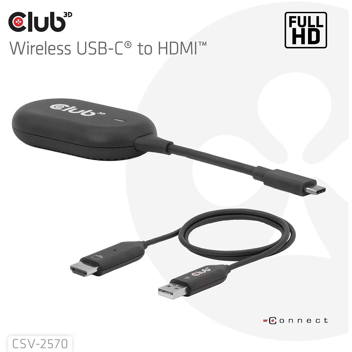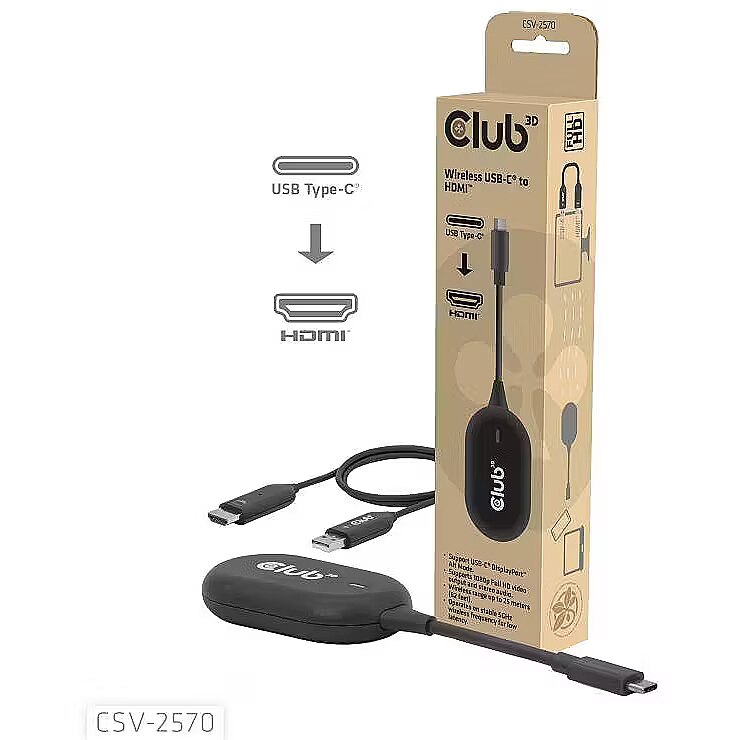 Description - Wireless USB-C® to HDMI™ Transmitter and Receiver FullHD 25m range The Club 3D CSV-2570 is the first wireless HDMI™ device. With a transmitter and receiver, it wirelessly streams FullHD video and audio from USB-C® alt-mode devices to HDMI™ displays. • WIRELESS PRESENTATIONS & ENTERTAINMENT: Stream from your USB-C® laptop, tablet, or phone to any HDMI™ display - ideal for business meetings, classrooms, or watching content on a big screen. • INSTANT SETUP – NO DRIVERS NEEDED: Plug and play with Windows®, macOS®, ChromeOS™, Android™. • FULL HD WIRELESS HDMI™: Delivers smooth 1080p video and audio transmission up to 25 meters with low latency over a reliable 5GHz wireless connection. • POWERED BY USB-A (5V): Just plug the receiver into an HDMI™ port and a USB-A port on your TV or projector - no external power brick needed.