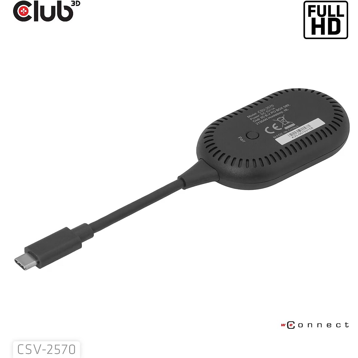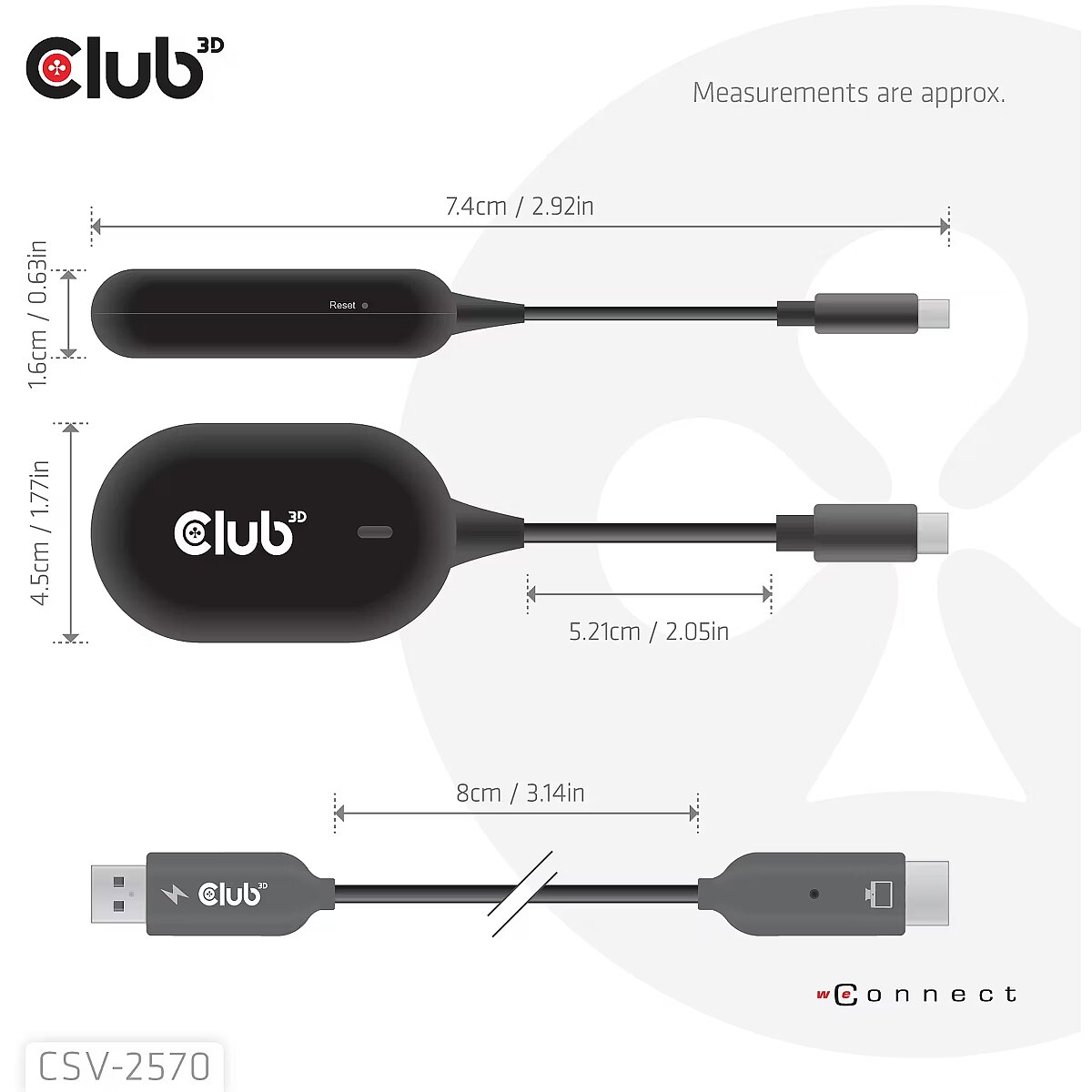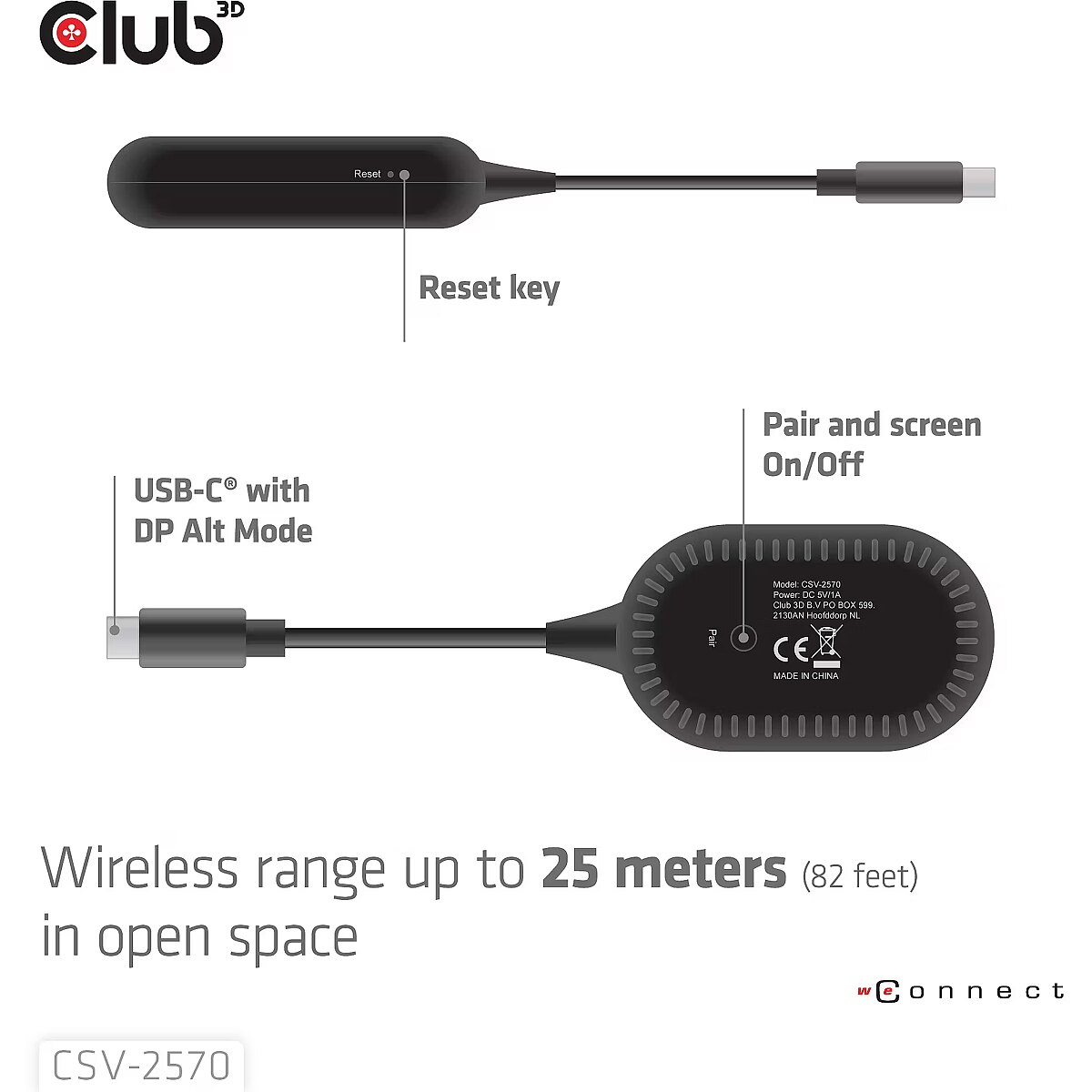Description - Wireless USB-C® to HDMI™ Transmitter and Receiver FullHD 25m range The Club 3D CSV-2570 is the first wireless HDMI™ device. With a transmitter and receiver, it wirelessly streams FullHD video and audio from USB-C® alt-mode devices to HDMI™ displays. • WIRELESS PRESENTATIONS & ENTERTAINMENT: Stream from your USB-C® laptop, tablet, or phone to any HDMI™ display - ideal for business meetings, classrooms, or watching content on a big screen. • INSTANT SETUP – NO DRIVERS NEEDED: Plug and play with Windows®, macOS®, ChromeOS™, Android™. • FULL HD WIRELESS HDMI™: Delivers smooth 1080p video and audio transmission up to 25 meters with low latency over a reliable 5GHz wireless connection. • POWERED BY USB-A (5V): Just plug the receiver into an HDMI™ port and a USB-A port on your TV or projector - no external power brick needed.