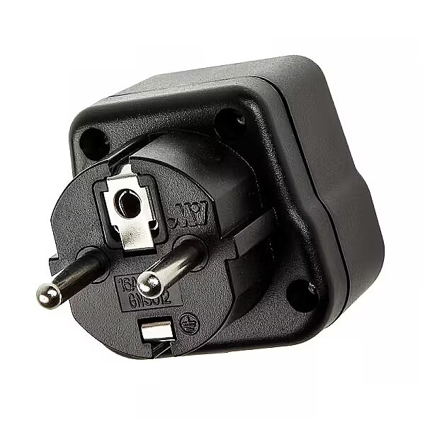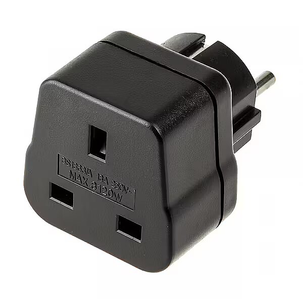 Technical_details - Adapter enabling electrical equipment using the British plug system to be used in countries using an earthed socket system, e.g. D, F, B, CZ, PL, NL, E, P, S, FI, N, GR, TR, A, ... This travel adapter is not a transformer or a frequency converter. Design Black