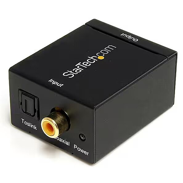 LongDesc - Convert a Digital Coax or Toslink Signal to Stereo RCA AudioThe SPDIF2AA Toslink/Optical SPDIF to RCA Audio Converter lets you convert a 2-channel Digital Coaxial or Toslink/Optical SPDIF input signal into an RCA analog stereo output.Perfect for home and professional audio applications, this SPDIF to RCA audio converter saves the cost of upgrading equipment for compatible connections, and offers separate Digital Coax and Toslink inputs for dual-function conversion. The small form factor design makes it suitable for installation into virtually any location, regardless of space constraints, while still providing a lossless audio signal. Plus, the digital coaxial or Toslink to RCA converter supports plug-and-play installation, saving you time and hassle.Backed by a StarTech.com 2-year warranty and free lifetime technical support.The StarTech.com Advantage- Support for Digital Coax or Toslink to RCA conversion offers versatility and saves the cost of hardware upgrades that would otherwise be needed for compatiblity- Compact form-factor makes the device easy to transport and fit into almost any installation space