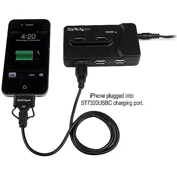 LongDesc - Add 2x USB 3.2 Gen 1 and 4x USB 2.0 ports to a computer, externally through a single USB 3.2 Gen 1 connectionThe ST7320USBC 6-Port USB 3.2 Gen 1/2.0 Combo Hub features a special high-output dedicated charging port which enables you to charge USB devices by providing up to 2A of power, or it can add 2x USB 3.2 Gen 1 and 4x USB 2.0 ports to a computer through a single USB 3.2 Gen 1 host connection.The hub includes an external power adapter, which when connected enables charging some portable electronic devices (e.g. an iPhone® or other Smartphone), even without a USB connection to a host computer.Offering a unique design that features USB ports along 3 sides of the hub, as well as a combination of USB 2.0 and 3.0 ports, this versatile and flexible USB hub is ideal for both laptop and desktop computers.The ST7320USBC USB 3.2 Gen 1/2.0 hub is backed by a StarTech.com 2-year warranty and free lifetime technical support.The StarTech.com Advantage