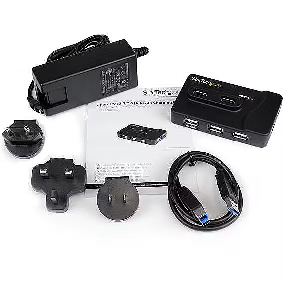 LongSummaryDescription - StarTech.com 6 Port USB 3.0 / USB 2.0 Combo Hub with 2A Charging Port – 2x USB 3.0 & 4x USB 2.0. Host interface: USB 3.2 Gen 1 (3.1 Gen 1) Type-B, Hub interfaces: USB 3.2 Gen 1 (3.1 Gen 1) Type-A. Data transfer rate: 4800 Mbit/s, Product colour: Black, Housing material: Plastic. Power supply type: DC, Power consumption (typical): 20 W, Input voltage: 100 - 240 V. Width: 60 mm, Depth: 99 mm, Height: 20 mm. Package width: 120 mm, Package depth: 140 mm, Package height: 82 mm