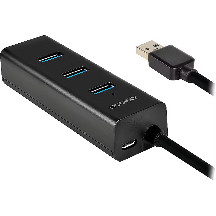 LongDesc - The four port AXAGON HUE-S2B USB 3.0 hub with optional external power and fast charging support on all ports.A lightweight small hub with elegant, matte plastic body connects quickly and easily up to four USB devices to your PC at one time.A great advantage is the possibility of external power supply from any mobile device charger with a micro USB connector. The unused charger thus makes this USB hub a fast-charging hub for free.Mobile phones, tablets, power banks and other devices can be charged up to 2A (depends on the charger used) in any hub port thanks to the USB Battery Charging 1.2 support.Supports charging of iPad tablets even without auxiliary power supply with approx. 1A (iPad mostly cannot be charged directly from the USB 3.0 ports on the PC).It can even handle permanent connection of several external disks without external hub power. When external power supply is connected, you can even work with three external disks at one time.The USB ports located across the hub body with sufficient spacing ensure seamless direct connection of large USB devices.A permanently attached USB cable with a sufficient length of 30 cm is ideal for use with laptops.It can also work as a separate charging hub and charge the USB devices from the power adapter even when the PC is turned off or disconnected.Features:• 4 downstream USB 3.0 ports with enough space around the connectors.• an upstream USB 3.0 port with USB Type A male connector on a 30 cm long permanently attached cable.• Compatible with USB 3.0 and backward compatible with USB 2.0 and USB 1.1.• Supports transmission rates 1.5 / 12 / 480 / 5000 Mb/s (low / full / high / super speed).• Supports USB Battery Charging v 1.2 specification.• Each hub port can be used to charge up to 2 A (with an external USB charger - not included).• Possibility to connect your device while running thanks to the Hot Plug support.• Full Plug and Play support.• LED indication of hub connection to power supply.• Current overload detection and protection.• Hub dimensions 96 x 32 x 22 mm.• Hub weight 48 g (incl. cable).The hub power mode via USB cable (bus power):• The USB bus power is sufficient to connect the USB device with a low power consumption (mouse, keyboard, card reader, flash disk, etc.) or own power supply (printer, scanner, 3.5" external disk) to all four ports.• In this power mode, the USB hub is also able to cope with up to two magnetic 2.5" external disks simultaneously.• Charging of mobile devices (including iPads) is also possible in this power mode, however, the charging current is only 0.9 A, in some cases 1 A (depending on the computer).The hub power mode via USB charger - not included (self power):• Any mobile device charger with micro USB connector (recommended output current of the charger 2A) can be used.• In this power mode, the USB hub is able to cope with three magnetic 2.5" external disks. However, we recommend that you connect max. two external 2.5" disks simultaneously for reliable long-term hub operation.• Fast charging of mobile devices (including iPads) up to 2A in each of the hub ports. The total current supplied by the hub during charging is limited by the output current of the external power adapter.Independent charging hub mode without being connected to the PC (charging hub):• After disconnecting the connected PC or without being connected to the PC the hub works with power supply via USB charger as a separate charging USB hub.• Fast charging of mobile devices (including iPads) up to 2A in each of the hub ports. The total current supplied by the hub during charging is limited by the output current of the external power adapter.OS support:• MS Windows XP / Vista / 7 / 8 / 8.1 / 10 and later, Windows Server 2003 / 2008 / 2012 / 2016 and later (supported are all 32- and 64-bit Windows OS versions), Mac OS X 10.4.x and higher, Linux with kernel 2.6.x and above.• Note: Drivers are included with supported operating systems and are installed completely automatically. No other drivers need to be installed and are not even available. Package contains:• USB 3.0 hub with permanently connected 30 cm long cable,• packed in a cardboard box with clearly indicated parameters and installation procedure.