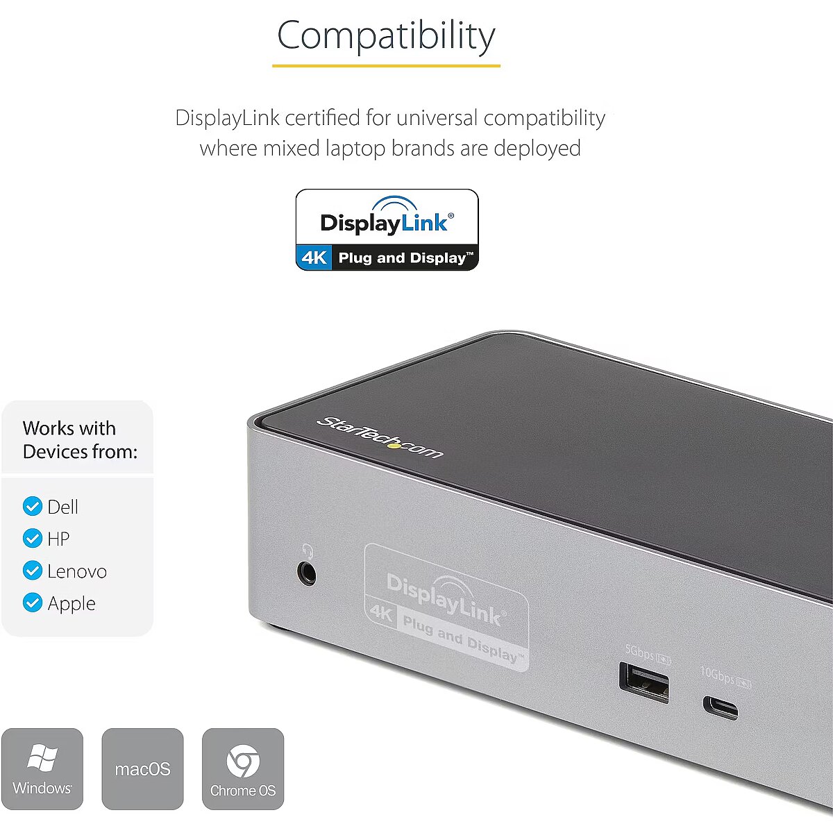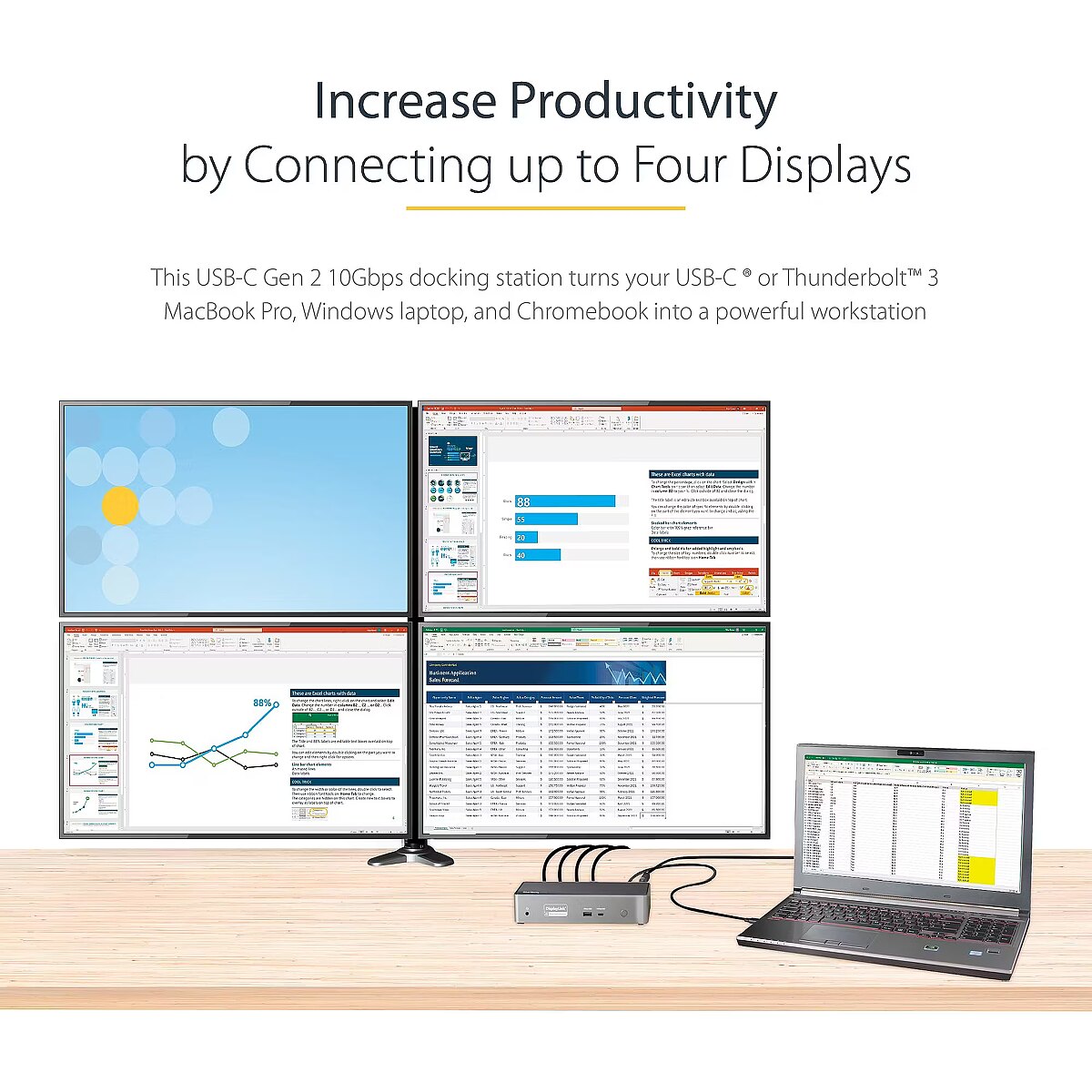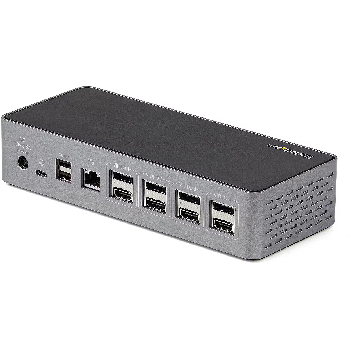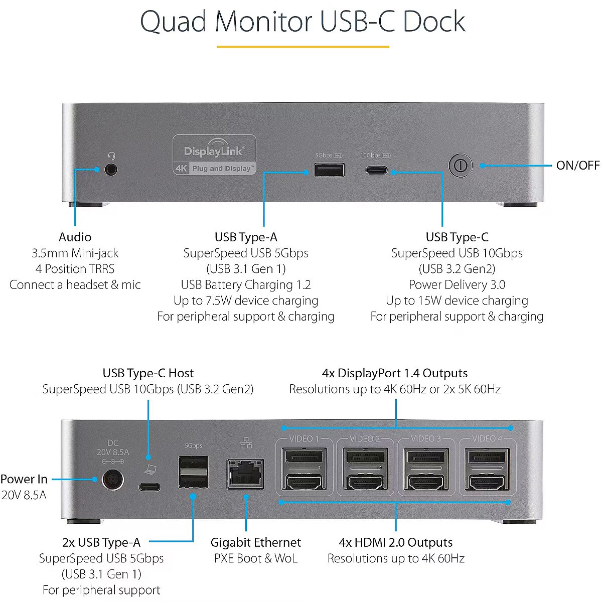 LongDesc - USB-C & USB-A Dock | USB 3.2 Gen 2 10Gbps | 4K 60HZ HDMI | 4K 60Hz DisplayPort | 100W Power DeliveryThis USB-C Gen 2 10Gbps docking station turns your USB-C ® or Thunderbolt™ 3 MacBook Pro, Windows laptop, and Chromebook into a powerful workstation. A USB 3.2 Gen 2 Type-C dock features everything you need, from quad HDMI or DisplayPort video outputs up to 4K 60 Hz to 10Gbps USB-C & USB-A downstream peripheral ports to 100W Power Delivery.HDMI & DisplayPort for Four Monitor OutputsThis USB-C Gen 2 docking station with DP 1.2 and HDMI 2.0 HDR support, is a perfect choice for dual, triple, or quad monitor setup, supporting up to quad 4K 60Hz display output, with any combination of four DisplayPort or HDMI video interfaces, on USB-C Gen 2 laptops, MacBooks (including M1 based systems) and Windows-based Thunderbolt 3 laptops.Display & Resolution Specs:Quad 4K DisplayPort | Up to 3840 x 2160p @ 60HzQuad 4K HDMI | Up to 3840 x 2160p @ 60HzQuad 4K (Mix of DP & HDMI) | Up to 3840 x 2160p @ 60HzDual 5K DisplayPort* | Up to 5120 × 2880Single 5K DisplayPort* | Up to 5120 × 2880 + Dual 4K HDMI/DisplayPort | Up to 3840 x 2160p @ 60Hz*Requires monitor support for 5K and uses two DP ports for one 5K display connectionPower & Charge with 100W Power DeliveryPower and charge USB-C/Thunderbolt 3 workstation laptops & ultrabooks with 100 watt PD. Higher power delivery, more than other USB-C 10Gbps quad monitor docks.Charge smartphones and other high powered devices with two downstream front-facing charging ports with BC 1.2 for USB-A and USB-C devices. Fast-charge ports support always-on charging so devices will charge whether or not a host laptop is connected.Plenty of Downstream USB PortsThis USB-C Gen 2 docking station features 4 downstream USB ports in total to connect USB peripherals.• 1x USB-C 3.2 Gen 2 (10 Gbps | 15W/3A)• 1x USB-A 3.2 Gen 1 (5 Gbps | 7.5W/1.5A)• 2x USB-A 3.2 Gen 1 (5 Gbps | 4.5W/0.9A)Also included, is a gigabit Ethernet port with PXE Boot and WoL support, as well as 4-position TRRS stereo audio headset/mic port.Additional Security FeaturesThis USB-C docking station comes with plenty of security features a K-slot for a Kensington style laptop lock and holes to mount the dock on the desk or wall and includes a USB-IF Certified 1m USB-C cable.Extra VentilationUSB-C dock features optimized ventilation on both ends and bottom side of dock to provide cooling support to higher temperature thermals that can be generated by high performance video/graphics applications and multiple 4K 60Hz video outputs.Enhance Productivity and Device Management with the StarTech.com Connectivity Tools ApplicationDeveloped to improve performance and security, StarTech.com Connectivity Tools is the only software suite on the market that works with a wide range of IT connectivity accessories. The software suite includes:•Advanced Windows Layout Utility : To setup and save custom windows layouts.•Mac Address Pass-Through Utility : To improve network security.•USB Event Monitoring Utility : To track and log connected USB devices•Wi-Fi Auto Switch Utility : Enabling users to quickly access faster network speeds via wired LAN.For more information and to download the StarTech.com Connectivity Tools application, please visit: www.StarTech.com/Connectivity-ToolsThe StarTech.com Advantage