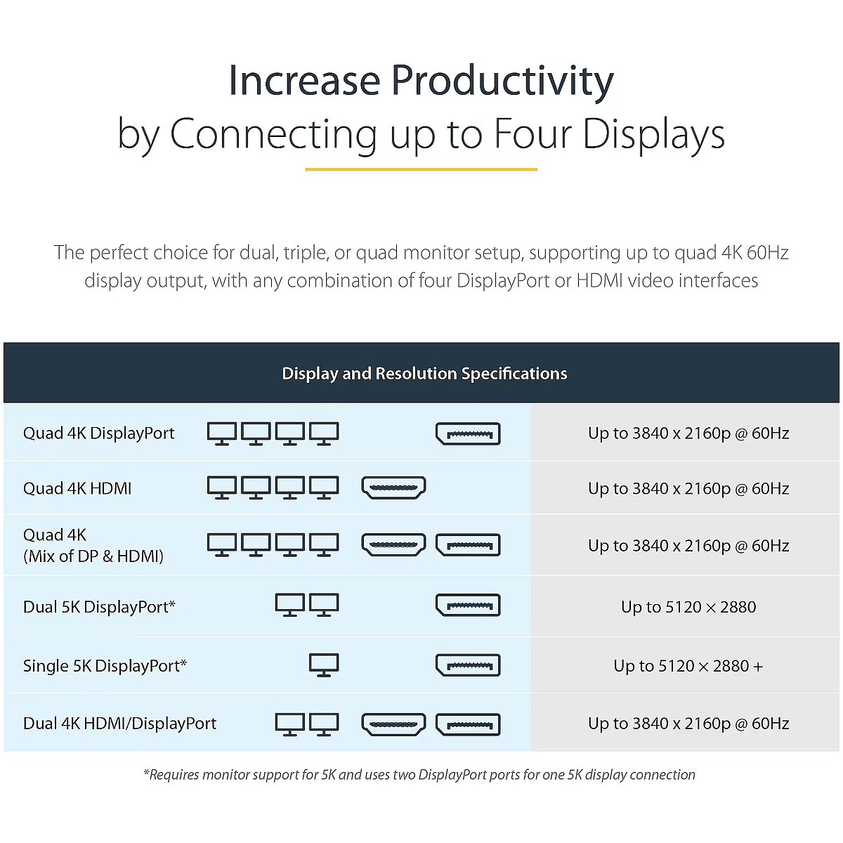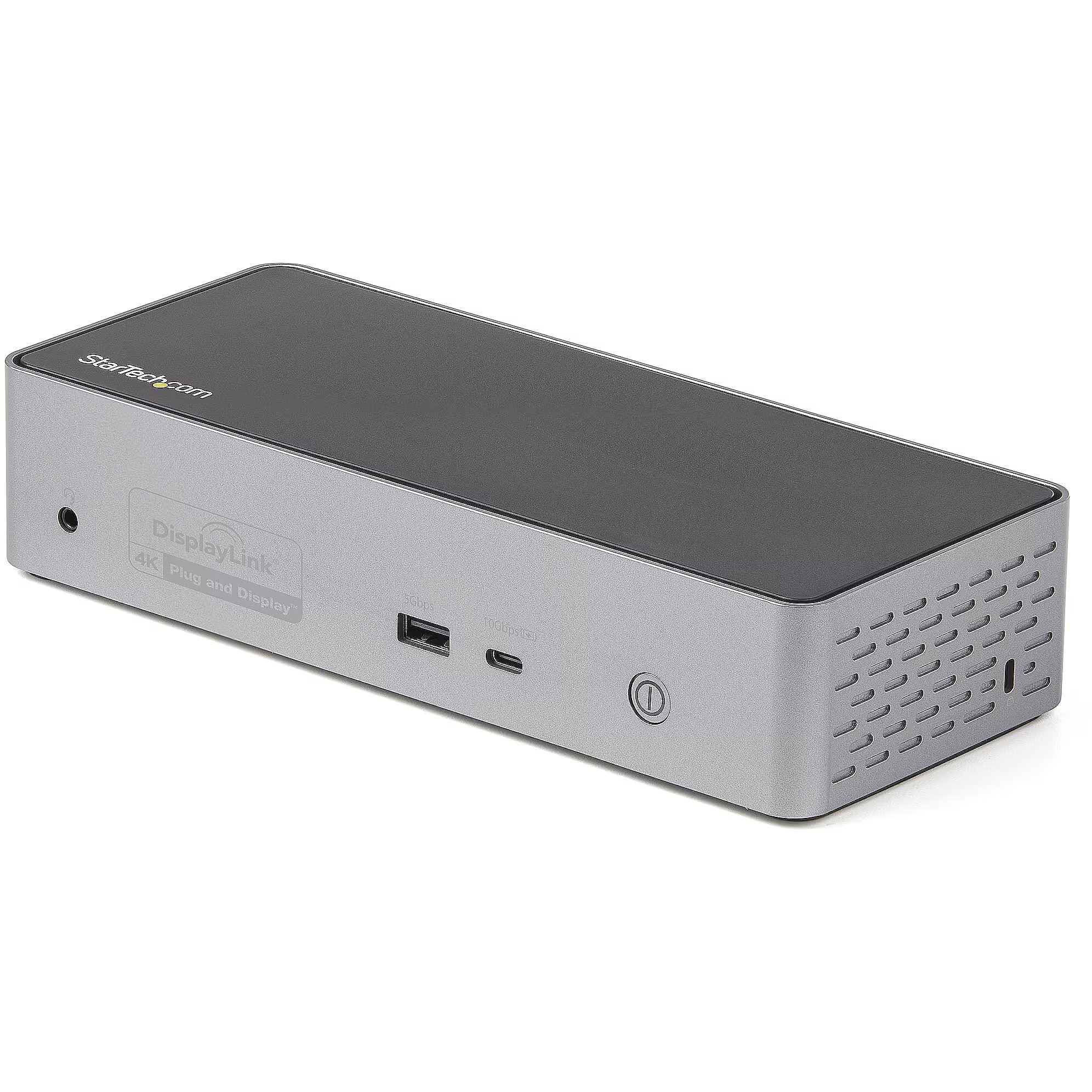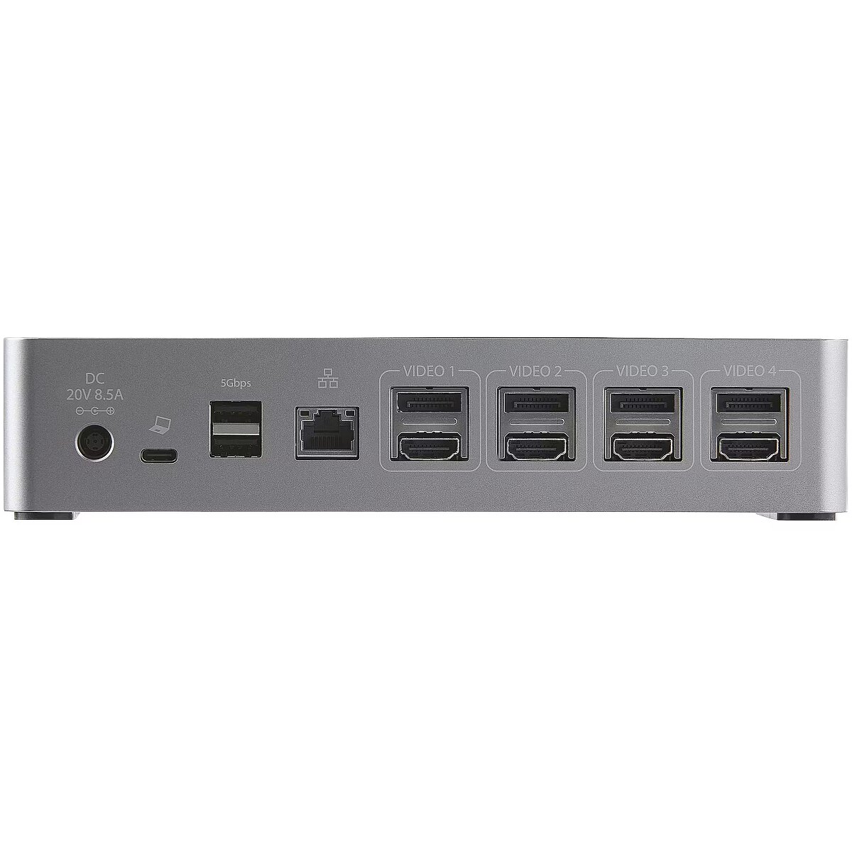 LongDesc - USB-C & USB-A Dock | USB 3.2 Gen 2 10Gbps | 4K 60HZ HDMI | 4K 60Hz DisplayPort | 100W Power DeliveryThis USB-C Gen 2 10Gbps docking station turns your USB-C ® or Thunderbolt™ 3 MacBook Pro, Windows laptop, and Chromebook into a powerful workstation. A USB 3.2 Gen 2 Type-C dock features everything you need, from quad HDMI or DisplayPort video outputs up to 4K 60 Hz to 10Gbps USB-C & USB-A downstream peripheral ports to 100W Power Delivery.HDMI & DisplayPort for Four Monitor OutputsThis USB-C Gen 2 docking station with DP 1.2 and HDMI 2.0 HDR support, is a perfect choice for dual, triple, or quad monitor setup, supporting up to quad 4K 60Hz display output, with any combination of four DisplayPort or HDMI video interfaces, on USB-C Gen 2 laptops, MacBooks (including M1 based systems) and Windows-based Thunderbolt 3 laptops.Display & Resolution Specs:Quad 4K DisplayPort | Up to 3840 x 2160p @ 60HzQuad 4K HDMI | Up to 3840 x 2160p @ 60HzQuad 4K (Mix of DP & HDMI) | Up to 3840 x 2160p @ 60HzDual 5K DisplayPort* | Up to 5120 × 2880Single 5K DisplayPort* | Up to 5120 × 2880 + Dual 4K HDMI/DisplayPort | Up to 3840 x 2160p @ 60Hz*Requires monitor support for 5K and uses two DP ports for one 5K display connectionPower & Charge with 100W Power DeliveryPower and charge USB-C/Thunderbolt 3 workstation laptops & ultrabooks with 100 watt PD. Higher power delivery, more than other USB-C 10Gbps quad monitor docks.Charge smartphones and other high powered devices with two downstream front-facing charging ports with BC 1.2 for USB-A and USB-C devices. Fast-charge ports support always-on charging so devices will charge whether or not a host laptop is connected.Plenty of Downstream USB PortsThis USB-C Gen 2 docking station features 4 downstream USB ports in total to connect USB peripherals.• 1x USB-C 3.2 Gen 2 (10 Gbps | 15W/3A)• 1x USB-A 3.2 Gen 1 (5 Gbps | 7.5W/1.5A)• 2x USB-A 3.2 Gen 1 (5 Gbps | 4.5W/0.9A)Also included, is a gigabit Ethernet port with PXE Boot and WoL support, as well as 4-position TRRS stereo audio headset/mic port.Additional Security FeaturesThis USB-C docking station comes with plenty of security features a K-slot for a Kensington style laptop lock and holes to mount the dock on the desk or wall and includes a USB-IF Certified 1m USB-C cable.Extra VentilationUSB-C dock features optimized ventilation on both ends and bottom side of dock to provide cooling support to higher temperature thermals that can be generated by high performance video/graphics applications and multiple 4K 60Hz video outputs.Enhance Productivity and Device Management with the StarTech.com Connectivity Tools ApplicationDeveloped to improve performance and security, StarTech.com Connectivity Tools is the only software suite on the market that works with a wide range of IT connectivity accessories. The software suite includes:•Advanced Windows Layout Utility : To setup and save custom windows layouts.•Mac Address Pass-Through Utility : To improve network security.•USB Event Monitoring Utility : To track and log connected USB devices•Wi-Fi Auto Switch Utility : Enabling users to quickly access faster network speeds via wired LAN.For more information and to download the StarTech.com Connectivity Tools application, please visit: www.StarTech.com/Connectivity-ToolsThe StarTech.com Advantage