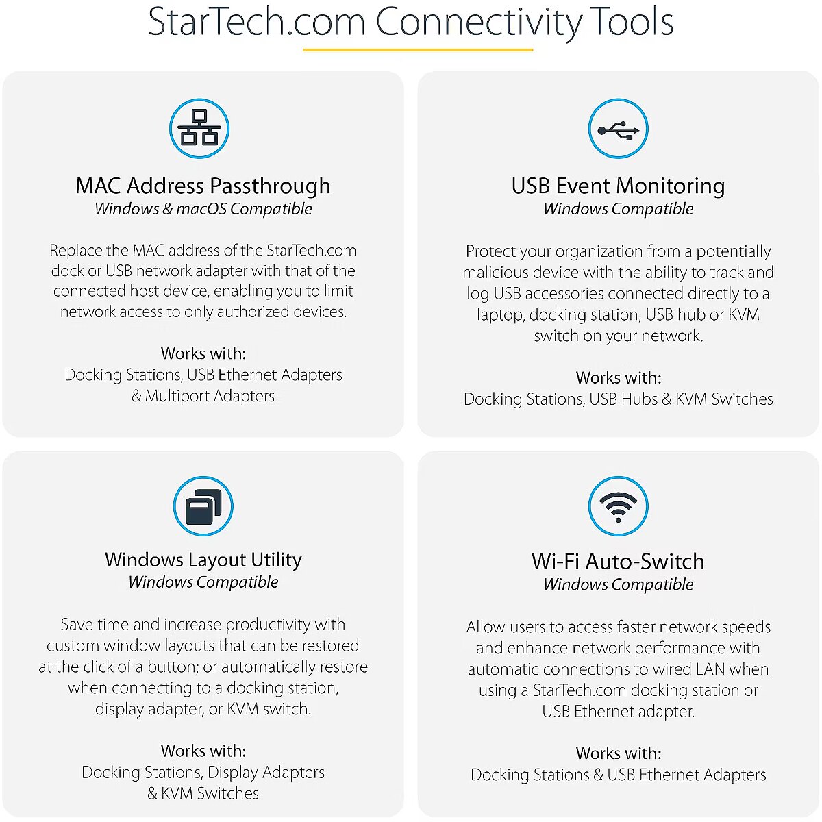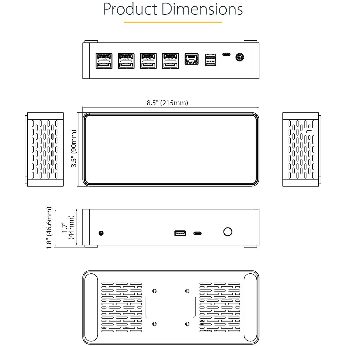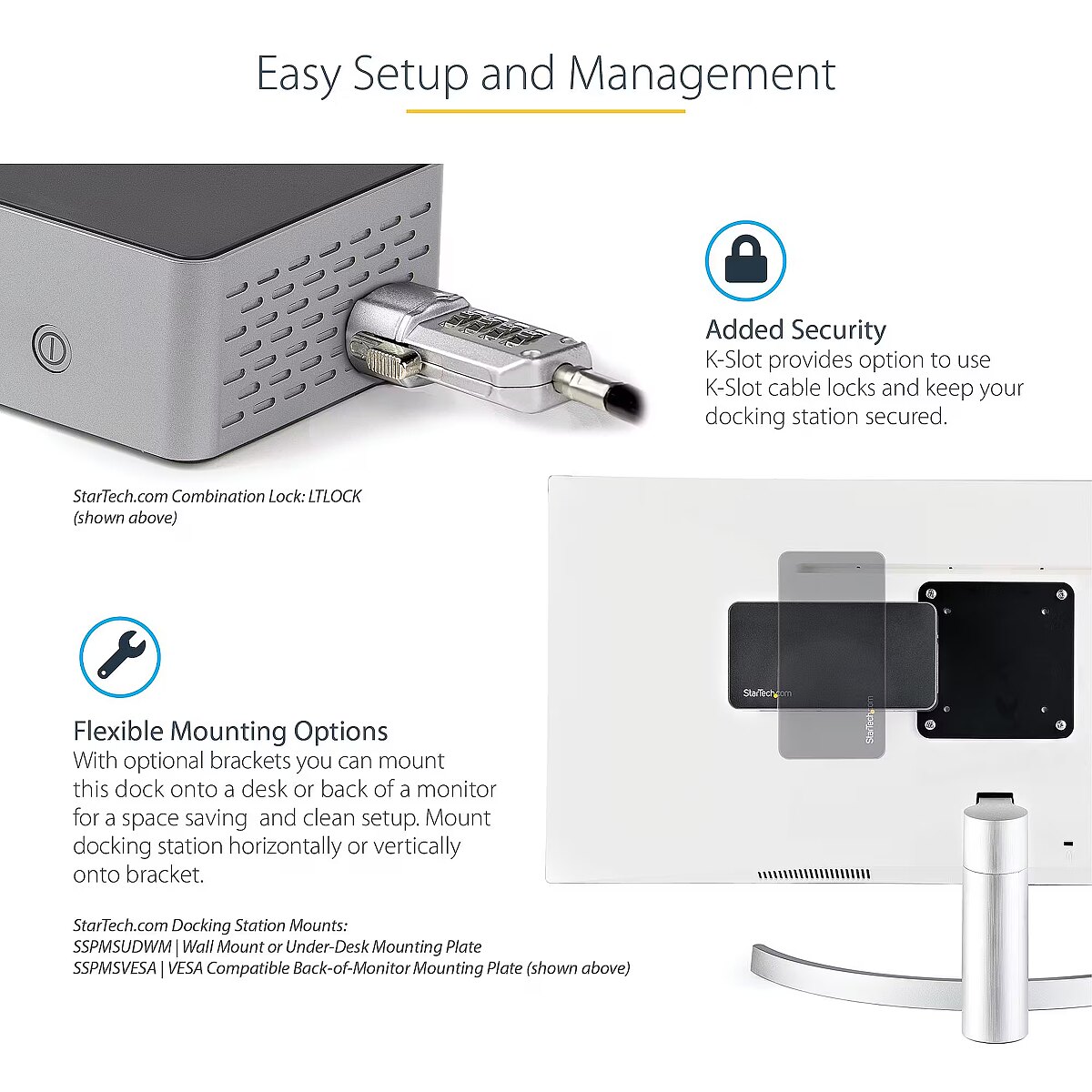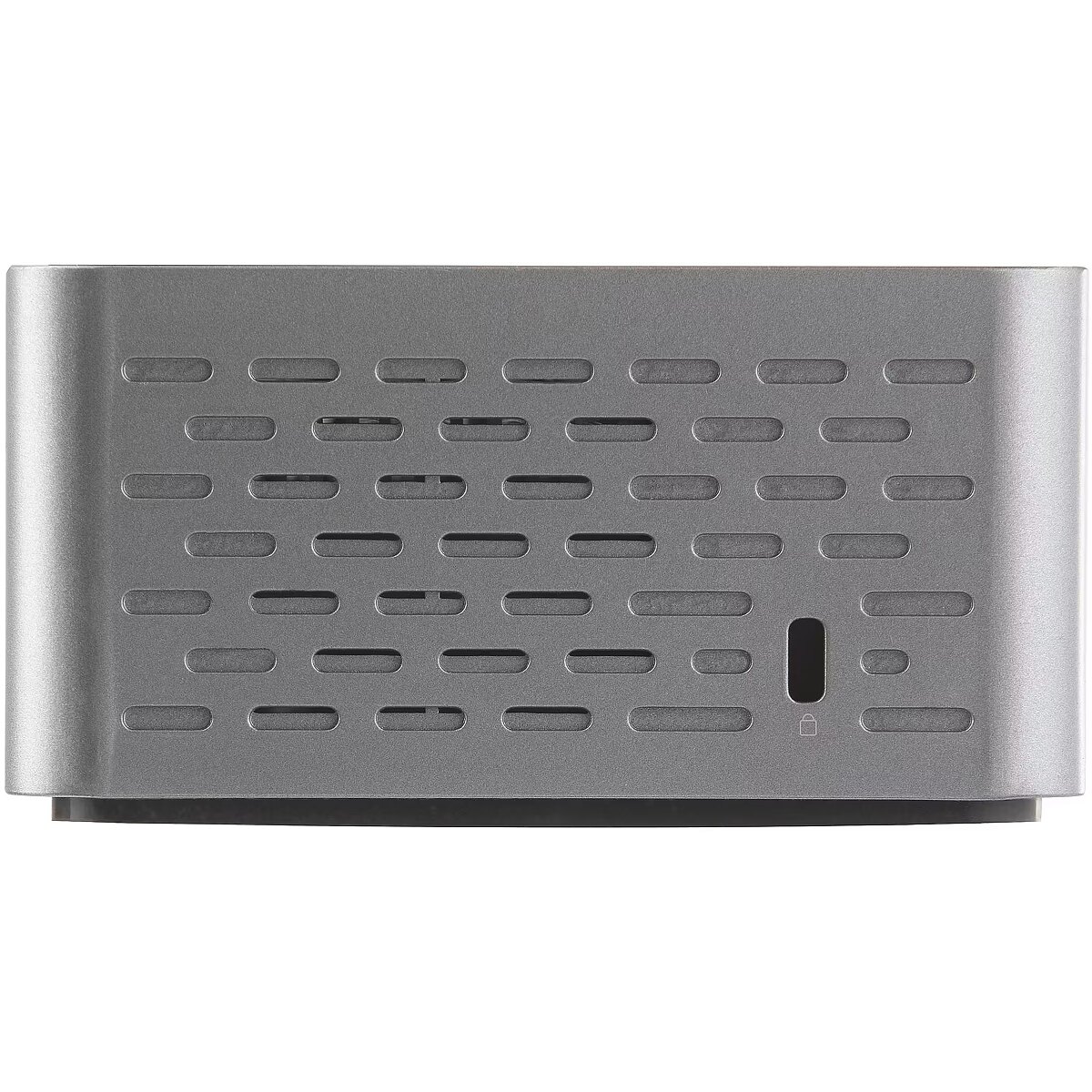 LongDesc - USB-C & USB-A Dock | USB 3.2 Gen 2 10Gbps | 4K 60HZ HDMI | 4K 60Hz DisplayPort | 100W Power DeliveryThis USB-C Gen 2 10Gbps docking station turns your USB-C ® or Thunderbolt™ 3 MacBook Pro, Windows laptop, and Chromebook into a powerful workstation. A USB 3.2 Gen 2 Type-C dock features everything you need, from quad HDMI or DisplayPort video outputs up to 4K 60 Hz to 10Gbps USB-C & USB-A downstream peripheral ports to 100W Power Delivery.HDMI & DisplayPort for Four Monitor OutputsThis USB-C Gen 2 docking station with DP 1.2 and HDMI 2.0 HDR support, is a perfect choice for dual, triple, or quad monitor setup, supporting up to quad 4K 60Hz display output, with any combination of four DisplayPort or HDMI video interfaces, on USB-C Gen 2 laptops, MacBooks (including M1 based systems) and Windows-based Thunderbolt 3 laptops.Display & Resolution Specs:Quad 4K DisplayPort | Up to 3840 x 2160p @ 60HzQuad 4K HDMI | Up to 3840 x 2160p @ 60HzQuad 4K (Mix of DP & HDMI) | Up to 3840 x 2160p @ 60HzDual 5K DisplayPort* | Up to 5120 × 2880Single 5K DisplayPort* | Up to 5120 × 2880 + Dual 4K HDMI/DisplayPort | Up to 3840 x 2160p @ 60Hz*Requires monitor support for 5K and uses two DP ports for one 5K display connectionPower & Charge with 100W Power DeliveryPower and charge USB-C/Thunderbolt 3 workstation laptops & ultrabooks with 100 watt PD. Higher power delivery, more than other USB-C 10Gbps quad monitor docks.Charge smartphones and other high powered devices with two downstream front-facing charging ports with BC 1.2 for USB-A and USB-C devices. Fast-charge ports support always-on charging so devices will charge whether or not a host laptop is connected.Plenty of Downstream USB PortsThis USB-C Gen 2 docking station features 4 downstream USB ports in total to connect USB peripherals.• 1x USB-C 3.2 Gen 2 (10 Gbps | 15W/3A)• 1x USB-A 3.2 Gen 1 (5 Gbps | 7.5W/1.5A)• 2x USB-A 3.2 Gen 1 (5 Gbps | 4.5W/0.9A)Also included, is a gigabit Ethernet port with PXE Boot and WoL support, as well as 4-position TRRS stereo audio headset/mic port.Additional Security FeaturesThis USB-C docking station comes with plenty of security features a K-slot for a Kensington style laptop lock and holes to mount the dock on the desk or wall and includes a USB-IF Certified 1m USB-C cable.Extra VentilationUSB-C dock features optimized ventilation on both ends and bottom side of dock to provide cooling support to higher temperature thermals that can be generated by high performance video/graphics applications and multiple 4K 60Hz video outputs.Enhance Productivity and Device Management with the StarTech.com Connectivity Tools ApplicationDeveloped to improve performance and security, StarTech.com Connectivity Tools is the only software suite on the market that works with a wide range of IT connectivity accessories. The software suite includes:•Advanced Windows Layout Utility : To setup and save custom windows layouts.•Mac Address Pass-Through Utility : To improve network security.•USB Event Monitoring Utility : To track and log connected USB devices•Wi-Fi Auto Switch Utility : Enabling users to quickly access faster network speeds via wired LAN.For more information and to download the StarTech.com Connectivity Tools application, please visit: www.StarTech.com/Connectivity-ToolsThe StarTech.com Advantage