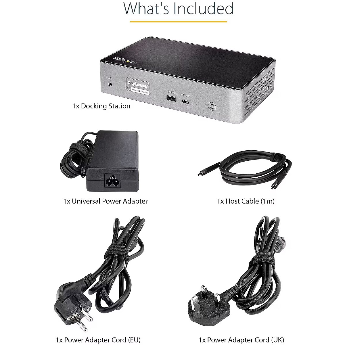 LongSummaryDescription - StarTech.com USB C Dock - 4K 60Hz Quad Monitor DisplayPort & HDMI - Universal USB-C Docking Station with 100W Power Delivery - USB Hub with 1x USB Type-C & 3x USB-A, Ethernet, Audio. Connectivity technology: Wired, Host interface: USB 3.2 Gen 2 (3.1 Gen 2) Type-C, USB Power Delivery up to: 100 W. Product colour: Black, Grey, Data transfer rate: 10 Gbit/s, Maximum digital resolution: 5120 x 2880 pixels. AC input voltage: 100 - 240 V, Output voltage: 20 V, Output current: 8.5 A. Windows operating systems supported: Windows 10 Education x64, Windows 10 Enterprise x64, Windows 10 Home x64, Windows 10 Pro x64,..., Mac operating systems supported: Mac OS X 10.14 Mojave, Mac OS X 10.15 Catalina, Mac OS X 10.15.3 Catalina, Mac OS X 11.0 Big Sur,..., Other operating systems supported: ChromeOS. Width: 90 mm, Depth: 215 mm, Height: 46 mm