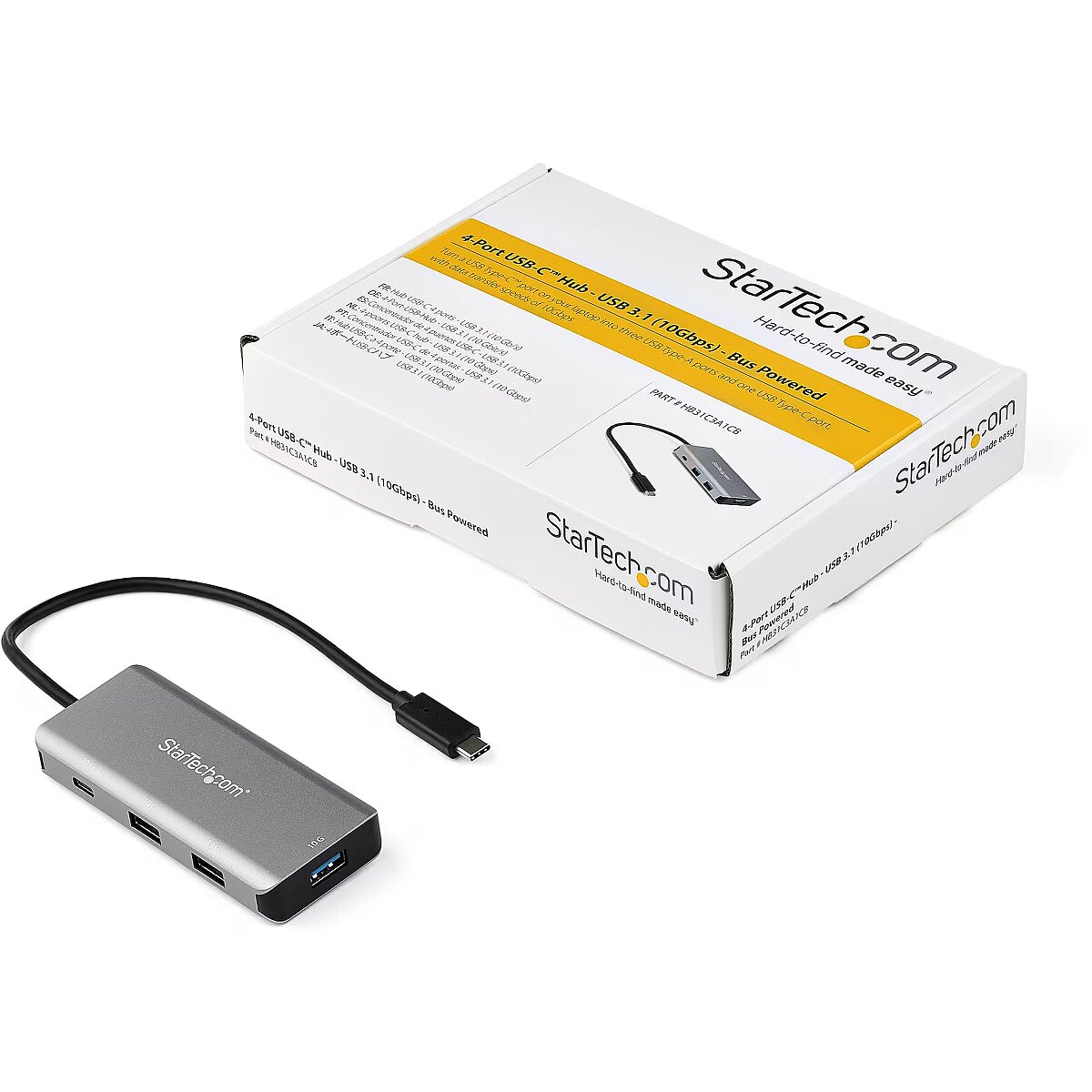 LongDesc - USB Type-C™ Hub | USB 3.2 Gen 2 | 25 cm Host Cable | Bus-Powered | Mac & Windows®Expand the connectivity of your USB-C™ laptop with this new generation USB-C Gen 2 hub offering 10Gbps supporting greater bandwidth to connected devices and faster data transfer speeds. This bus-powered 4-Port USB-C hub plugs into the USB Type-C™ or Thunderbolt™ 3 port on your device, adding one USB-C port and three USB-A ports, so you can quickly connect more USB devices.Convenient Portability and Easy SetupThis compact, lightweight USB Type-C hub is a convenient and portable addition to your laptop accessories. The USB-C cable is built-in, and hub is bus-powered, so it draws its power directly from your computer’s USB-C port, with no external power required. That means fewer cables to carry with you when you travel. The hub can draw up to 15 Watts of power from the connected host and operating multiple bus powered devices at one time with the total available power dependent on the connected host.The extended length attached cable of 9.8” (25 cm) provides more flexibility for longer reach connection requirements and plug and play installation.Connect Both USB-C & USB-A PeripheralsWith ports for both USB-C and USB-A peripherals, this hub is backwards compatible supporting both legacy and new USB devices. You can connect flash drives, video capture devices and external hard drives, with fast data transfer speeds of up to 10 Gbps. This 4-port USB Type-C hub enhances your productivity, giving you the connections you need while you work.HB31C3A1CB is backed by a StarTech.com 2-year warranty and free lifetime technical support.The StarTech.com Advantage