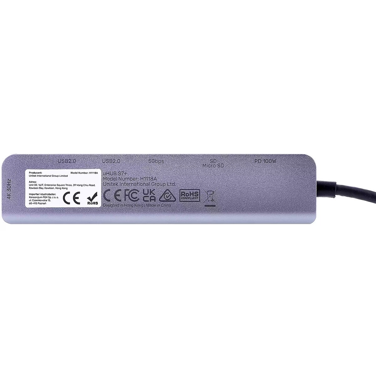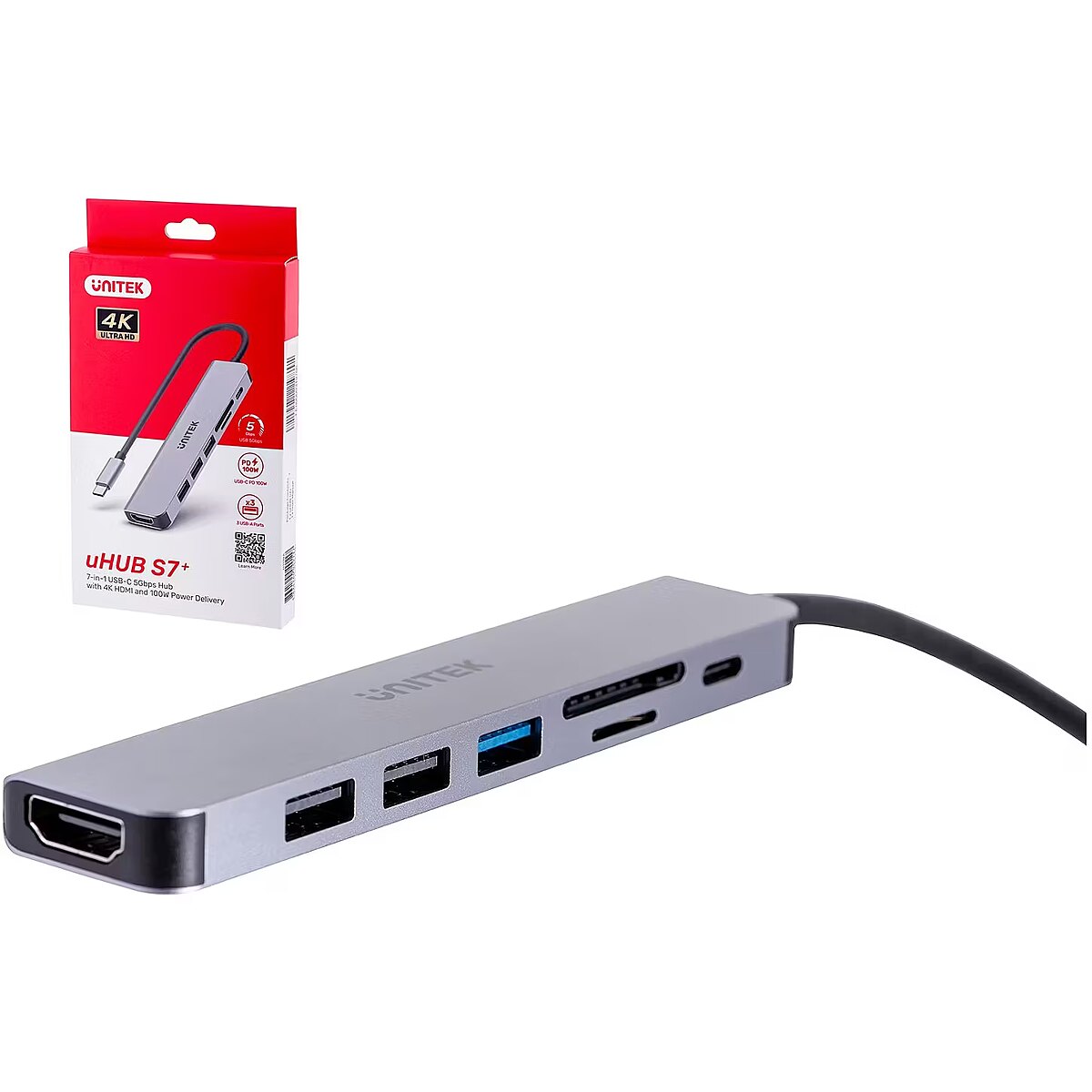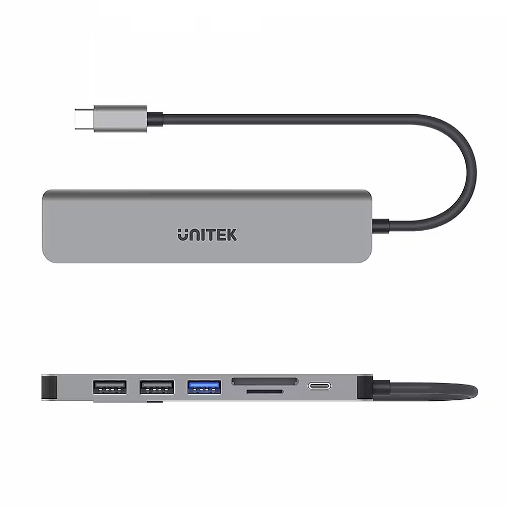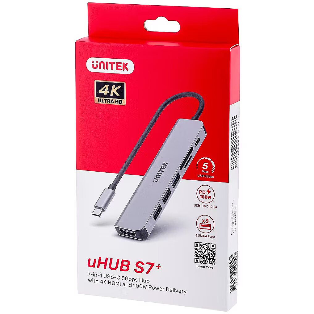 Description - USB hub with USB-C, HDMI, memory card reader and ultra-fast charging connector discover the huge possibilities of the uHUB S7+. Save space occupied by additional devices and enjoy the highest image and data transfer quality uHUB S7+ is a small, compact device that has everything you need! USB splitter from USB-C to USB-A Connect the Unitek uHUB S7+ USB hub to the USB-C port on any device and take advantage of additional possibilities. As a USB splitter, the uHUB S7+ model branches the USB-C connector into two USB 2.0 ports and one USB 3.0. No more wondering what to give up with this hub you can connect both a mouse and keyboard to your laptop and a fast data carrier at the same time. Unitek uHUB S7+ is a USB hub with a memory card adapter and HDMI connector In the model you will find two memory card slots, i.e. SD and Micro SD. It is also a USB hub with an HDMI connector. The HDMI output used in Unitek H1118A supports 4K resolution at a refresh rate of up to 30 Hz and transmits high-quality sound. Power Delivery 100W The hub is equipped with 100W Power Delivery technology, which means that you can efficiently charge your computer with a cable connected to the USB-C port on the hub. Even if you only have one USB C port on your ultrabook, you don't have to compromise and decide what is more important - the battery or additional functions. Materials The hub is made of matte aluminum and solid plastic, which well protect the electronics mounted inside. The integrated USB-C cable is 15 cm long.