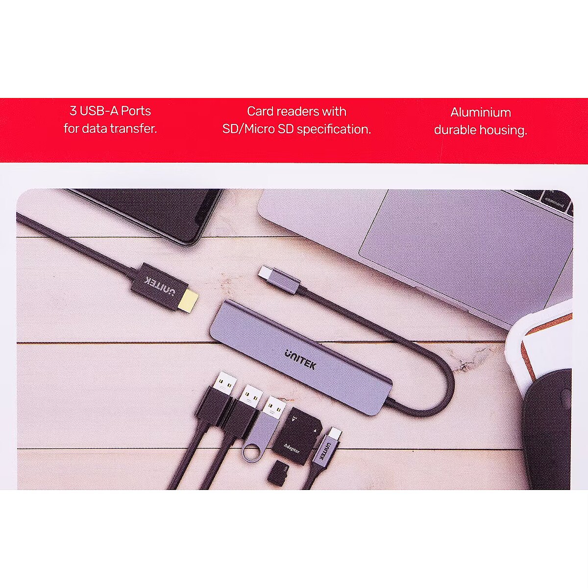 productName - UNITEK HUB USB-C H1118A; USB-A x3, USB-C, HDMI, SD, microSD
