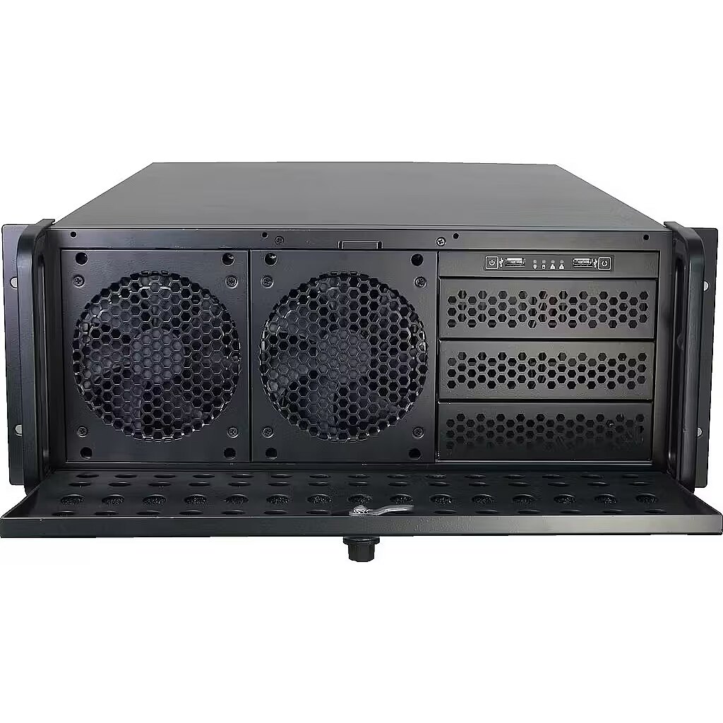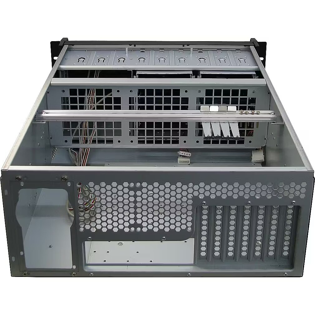 Technical_details - Type: Server Case Color: Black EAN: 4260133122611 Manufacturer number: 88887007 Design: Rack Mainboard form factor: E-ATX Material: 1.0-1.2mm steel Internal dimensions: ATX : 4 U Drive bays: 3 pieces : 10 pieces Slots: 7 pieces Front connectors: 1x USB-A 2.0, 1x USB-A 3.2 Gen 1 (5 Gbit/s) : The designation USB 3.2 Gen 1 corresponds to the former designation USB 3.1 Gen 1 / USB 3.0. Front: 2x 120 mm fans available, power switch, reset button, LED: power, hard drive activity, 2x network activity Rear: 2x 80mm fans available Notes: 3x 120 mm fans inside the case, lockable front flap with dust filter insert, drive cages can be removed and positioned as desired, 3.5" drives can be mounted without screws Accessories: keys, assortment of screws, mounting frame for mini-redundant power supplies, wrench for installing the spacers, mounting rails for 5.25" and 3.5" drives Dimensions: Width: 482mm x Height: 178mm x Depth: 695mm Weight: 13.2kg