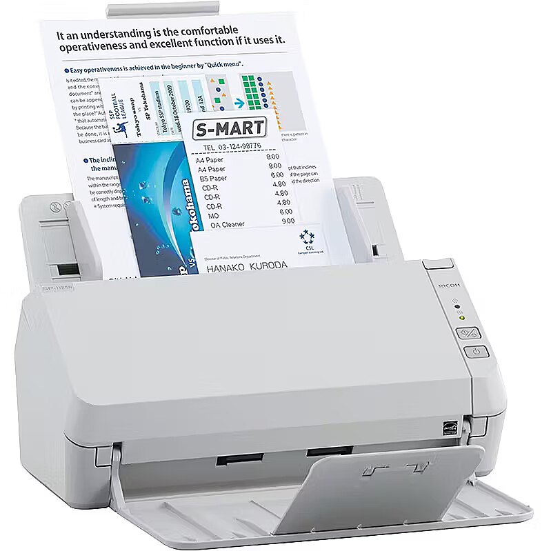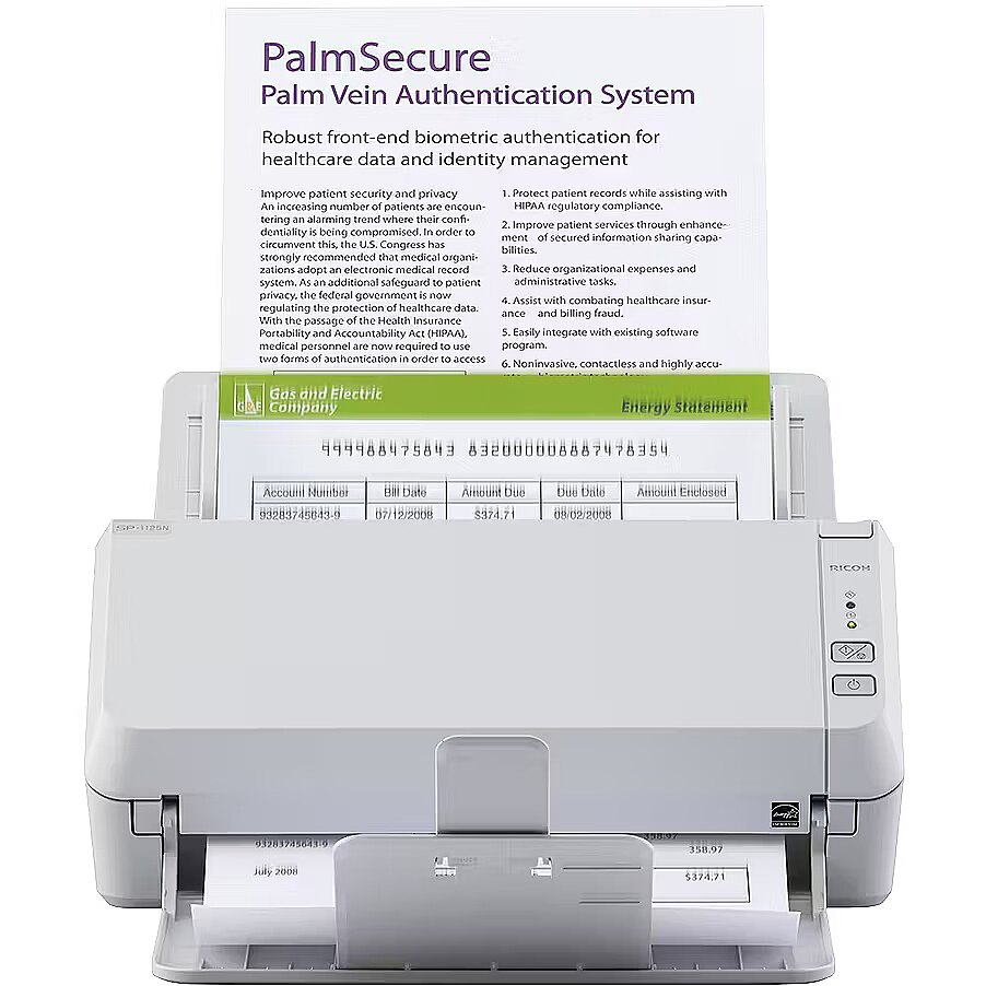 LongSummaryDescription - Ricoh SP-1125N. Maximum scan size: 210 x 297 mm, Optical scanning resolution: 600 x 600 DPI, Output colour depth: 24 bit. Scanner type: ADF scanner, Product colour: Grey. Sensor type: CMOS dual CIS, Light source: RGB LED, Scan file formats: PDF. Maximum ISO A-series paper size: A4. USB version: 3.2 Gen 1 (3.1 Gen 1)