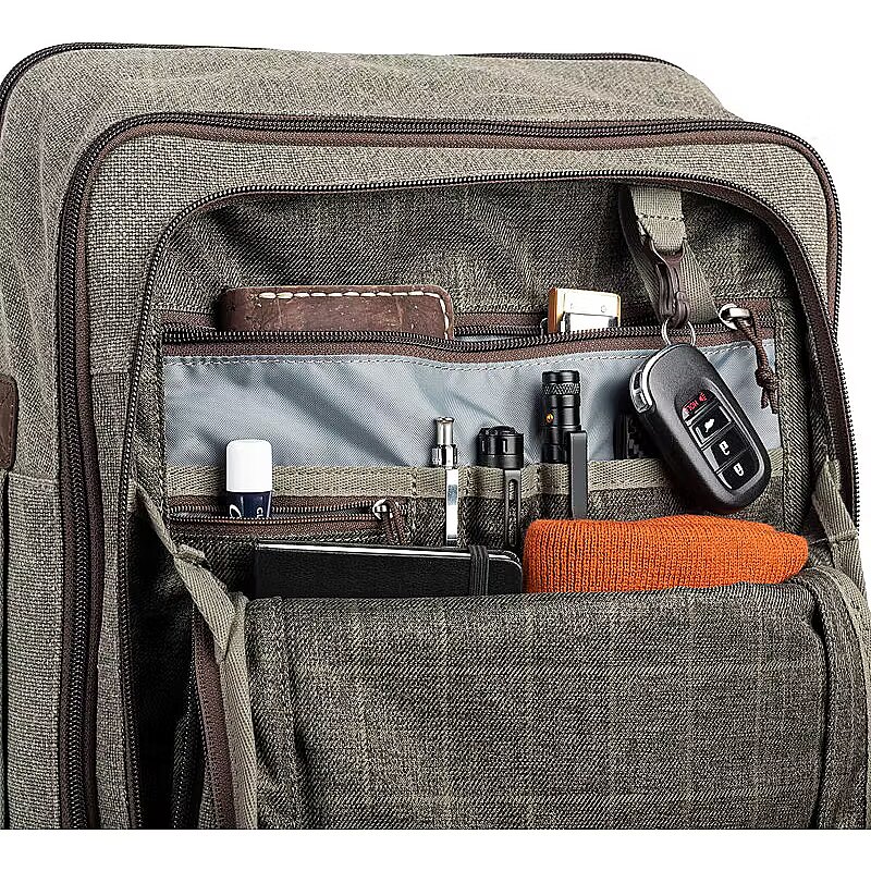 description_en - The Retrospective EDC is an “Everyday” backpack designed for commuters, travelers, and anyone who carries a laptop and essential accessories on a daily basis. Constructed with our distinguished stone-washed cotton canvas, two-tone liner, and genuine leather trim, the Retrospective EDC backpack offers versatile functionality, style and durability. The backpack features a padded laptop compartment, sectional main compartment, and deep front organizer pocket for maximum carry, yet with a slim profile. On-the-go commute and carry-on friendly Top opening for quick access to all compartments Slim profile eases maneuverability through crowds Quick-flip magnetic flap covers zippers for security and weather protection Stone-washed, weather-treated, 100% cotton canvas exterior with two-tone twill interior liner Genuine leather trim and zipper pulls Lockable YKK® zippers on all compartments Dedicated, padded laptop compartment fits a 16” Macbook Pro Main compartment sized to fit a pair of shoes, water bottle, and light jacket Main compartment features two mesh pockets and a Letter/A4-sized dedicated sleeve Deep, pleated front pocket with organizer panel, zippered interior pockets, and key lanyard Zippered phone pocket lined with microfiber fits plus-sized phones with cases Hidden phone/passport pocket in the back panel protects against thieves and allows you to feel phone vibration alerts Plush harness system with wrap-around air mesh-covered foam and removable sternum strap for all-day comfort Comfort-padded back panel Luggage handle pass-through (combine with top grab handle for extra stability) Three leather-trimmed grab handles on top and both sides for overhead bin and other transportation storage Water-resistant coating on all materials Seam-sealed rain cover included What fits in this bag? Laptop Sleeve: 16” Macbook Pro, 15” Wacom tablet Main Compartment: light jacket, commuter or workout shoes, letter-sized documents Front Organizer Pocket: EDC tech, personal, electronics Phone Pocket: plus-sized phones with protective case Hidden Pocket: passport or plus-sized phones with protective case